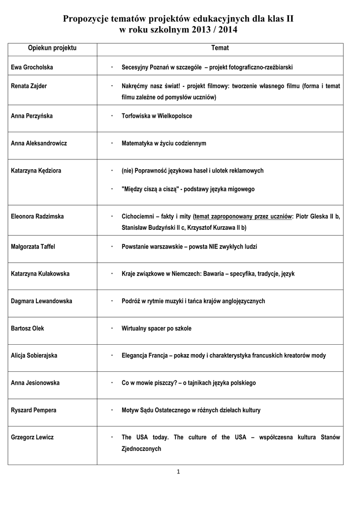 Propozycje tematów projektów edukacyjnych dla klas II w roku szkolnym 2013 / 2014 Opiekun projektu Temat Ewa Grocholska Secesyjny Poznań w szczególe – projekt fotograficzno-rzeźbiarski Renata Zajder Nakręćmy nasz świat! - projekt filmowy: tworzenie własnego filmu (forma i temat filmu zależne od pomysłów uczniów) Anna Perzyńska Torfowiska w Wielkopolsce Anna Aleksandrowicz Matematyka w życiu codziennym Katarzyna Kędziora (nie) Poprawność językowa haseł i ulotek reklamowych "Między ciszą a ciszą" - podstawy języka migowego Cichociemni – fakty i mity (temat zaproponowany przez uczniów: Piotr Gleska II b, Eleonora Radzimska Stanisław Budzyński II c, Krzysztof Kurzawa II b) Małgorzata Taffel Powstanie warszawskie – powsta NIE zwykłych ludzi Katarzyna Kułakowska Kraje związkowe w Niemczech: Bawaria – specyfika, tradycje, język Dagmara Lewandowska Podróż w rytmie muzyki i tańca krajów anglojęzycznych Bartosz Olek Wirtualny spacer po szkole Alicja Sobierajska Elegancja Francja – pokaz mody i charakterystyka francuskich kreatorów mody Anna Jesionowska Co w mowie piszczy? – o tajnikach języka polskiego Ryszard Pempera Motyw Sądu Ostatecznego w różnych dziełach kultury Grzegorz Lewicz The USA today. The culture of the USA – współczesna kultura Stanów Zjednoczonych 1 Dorota Makowska Ze sportem przez kontynenty (temat zaproponowany przez uczennice: Marta Wawrzyniak, Adrianna Gazecka, Agnieszka Zajączek, Łucja Koziorowska, – klasa II b, Patrycja Zastawa – klasa II a) Sylwia Obst Zmierzmy się ze szkołą! – tworzymy projekt sportowej szkoły przyszłości (makieta na podstawie pomiarów rzeczywistych wielkości obiektu) Dominik Hajduk Sport to moje życie! – prezentacja zawodników i uprawianych przez nich dyscyplin sportowych (projekt zaproponowany przez uczniów: Julian Lavrin II b, Jakub Szwedowicz II b, Jan Socha II a, Bartosz Łosiak II c) Jadwiga Jasińska Chemia w kosmetyce Anna Matysiak Konflikty polityczne i religijne w Afryce Północnej Emilia Kowalska Tworzenie pomocy dydaktycznych z prądu Krzysztof Marciniak 7 days erond Britain Monika Depa Seven World Wonders of a teenager (Siedem cudów świata nastolatka) Olga Jakubczyk Symetrie w otaczającym nas świecie Sławomir Zapotoczny Demokracja szlachecka – zalety i wady Wiktor Plust Dariusz Ciszak Dawid Lewicki 2