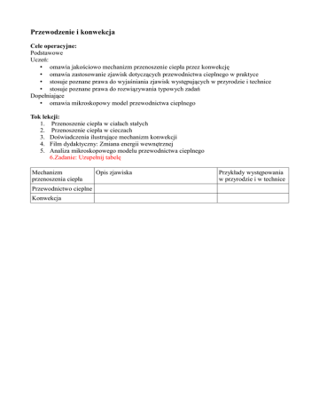 Przewodzenie i konwekcja Cele operacyjne: Podstawowe Uczeń: • omawia jakościowo mechanizm przenoszenie ciepła przez konwekcję • omawia zastosowanie zjawisk dotyczących przewodnictwa cieplnego w praktyce • stosuje poznane prawa do wyjaśniania zjawisk występujących w przyrodzie i technice • stosuje poznane prawa do rozwiązywania typowych zadań Dopełniające • omawia mikroskopowy model przewodnictwa cieplnego Tok lekcji: 1. Przenoszenie ciepła w ciałach stałych 2. Przenoszenie ciepła w cieczach 3. Doświadczenia ilustrujące mechanizm konwekcji 4. Film dydaktyczny: Zmiana energii wewnętrznej 5. Analiza mikroskopowego modelu przewodnictwa cieplnego 6.Zadanie: Uzupełnij tabelę Mechanizm przenoszenia ciepła Przewodnictwo cieplne Konwekcja Opis zjawiska Przykłady występowania w przyrodzie i w technice
