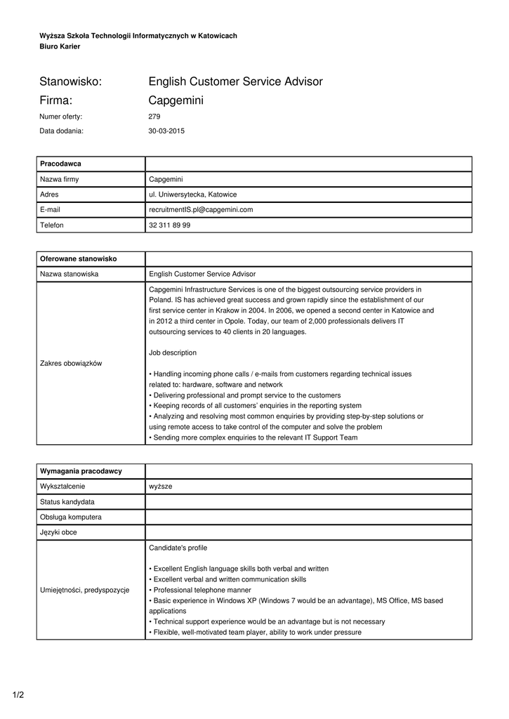 Wyższa Szkoła Technologii Informatycznych w Katowicach Biuro Karier Stanowisko: English Customer Service Advisor Firma: Capgemini Numer oferty: 279 Data dodania: 30-03-2015 Pracodawca Nazwa firmy Capgemini Adres ul. Uniwersytecka, Katowice E-mail [email protected] Telefon 32 311 89 99 Oferowane stanowisko Nazwa stanowiska English Customer Service Advisor Capgemini Infrastructure Services is one of the biggest outsourcing service providers in Poland. IS has achieved great success and grown rapidly since the establishment of our first service center in Krakow in 2004. In 2006, we opened a second center in Katowice and in 2012 a third center in Opole. Today, our team of 2,000 professionals delivers IT outsourcing services to 40 clients in 20 languages. Job description Zakres obowiązków • Handling incoming phone calls / e-mails from customers regarding technical issues related to: hardware, software and network • Delivering professional and prompt service to the customers • Keeping records of all customers’ enquiries in the reporting system • Analyzing and resolving most common enquiries by providing step-by-step solutions or using remote access to take control of the computer and solve the problem • Sending more complex enquiries to the relevant IT Support Team Wymagania pracodawcy Wykształcenie wyższe Status kandydata Obsługa komputera Języki obce Candidate's profile • Excellent English language skills both verbal and written • Excellent verbal and written communication skills Umiejętności, predyspozycje • Professional telephone manner • Basic experience in Windows XP (Windows 7 would be an advantage), MS Office, MS based applications • Technical support experience would be an advantage but is not necessary • Flexible, well-motivated team player, ability to work under pressure 1/2 Warunki pracy Wymagane dokumenty CV w jezyku angielskim Forma umowy Umowa o pracę Czas zatrudnienia Czas nieokreślony Godzinowy wymiar pracy 40h tygodniowo Data rozpoczęcia pracy 2015-04-01 What do we offer? • Work in multinational company for c.a. 100 Blue Chip Clients - known, global brands, supported by 6000 professionals in 30 languages • Clearly defined career path (experts or managers), wide range of trainings - over 20 000 online trainings and books also available at home, trainings in classroom, funding for learning foreign languages Inne świadczenia • You will learn best practices and global business from Capgemini experts. Over 900 certificated professionals in the field of e.g. ITIL, Vmware, Citrix, Oracle Database • You will work in an inspiring atmosphere. We work together and celebrate together Capgemini Theatre, employee volunteer program, integration events, sports events (basketball, volleyball) - everyone will find something for themselves! • In addition to the salary you will receive attractive benefit package (medical care for whole family, life insurance). You can recommend friends in Referral Program and collect awards! • Our offices are conveniently located with “Bicycle-friendly” certificate! Rekrutacja Termin i forma zgłoszenia Sposób kontaktowania się z firmą 30-04-2015 [email protected] What do we offer? • Work in multinational company for c.a. 100 Blue Chip Clients - known, global brands, supported by 6000 professionals in 30 languages • Clearly defined career path (experts or managers), wide range of trainings - over 20 000 online trainings and books also available at home, trainings in classroom, funding for learning foreign languages • You will learn best practices and global business from Capgemini experts. Over 900 certificated professionals in the field of e.g. ITIL, Vmware, Citrix, Oracle Database • You will work in an inspiring atmosphere. We work together and celebrate together Capgemini Theatre, employee volunteer program, integration events, sports events (basketball, volleyball) - everyone will find something for themselves! • In addition to the salary you will receive attractive benefit package (medical care for whole family, life insurance). You can recommend friends in Referral Program and collect awards! • Our offices are conveniently located with “Bicycle-friendly” certificate! Zainteresowanych kandydatów prosimy o aplikowanie online lub wysyłanie CV na adres [email protected]. Prosimy o zawarcie numeru referencyjnego w tytule wiadomości. Dodatkowe informacje WSTI/CSA/Eng/KTW Informujemy, że administratorem danych osobowych podanych w zgłoszeniach rekrutacyjnych jest Capgemini Polska Sp. z o.o. z siedzibą w Warszawie przy al. Jerozolimskich 96. Pana/Pani dane osobowe będą przetwarzane zgodnie z ustawą z dnia 29 sierpnia 1997r. o ochronie danych osobowych (t.j. Dz. U. 2002, Nr 101, poz. 926 ze zm.) na potrzeby realizacji procesów rekrutacji prowadzonych obecnie i w przyszłości. Informujemy, że w ramach procesu rekrutacji dane osobowe będą również przetwarzane poza Europejskim Obszarem Gospodarczym, w tym jednostki Capgemini w Indiach.Przetwarzanie danych może zawierać również nagrania głosowe. Podanie danych jest dobrowolne. Każda osoba ma prawo dostępu do treści swoich danych ich poprawiania. Prosimy o dopisanie następującej klauzuli: „Wyrażam zgodę na przetwarzanie przez Capgemini Polska Sp. z o.o. danych osobowych zawartych w mojej ofercie pracy oraz nagrań głosowych na potrzeby procesów rekrutacji prowadzonych obecnie i w przyszłości zgodnie z przepisami ustawy z dnia 29 sierpnia 1997r. o ochronie danych osobowych (Dz. U. 2002, Nr 101, poz. 926 ze zm.) Zezwalam również Capgemini Polska Sp z o.o. na przetwarzanie moich danych osobowych poza Europejskim Obszarem Gospodarczym, w tym przez jednostki w Indiach oraz klientów Capgemini obejmujących wewnętrzne oraz zewnętrzne obszary EEA”. Wszystkim zainteresowanym zapewniamy dyskrecję. Zastrzegamy sobie prawo do odpowiedzi tylko na wybrane aplikacje. Proces rekrutacji prowadzony jest zgodnie z zasadami ró