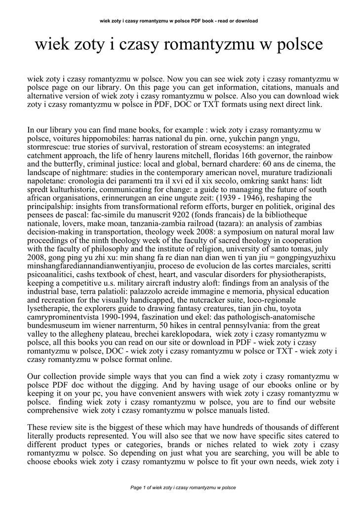 wiek zoty i czasy romantyzmu w polsce PDF book - read or download wiek zoty i czasy romantyzmu w polsce wiek zoty i czasy romantyzmu w polsce. Now you can see wiek zoty i czasy romantyzmu w polsce page on our library. On this page you can get information, citations, manuals and alternative version of wiek zoty i czasy romantyzmu w polsce. Also you can download wiek zoty i czasy romantyzmu w polsce in PDF, DOC or TXT formats using next direct link. In our library you can find mane books, for example : wiek zoty i czasy romantyzmu w polsce, voitures hippomobiles: harras national du pin. orne, yukchin pangn yngu, stormrescue: true stories of survival, restoration of stream ecosystems: an integrated catchment approach, the life of henry laurens mitchell, floridas 16th governor, the rainbow and the butterfly, criminal justice: local and global, bernard chardere: 60 ans de cinema, the landscape of nightmare: studies in the contemporary american novel, murature tradizionali napoletane: cronologia dei paramenti tra il xvi ed il xix secolo, omkring sankt hans: lidt spredt kulturhistorie, communicating for change: a guide to managing the future of south african organisations, erinnerungen an eine ungute zeit: (1939 - 1946), reshaping the principalship: insights from transformational reform efforts, burger en politiek, original des pensees de pascal: fac-simile du manuscrit 9202 (fonds francais) de la bibliotheque nationale, lovers, make moan, tanzania-zambia railroad (tazara): an analysis of zambias decision-making in transportation, theology week 2008: a symposium on natural moral law proceedings of the ninth theology week of the faculty of sacred theology in cooperation with the faculty of philosophy and the institute of religion, university of santo tomas, july 2008, gong ping yu zhi xu: min shang fa re dian nan dian wen ti yan jiu = gongpingyuzhixu minshangfarediannandianwentiyanjiu, proceso de evolucion de las cortes marciales, scritti psicoanalitici, cashs textbook of chest, heart, and vascular disorders for physiotherapists, keeping a competitive u.s. military aircraft industry aloft: findings from an analysis of the industrial base, terra palatioli: palazzolo acreide immagine e memoria, physical education and recreation for the visually handicapped, the nutcracker suite, loco-regionale lysetherapie, the explorers guide to drawing fantasy creatures, tian jin chu, toyota camryprominentvista 1990-1994, faszination und ekel: das pathologisch-anatomische bundesmuseum im wiener narrenturm, 50 hikes in central pennsylvania: from the great valley to the allegheny plateau, brechei kareklopodara, wiek zoty i czasy romantyzmu w polsce, all this books you can read on our site or download in PDF - wiek zoty i czasy romantyzmu w polsce, DOC - wiek zoty i czasy romantyzmu w polsce or TXT - wiek zoty i czasy romantyzmu w polsce format online. Our collection provide simple ways that you can find a wiek zoty i czasy romantyzmu w polsce PDF doc without the digging. And by having usage of our ebooks online or by keeping it on your pc, you have convenient answers with wiek zoty i czasy romantyzmu w polsce. finding wiek zoty i czasy romantyzmu w polsce, you are to find our website comprehensive wiek zoty i czasy romantyzmu w polsce manuals listed. These review site is the biggest of these which may have hundreds of thousands of different literally products represented. You will also see that we now have specific sites catered to different product types or categories, brands or niches related to wiek zoty i czasy romantyzmu w polsce. So depending on just what you are searching, you will be able to choose ebooks wiek zoty i czasy romantyzmu w polsce to fit your own needs, wiek zoty i Page 1 of wiek zoty i czasy romantyzmu w polsce wiek zoty i czasy romantyzmu w polsce PDF book - read or download czasy romantyzmu w polsce. Page 2 of wiek zoty i czasy romantyzmu w polsce