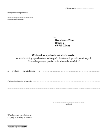 Zduny, dnia ................................ ............................................... (Imię i nazwisko podatnika) ............................................... (Adres zamieszkania) .............................................. Do Burmistrza Zdun Rynek 2 63-760 Zduny Wniosek o wydanie zaświadczenia: o wielkości gospodarstwa rolnego/o hektarach przeliczeniowych /inne dotyczące posiadania nieruchomości (* o wydanie zaświadczenia o ……………………………….…………………………………… ……………………………………………………………………………………………………................. Cel wydania zaświadczenia: ………………………………………………………………………………... ......................................................................................................................................................................... .......................................................................................................................................................................... .......................................................... (podpis) W załączeniu przedkładam: - opłatę skarbową w kwocie: …….. ( *zaznaczyć właściwe