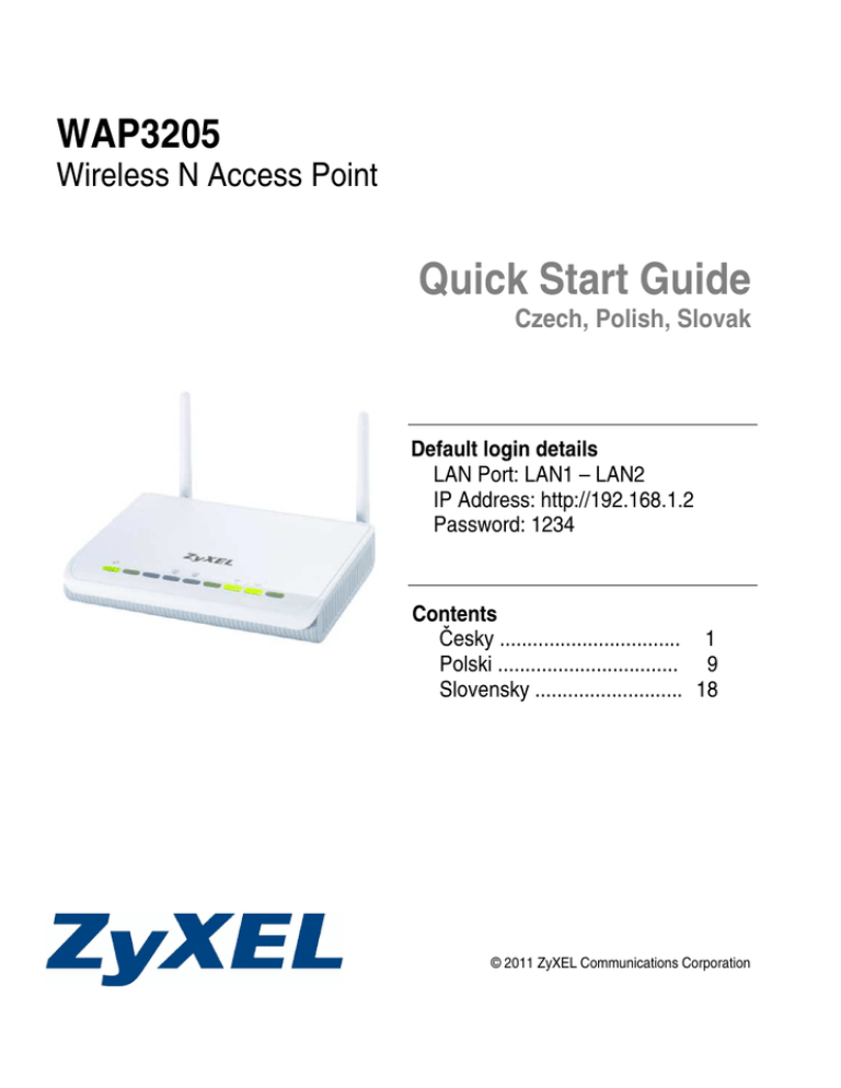 WAP3205 Wireless N Access Point Quick Start Guide Czech, Polish, Slovak Default login details LAN Port: LAN1 – LAN2 IP Address: http://192.168.1.2 Password: 1234 Contents Česky ................................. 1 Polski ................................. 9 Slovensky ........................... 18 © 2011 ZyXEL Communications Corporation ČESKY Obsah 1 Hardwarové připojení ........................................................................................................... 2 2 Nastavení bezdrátové sítě pomocí technologie WPS ....................................................... 3 3 Nastavení bezdrátové sítě pomocí webového konfigurátoru........................................... 4 Kde jsou k nahlédnutí certifikace výrobku 1. Přejděte na adresu http://www.zyxel.com/. 2. Na domovské stránce ZyXEL zvolte přístroj ze stahovacího seznamu. 3. Otevřete požadovanou certifikaci. 1 ČESKY 1 Hardwarové připojení 2 ČESKY 2 Nastavení bezdrátové sítě pomocí technologie WPS Technologie Wi-Fi Protected Setup (WPS) slouží k nastavení bezpečného přístupu bezdrátových zařízení k přístroji WAP3205. # 1 Umístěte bezdrátové zařízení (B), které podporuje WPS, v dosahu přístroje WAP3205. 2 Stiskněte tlačítko WPS na přístroji WAP3205 na 2 až 3 sekundy. Kontrolka WPS ( ) na přístroji WAP3205 bude blikat. 3 Stiskněte tlačítko WPS na bezdrátovém zařízení (B) do 2 minut od okamžiku, kdy jste stiskli tlačítko WPS na přístroji WAP3205. 4 Úspěšné zakončení nastavení bude indikováno trvale rozsvícenou kontrolkou ( ) na přístroji WAP3205. Jestliže se vám nastavení pomocí WPS nepodařilo, nebo pokud druhé zařízení nepodporuje technologii WPS, přejděte na další kapitolu. 3 ČESKY 3 Nastavení bezdrátové sítě pomocí webového konfigurátoru 1 Nastavte IP adresu počítače na hodnotu mezi 192.168.1.3 a 192.168.1.254 a masku podsítě na 255.255.255.0. Připojte počítač k přístroji WAP3205. 2 Otevřete webový prohlížeč na počítači, který je připojen k WAP3205. Do adresové řádky zadejte adresu „http://192.168.1.2“. 3 Zadejte výchozí heslo „1234“, zvolte komunikační jazyk (Language) a klikněte na Login (přihlásit). 4 Zadejte nové heslo (do druhého řádku ho zadejte znovu kvůli ověření) a klikněte na Apply (použít). 4 ČESKY 5 Při prvním otevření webového konfigurátoru se automaticky objeví obrazovka průvodce nastavením. 6 Na této obrazovce změňte výchozí heslo pro přístup k webovému konfigurátoru. Zadejte nové heslo (max. 30 tisknutelných znaků bez mezer). Zadejte heslo znovu pro ověření do pole Verify Password (potvrzení hesla). Klikněte na Next (další). 7 Zvolte provozní režim přístroje WAP3205 a klikněte na Next (další). 8 Proveďte konfiguraci bezdrátové sítě a jejího zabezpečení. Údaje na obrazovce se liší podle zvoleného provozního režimu. 5 ČESKY • Jestliže jste nastavili provozní režim Universal Repeater Mode (univerzální opakovací režim), pracuje WAP3205 jako přístupový bod a současně jako bezdrátový klient. Zvolte bezdrátovou síť, ke které se chcete připojit, a klikněte na Connect (připojit). Na další obrazovce nastavte přístupové údaje, které vyžaduje zvolená bezdrátová síť. Pro provedení nastavení klikněte na Next (další). Zaškrtnutím políčka Use the same security settings as those for the existing network (použít stejné bezpečnostní nastavení jako u stávající sítě) dáte přístroji WAP3205 pokyn, aby při komunikaci s bezdrátovými klienty používal stejné nastavení zabezpečení jako stávající síť. Můžete také zadat jméno sítě (SSID). Klikněte na Next (další). 6 ČESKY • Jestliže jste zvolili provozní režim AP Mode (přístupový bod), pojmenujte nejprve novou síť v políčku Wireless Network Name (SSID). V políčku Security Mode (režim zabezpečení) zvolte nejsilnější zabezpečení, které podporují všechna zařízení na síti. Klikněte na Next (další). • Jestliže jste zvolili provozní režim Client (klient), zvolte bezdrátovou síť, ke které se chcete připojit, a klikněte na Connect (připojit). Na další obrazovce nastavte přístupové údaje, které vyžaduje zvolená bezdrátová síť. Pro provedení nastavení klikněte na Next (další). 7 ČESKY 9 Kliknutím na GO (restartovat) ukončete průvodce nastavením. 10 Přístroj WAP3205 se restartuje. Objeví se přihlašovací obrazovka webového konfigurátoru. Když se přihlásíte, můžete provést pokročilé nastavení parametrů. Více informací naleznete v Uživatelské příručce na přiloženém CD disku. 8 POLSKI SPIS TREŚCI 1 Połączenia sprzętowe ........................................................................................................ 10 2 Konfigurowanie sieci bezprzewodowej za pomocą WPS ............................................... 11 3 Konfigurowanie sieci bezprzewodowej za pomocą programu konfiguracyjnego ....... 12 9 POLSKI 1 Połączenia sprzętowe Zanim użyjesz punktu dostępowego WAP3205, zdejmij z niego wszystkie plastikowe opakowania. 10 POLSKI 2 Konfigurowanie sieci bezprzewodowej za pomocą WPS Użyj funkcji Wi-Fi Protected Setup (WPS), aby bezpiecznie połączyć urządzenia bezprzewodowe z punktem dostępowym WAP3205. # 1 Umieść urządzenie bezprzewodowe (B) w zasięgu punktu dostępowego WAP3205 (A). 2 Naciśnij i przytrzymaj przez dwie do trzech sekund przycisk WPS na punkcie dostępowym WAP3205. Wskaźnik WPS ) na punkcie dostępowym WAP3205 ( zacznie migać. 3 Naciśnij przycisk WPS na urządzeniu bezprzewodowym w ciągu dwóch minut od naciśnięcia przycisku na punkcie dostępowym WAP3205. 4 Po zakończeniu procesu konfiguracji WPS wskaźnik WPS ( ) na punkcie dostępowym zapala się na stałe. Jeśli funkcja WPS nie zadziała lub urządzenie bezprzewodowe nie obsługuje WPS, przejdź do