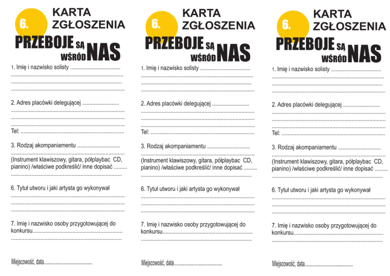 6. KARTA ZG£OSZENIA PRZEBOJE S¥ WŒRÓD NAS 6. KARTA ZG£OSZENIA PRZEBOJE S¥ WŒRÓD NAS 6. KARTA ZG£OSZENIA PRZEBOJE S¥ WŒRÓD NAS 1. Imiê i nazwisko solisty .................................. 1. Imiê i nazwisko solisty .................................. ............................................................................ ........................................................................... ............................................................................. 1. Imiê i nazwisko solisty .................................. ............................................................................ ........................................................................... ............................................................................. ............................................................................ ........................................................................... ............................................................................. 2. Adres placówki deleguj¹cej ......................... ............................................................................. ............................................................................. ............................................................................. Tel: ...................................................................... 2. Adres placówki deleguj¹cej ......................... ............................................................................. ............................................................................. ............................................................................. Tel: ...................................................................... 2. Adres placówki deleguj¹cej ......................... ............................................................................. ............................................................................. ............................................................................. Tel: ...................................................................... 3. Rodzaj akompaniamentu ............................. ............................................................................. (Instrument klawiszowy, gitara, pó³playbac CD, pianino) /w³aœciwe podkreœliæ/ inne dopisaæ ......... ........................................................................... 3. Rodzaj akompaniamentu ............................. ............................................................................. (Instrument klawiszowy, gitara, pó³playbac CD, pianino) /w³aœciwe podkreœliæ/ inne dopisaæ ......... ........................................................................... 3. Rodzaj akompaniamentu ............................. ............................................................................. (Instrument klawiszowy, gitara, pó³playbac CD, pianino) /w³aœciwe podkreœliæ/ inne dopisaæ ......... ........................................................................... 6. Tytu³ utworu i jaki artysta go wykonywa³ ............................................................................. ............................................................................. ............................................................................. 6. Tytu³ utworu i jaki artysta go wykonywa³ ............................................................................. ............................................................................. ............................................................................. 6. Tytu³ utworu i jaki artysta go wykonywa³ ............................................................................. ............................................................................. ............................................................................. 7. Imiê i nazwisko osoby przygotowuj¹cej do konkursu............................................................. ........................................................................... 7. Imiê i nazwisko osoby przygotowuj¹cej do konkursu............................................................. ........................................................................... 7. Imiê i nazwisko osoby przygotowuj¹cej do konkursu............................................................. ........................................................................... Miejscowoœæ, data............................................ Miejscowoœæ, data............................................ Miejscowoœæ, data............................................