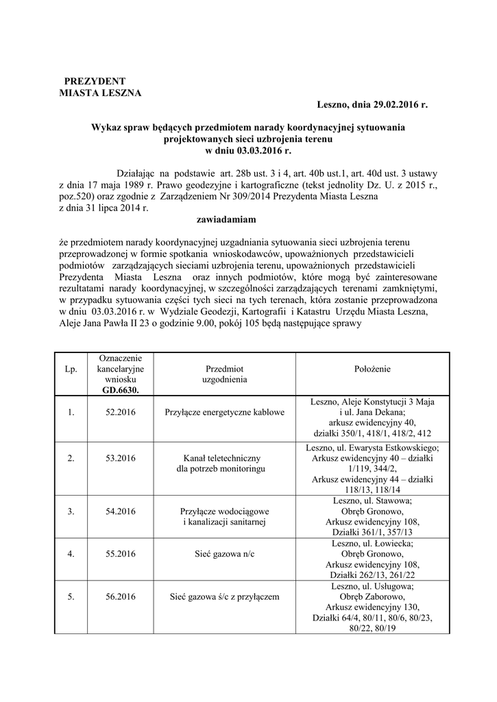 PREZYDENT MIASTA LESZNA Leszno, dnia 29.02.2016 r. Wykaz spraw będących przedmiotem narady koordynacyjnej sytuowania projektowanych sieci uzbrojenia terenu w dniu 03.03.2016 r. Działając na podstawie art. 28b ust. 3 i 4, art. 40b ust.1, art. 40d ust. 3 ustawy z dnia 17 maja 1989 r. Prawo geodezyjne i kartograficzne (tekst jednolity Dz. U. z 2015 r., poz.520) oraz zgodnie z Zarządzeniem Nr 309/2014 Prezydenta Miasta Leszna z dnia 31 lipca 2014 r. zawiadamiam że przedmiotem narady koordynacyjnej uzgadniania sytuowania sieci uzbrojenia terenu przeprowadzonej w formie spotkania wnioskodawców, upoważnionych przedstawicieli podmiotów zarządzających sieciami uzbrojenia terenu, upoważnionych przedstawicieli Prezydenta Miasta Leszna oraz innych podmiotów, które mogą być zainteresowane rezultatami narady koordynacyjnej, w szczególności zarządzających terenami zamkniętymi, w przypadku sytuowania części tych sieci na tych terenach, która zostanie przeprowadzona w dniu 03.03.2016 r. w Wydziale Geodezji, Kartografii i Katastru Urzędu Miasta Leszna, Aleje Jana Pawła II 23 o godzinie 9.00, pokój 105 będą następujące sprawy Oznaczenie kancelaryjne wniosku GD.6630. Przedmiot uzgodnienia 1. 52.2016 Przyłącze energetyczne kablowe 2. 53.2016 3. 54.2016 Przyłącze wodociągowe i kanalizacji sanitarnej 4. 55.2016 Sieć gazowa n/c 5. 56.2016 Sieć gazowa ś/c z przyłączem Lp. Kanał teletechniczny dla potrzeb monitoringu Położenie Leszno, Aleje Konstytucji 3 Maja i ul. Jana Dekana; arkusz ewidencyjny 40, działki 350/1, 418/1, 418/2, 412 Leszno, ul. Ewarysta Estkowskiego; Arkusz ewidencyjny 40 – działki 1/119, 344/2, Arkusz ewidencyjny 44 – działki 118/13, 118/14 Leszno, ul. Stawowa; Obręb Gronowo, Arkusz ewidencyjny 108, Działki 361/1, 357/13 Leszno, ul. Łowiecka; Obręb Gronowo, Arkusz ewidencyjny 108, Działki 262/13, 261/22 Leszno, ul. Usługowa; Obręb Zaborowo, Arkusz ewidencyjny 130, Działki 64/4, 80/11, 80/6, 80/23, 80/22, 80/19 6. 57.2016 Przyłącza gazowe 7. 58.2016 Przyłącza gazowe 8. 59.2016 Przyłącze energetyczne kablowe 9. 60.2016 Przyłącze energetyczne kablowe 10. 62.2016 Sieć gazowa ś/c z przyłączem 11. 63.2016 Odcinek sieci telekomunikacyjnej 12. 64.2016 Przyłącze telekomunikacyjne 13. 65.2016 Sieć wodociągowa i kanalizacji sanitarnej 14. 66.2016 Przyłącze wodociągowe i kanalizacji sanitarnej 15. 67.2016 Przyłącze wodociągowe i kanalizacji sanitarnej Leszno, ul. Leszczynowa; Arkusz ewidencyjny 24, Działki 5/133, 5/159 Leszno, ul. Łowiecka; Obręb Gronowo, Arkusz ewidencyjny 108, Działki 261/22, 261/14, 261/15, 261/16, 261/17, 261/18, 261/19, 261/20, 261/22 Leszno, ul. Francuska i Belgijska; Arkusz ewidencyjny 31, Działki 26, 27/4 Leszno, ul. Grecka; Arkusz ewidencyjny 40, Działki 1/283, 1/281 Leszno, ul. Usługowa; Obręb Zaborowo, Arkusz ewidencyjny 129 – działka 1289/4, arkusz ewidencyjny 131 – działki 88/6, 93/7, 93/8, 93/17 Leszno, ul. Obrońców Zbaraża i Juranda; Obręb Gronowo, Arkusz ewidencyjny 106, Działki 230/3, 230/5, 230/8 Leszno, ul. Tadeusza Rejtana; Obręb Zaborowo, Arkusz ewidencyjny 125, Działki 17/21, 12/46, 14/6, 1302/1 Leszno, ul. Łowiecka; Obręb Gronowo, Arkusz ewidencyjny 108, Działki 262/13, 261/22 Leszno, ul. Osiecka 43; Arkusz ewidencyjny 26, Działki 3/8, 2 Leszno, ul. Wiejska; Obręb Strzyżewice, Arkusz ewidencyjny 146, Działki 6/4, 6/9 Z up. PREZYDENTA MIASTA LESZNA Naczelnik Wydziału Geodezji, Kartografii i Katastru Geodeta Powiatowy Kazimierz Narloch