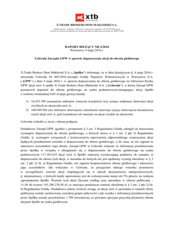 X-TRADE BROKERS DOM MAKLERSKI S.A. (spółka akcyjna z siedzibą w Warszawie i adresem ul. Ogrodowa 58, 00-876 Warszawa, wpisana do rejestru przedsiębiorców Krajowego Rejestru Sądowego pod numerem 0000217580) RAPORT BIEŻĄCY NR 4/2016 Warszawa, 4 maja 2016 r. Uchwała Zarządu GPW w sprawie dopuszczenia akcji do obrotu giełdowego X-Trade Brokers Dom Maklerski S.A. („Spółka”) informuje, że w dniu dzisiejszym tj. 4 maja 2016 r. otrzymała Uchwałę Nr 405/2016 Zarządu Giełdy Papierów Wartościowych w Warszawie S.A. („GPW”) z dnia 4 maja 2016 r. w sprawie dopuszczenia do obrotu giełdowego na Głównym Rynku GPW akcji serii A spółki X-Trade Brokers Dom Maklerski S.A. („Uchwała”), w której Zarząd GPW postanowił dopuścić do obrotu giełdowego na rynku podstawowym następujące akcje Spółki o wartości nominalnej 0,05 zł (pięć groszy) każda: 1) 16.433.709 (szesnaście milionów czterysta trzydzieści trzy tysiące siedemset dziewięć) akcji zwykłych na okaziciela serii A; 2) 100.949.926 (sto milionów dziewięćset czterdzieści dziewięć tysięcy dziewięćset dwadzieścia sześć) akcji serii A, pod warunkiem ich zamiany na akcje zwykłe na okaziciela. Uchwała wchodzi w życie z dniem podjęcia. Dodatkowo Zarząd GPW zgodnie z przepisami § 3 ust. 3 Regulaminu Giełdy odstąpił od stosowania wymogów dopuszczenia do obrotu giełdowego, o których mowa w § 3 ust. 2 pkt 2) Regulaminu Giełdy, tj. wymogów związanych z koniecznością zapewnienia odpowiedniego rozproszenia akcji będących przedmiotem wniosku o dopuszczenie do obrotu giełdowego, o ile uzna, że nie zagraża to interesowi uczestników tego obrotu. Zarząd GPW w Uchwale wskazał, że informacje przedstawione przez Spółkę w związku z ubieganiem się o dopuszczenie do obrotu giełdowego na rynku podstawowym 117.383.635 akcji serii A Spółki stanowią wystarczającą podstawę do uznania, iż dopuszczenie do obrotu tych akcji, w stosunku do których nie jest spełniony wymóg określony w § 3 ust. 2 pkt 2) lit. a) Regulaminu Giełdy, nie zagraża bezpieczeństwu obrotu giełdowego i interesowi jego uczestników. Jak wskazano w Uchwale, za przyjęciem takiego wniosku przemawia w szczególności wartość akcji znajdujących się w rękach akcjonariuszy mniejszościowych, tj. akcjonariuszy, z których każdy uprawniony jest do wykonywania mniej niż 5% głosów na walnym zgromadzeniu Spółki. Wartość tych akcji (liczona według ceny sprzedaży w ofercie publicznej – 11,50 zł) wynosi 191.296.278,50 zł, co znacząco przekracza wartość określoną w § 3 ust. 2 pkt 2) lit. b) Regulaminu Giełdy. Dodatkowo należy zwrócić uwagę, że akcje serii A sprzedane w ramach oferty publicznej zostały zaoferowane szerokiej grupie nabywców i jak wynika z informacji przedstawionych przez Spółkę zostały przydzielone 1.789 inwestorom, co powinno sprzyjać przyszłej płynności obrotu akcjami Spółki na rynku giełdowym. Podstawa prawna: Art. 56 ust. 1 pkt 2 lit. a) Ustawy z dnia 29 lipca 2005 r. o ofercie publicznej i warunkach wprowadzania instrumentów finansowych do zorganizowanego systemu obrotu oraz o spółkach publicznych oraz §34 ust. 1 pkt 2 Rozporządzenia Ministra Finansów z dnia 19 lutego 2009 r. w sprawie informacji bieżących i okresowych przekazywanych przez emitentów papierów wartościowych oraz warunków uznawania za równoważne informacji wymaganych przepisami prawa państwa niebędącego państwem członkowskim.