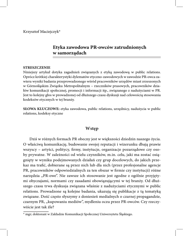 Krzysztof Maciejczyk* Etyka zawodowa PR-owców zatrudnionych w samorządach STRESZCZENIE Niniejszy artykuł dotyka zagadnień związanych z etyką zawodową w public relations. Oprócz krótkiej charakterystyki dylematów etyczno-zawodowych w zawodzie PR-owca zawiera wyniki badania przeprowadzonego wśród pracowników urzędów miast zrzeszonych w Górnośląskim Związku Metropolitalnym – rzeczników prasowych, pracowników działów komunikacji społecznej, promocji i informacji itp., związanego z nadużyciami w PR. Jest to kolejny głos w prowadzonej od dłuższego czasu dyskusji nad celowością stosowania kodeksów etycznych w tej branży. SŁOWA KLUCZOWE: etyka zawodowa, public relations, urzędnicy, nadużycia w public relations, kodeksy etyczne Wstęp Dziś w różnych formach PR obecny jest w większości dziedzin naszego życia. O właściwą komunikację, budowanie swojej reputacji i wizerunku dbają prawie wszyscy – artyści, politycy, firmy, instytucje, organizacje pozarządowe czy osoby prywatne. W zależności od wielu czynników, m.in. celu, jaki ma zostać osiągnięty w wyniku podejmowanych działań czy grup docelowych, do jakich przekaz ma trafić, dobierane są przez nich lub dla nich (przez profesjonalne agencje PR, pracowników odpowiedzialnych za ten obszar w firmie czy instytucji) różne narzędzia „PR-owe”. Nie zawsze ich stosowanie jest zgodne z ogólnie przyjętymi obyczajami, normami czy zasadami obowiązującymi w tej branży. Od dłuższego czasu trwa dyskusja związana właśnie z nadużyciami etycznymi w public relations. Prowadzone są kolejne badania, ukazują się publikacje z tą tematyką związane. Dość często słyszymy z doniesień medialnych o czarnej propagandzie, czarnym PR, „kupowaniu mediów”, mydleniu oczu przez PR-owców. Czy rzeczywiście jest tak źle? * mgr; doktorant w Zakładzie Komunikacji Społecznej Uniwersytetu Śląskiego. 56 ROCZNIK PRASOZNAWCZY ROK IX W niniejszym artykule chciałbym się skupić na postrzeganiu public relations przez wybraną grupę zawodową – pracowników urzędów miast zajmujących się szeroko rozumianym public relations. Pragnę przedstawić znaczną część wyników badania przeprowadzonego w pierwszej połowie 2015 roku wśród pracowników wszystkich urzędów miast na prawach powiatu zrzeszonych w Górnośląskim Związku Metropolitalnym. Odpowiadali oni na pytania związane z dylematami etyczno-zawodowymi w zawodzie PR-owca. 1. Zawód: PR-owiec Należy podkreślić, że istnieje co najmniej kilka zawodów związanych z public relations. Zazwyczaj przenikają się one, mają podobny lub częściowo wspólny przedmiot zainteresowania i do ich wykonywania często używa się zbliżonych narzędzi. Barbara Rozwadowska wyróżnia i opisuje 3 grupy specjalistów działających w obszarze PR. Pierwszą z nich są rzecznicy prasowi – osoby zajmujące się kontaktami z mediami. Druga grupa to specjaliści ds. szeroko rozumianej komunikacji. Ich działalność skierowana jest zarówno do wewnątrz, np. do pracowników instytucji, firmy, jak również na zewnątrz, i to nie tylko do mediów, ale także do określonych grup czy społeczności. W ich pracy ważne jest nie tyle wykształcenie, co osobowość. I wreszcie trzecia, wskazywana przez Rozwadowską grupa, to doradcy ds. PR. Stanowią oni grupę elitarną, niekiedy są członkami zarządu danego przedsiębiorstwa lub instytucji. Wymaga się od nich wiedzy nie tylko z obszaru komunikacji, ale także zarządzania, psychologii czy marketingu. Nieodzowne w tym zawodzie jest spore doświadczenie, analityczne – strategiczne myślenie czy np. doświadczenie polityczne lub cechy przywódcze1. Przedstawicieli każdej z tych grup możemy spotkać w urzędach miast. Ewa Hope dokonuje rozróżnienia profesji w obszarze public relations ze względu na miejsce czy też charakter zatrudnienia. „Zawód PR-owca można pełnić pracując w firmie, przedsiębiorstwie jako specjalista Public Relations, można również wykonywać ten zawód w agencji konsultingowej, działającej na zlecenie firm, przedsiębiorstw. W przypadku pierwszym PR-owiec jest pracownikiem firmy, zainteresowanym jej powodzeniem, w drugim natomiast jest osobą wynajętą, z zewnątrz niejako, realizującą oczywiście strategię dla klienta, lecz zainteresowanego również powodzeniem własnej agencji. W każdym z tych przypadków mogą pojawić się różne, trudne sytuacje, w których rozstrzygnięcie może być decydujące Zob. B. Rozwadowska, Public relations. Teoria. Praktyka. Perspektywy, Warszawa 2002, s. 310. 1 ETYKA ZAWODOWA PR-OWCÓW ZATRUDNIONYCH W SAMORZĄDACH 57 dla PR-owca – dla przedsiębiorstwa, dla agencji, niosąc też negatywne skutki dla społeczeństwa”2. W badaniu, którego fragmenty poniżej przedstawię, skupiłem się na pierwszej, wymienianej przez Ewę Hope, grupie. Należy dodać, że coraz częściej w kontekście zawodu PR-owca mówi się o potrzebie odpowiedniego przygotowania, posiadania określonych kompetencji. Bez wątpienia przedstawiciele tego zawodu, by wykonywać swoją pracę profesjonalnie, powinni posiadać określone umiejętności. Wśród nich najczęściej wymienia się: „Umiejętności pisarskie; łatwość atrakcyjnego pisania, co wymaga nie tylko znajomości ortografii i gramatyki, ale praktycznej stylistyki i retoryki. Umiejętności badawcze i analityczne. Zainteresowanie faktami, umiejętność korzystania z wyników badań sondażowych, znajomość statystyki. Umiejętności planowania. PR wymaga sporządzania szczegółowych programów, a więc i praktycy PR muszą umieć myśleć w kategoriach porządku działań, kosztów i środków, a nawet sami być ludźmi doskonałe zorganizowanymi. Umiejętności rozwiązywania problemów. PR jest dziedziną twórczą, sztuką wynajdywania elementów mogących korzystnie zmienić postawy. PR powinien wskazywać dyrekcji, jak nowatorsko rozwijać problemy”3. Pracodawcy wśró