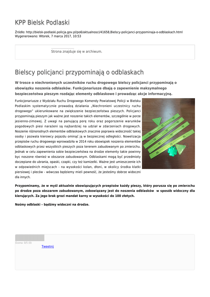 KPP Bielsk Podlaski Źródło: http://bielsk-podlaski.policja.gov.pl/po6/aktualnosci/41658,Bielscy-policjanci-przypominaja-o-odblaskach.html Wygenerowano: Wtorek, 7 marca 2017, 10:53 Strona znajduje się w archiwum. Bielscy policjanci przypominają o odblaskach W trosce o niechronionych uczestników ruchu drogowego bielscy policjanci przypominają o obowiązku noszenia odblasków. Funkcjonariusze dbają o zapewnienie maksymalnego bezpieczeństwa pieszym rozdając elementy odblaskowe i prowadząc akcje informacyjną. Funkcjonariusze z Wydziału Ruchu Drogowego Komendy Powiatowej Policji w Bielsku Podlaskim systematycznie prowadzą działania „Niechronieni uczestnicy ruchu drogowego” ukierunkowane na zwiększenie bezpieczeństwa pieszych. Policjanci przypominają pieszym jak ważne jest noszenie takich elementów, szczególnie w porze jesienno-zimowej. Z uwagi na panującą porę roku oraz pogorszenie warunków pogodowych piesi narażeni są najbardziej na udział w zdarzeniach drogowych. Noszenie różnorodnych elementów odblaskowych znacznie poprawia widoczność takiej osoby i pozwala kierowcy pojazdu ominąć ją w bezpiecznej odległości. Nowelizacja przepisów ruchu drogowego wprowadziła w 2014 roku obowiązek noszenia elementów odblaskowych przez wszystkich pieszych poza terenem zabudowanym po zmierzchu. Jednak w celu zapewnienia sobie bezpieczeństwa na drodze elementy takie powinny byc noszone również w obszarze zabudowanym. Odblaskami mogą być przedmioty doczepiane do ubrania, opaski, czapki, czy też kamizelki. Ważne jest umieszczenie ich w odpowiednich miejscach - na wysokości kolan, dłoni, w okolicy środka klatki piersiowej i pleców - wówczas będziemy mieli pewność, że jesteśmy dobrze widoczni dla innych. Przypominamy, że w myśl aktualnie obowiązujących przepisów każdy pieszy, który porusza się po zmierzchu po drodze poza obszarem zabudowanym, zobowiązany jest do noszenia odblasków w sposób widoczny dla kierujących. Za jego brak grozi mandat karny w wysokości do 100 złotych. Nośmy odblaski – bądźmy widoczni na drodze. Ocena: 0/5 (0) Tweetnij
