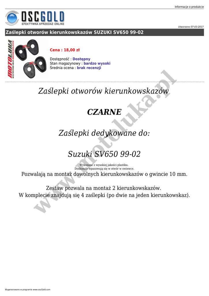 Informacje o produkcie Utworzono 07-03-2017 Zaślepki otworów kierunkowskazów SUZUKI SV650 99-02 Cena : 18,00 zł a. pl Dostępność : Dostępny Stan magazynowy : bardzo wysoki Średnia ocena : brak recenzji Zaślepki otworów kierunkowskazów uk CZARNE ot ol Zaślepki dedykowane do: .m Suzuki SV650 99-02 Wykonane z wysokiej jakości plastiku. Doskonale wpasowują się w otwór w owiewce. w w Pozwalają na montaż dowolnych kierunkowskazów o gwincie 10 mm. w Zestaw pozwala na montaż 2 kierunkowskazów. W komplecie znajdują się 4 zaślepki (po dwie na jeden kierunkowskaz). Wygenerowano w programie www.oscGold.com w w w ot .m a. pl uk ol