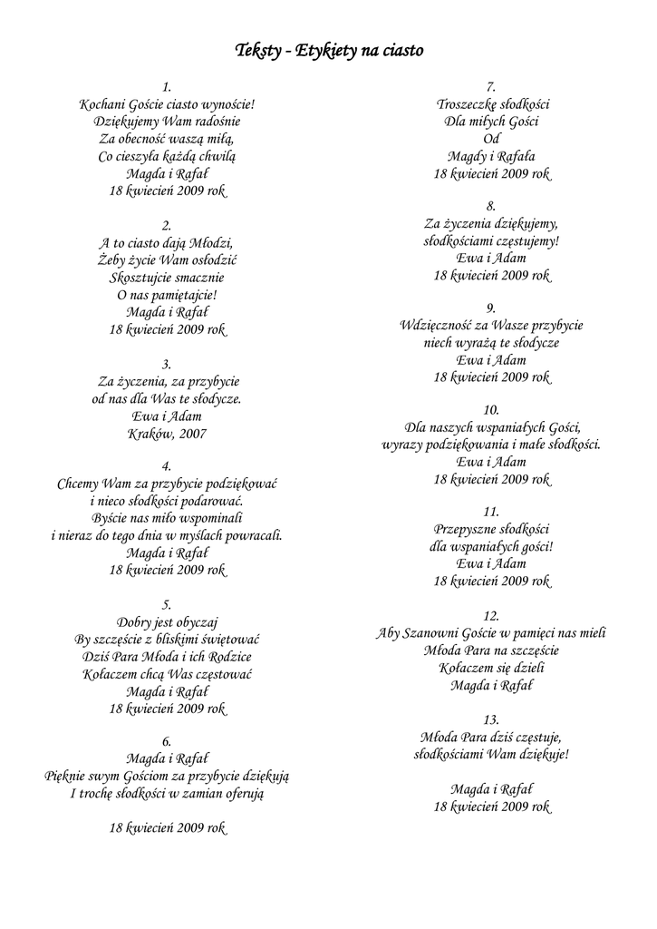 Teksty - Etykiety na ciasto 1. Kochani Goście ciasto wynoście! Dziękujemy Wam radośnie Za obecność waszą miłą, Co cieszyła każdą chwilą Magda i Rafał 18 kwiecień 2009 rok 2. A to ciasto dają Młodzi, Żeby życie Wam osłodzić Skosztujcie smacznie O nas pamiętajcie! Magda i Rafał 18 kwiecień 2009 rok 3. Za życzenia, za przybycie od nas dla Was te słodycze. Ewa i Adam Kraków, 2007 4. Chcemy Wam za przybycie podziękować i nieco słodkości podarować. Byście nas miło wspominali i nieraz do tego dnia w myślach powracali. Magda i Rafał 18 kwiecień 2009 rok 5. Dobry jest obyczaj By szczęście z bliskimi świętować Dziś Para Młoda i ich Rodzice Kołaczem chcą Was częstować Magda i Rafał 18 kwiecień 2009 rok 6. Magda i Rafał Pięknie swym Gościom za przybycie dziękują I trochę słodkości w zamian oferują 18 kwiecień 2009 rok 7. Troszeczkę słodkości Dla miłych Gości Od Magdy i Rafała 18 kwiecień 2009 rok 8. Za życzenia dziękujemy, słodkościami częstujemy! Ewa i Adam 18 kwiecień 2009 rok 9. Wdzięczność za Wasze przybycie niech wyrażą te słodycze Ewa i Adam 18 kwiecień 2009 rok 10. Dla naszych wspaniałych Gości, wyrazy podziękowania i małe słodkości. Ewa i Adam 18 kwiecień 2009 rok 11. Przepyszne słodkości dla wspaniałych gości! Ewa i Adam 18 kwiecień 2009 rok 12. Aby Szanowni Goście w pamięci nas mieli Młoda Para na szczęście Kołaczem się dzieli Magda i Rafał 13. Młoda Para dziś częstuje, słodkościami Wam dziękuje! Magda i Rafał 18 kwiecień 2009 rok