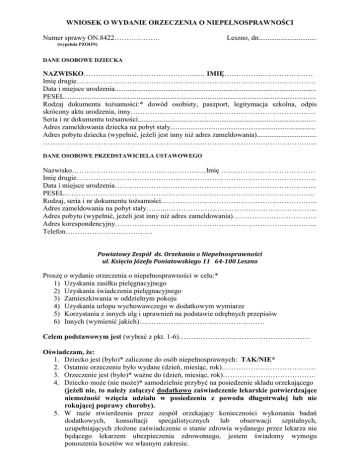 WNIOSEK O WYDANIE ORZECZENIA O NIEPEŁNOSPRAWNOŚCI Numer sprawy ON.8422………………. Leszno, dn................................ (wypełnia PZOON) DANE OSOBOWE DZIECKA NAZWISKO………………………………………...… IMIĘ…………….………………… Imię drugie……………………………………………………………………………………… Data i miejsce urodzenia............................................................................................................... PESEL........................................................................................................................................... Rodzaj dokumentu tożsamości:* dowód osobisty, paszport, legitymacja szkolna, odpis skrócony aktu urodzenia, inny………………………………..………………………………… Seria i nr dokumentu tożsamości.................................................................................................. Adres zameldowania dziecka na pobyt stały................................................................................ Adres pobytu dziecka (wypełnić, jeżeli jest inny niż adres zameldowania)................................. …………………………………………………………………………………………………... DANE OSOBOWE PRZEDSTAWICIELA USTAWOWEGO Nazwisko………………………………..………………Imię ………………………………… Imię drugie……………………………………………………………………………………… Data i miejsce urodzenia………………………………………………………………………... PESEL………………………………………………………………………………………….. Rodzaj, seria i nr dokumentu tożsamości……………………………………………………….. Adres zameldowania na pobyt stały……...……………………………………………………... Adres pobytu (wypełnić, jeżeli jest inny niż adres zameldowania)…………………………….. Adres korespondencyjny………………………………………………………………………... Telefon……………………………… Powiatowy Zespół ds. Orzekania o Niepełnosprawności ul. Księcia Józefa Poniatowskiego 11 64-100 Leszno Proszę o wydanie orzeczenia o niepełnosprawności w celu:* 1) Uzyskania zasiłku pielęgnacyjnego 2) Uzyskania świadczenia pielęgnacyjnego 3) Zamieszkiwania w oddzielnym pokoju 4) Uzyskania urlopu wychowawczego w dodatkowym wymiarze 5) Korzystania z innych ulg i uprawnień na podstawie odrębnych przepisów 6) Innych (wymienić jakich)……………………………………………. Celem podstawowym jest (wybrać z pkt. 1-6)……………………………………………… Oświadczam, że: 1. Dziecko jest (było)* zaliczone do osób niepełnosprawnych: TAK/NIE* 2. Ostatnie orzeczenie było wydane (dzień, miesiąc, rok)………………………………… 3. Orzeczenie jest (było)* ważne do (dzień, miesiąc, rok)………….…………………….. 4. Dziecko może (nie może)* samodzielnie przybyć na posiedzenie składu orzekającego (jeżeli nie, to należy załączyć dodatkowo zaświadczenie lekarskie potwierdzające niemożność wzięcia udziału w posiedzeniu z powodu długotrwałej lub nie rokującej poprawy choroby). 5. W razie stwierdzenia przez zespół orzekający konieczności wykonania badań dodatkowych, konsultacji specjalistycznych lub obserwacji szpitalnych, uzupełniających złożone zaświadczenie o stanie zdrowia wydanego przez lekarza nie będącego lekarzem ubezpieczenia zdrowotnego, jestem świadomy wymogu ponoszenia kosztów we własnym zakresie. Zakres sprawowanej opieki i pielęgnacji:* 1. Dziecko jest leżące, porusza się: samodzielnie, o kulach, na wózku inwalidzkim, z pomocą drugiej osoby, 2. przyjmuje pokarmy samodzielnie, jest karmione przez drugą osobę, wymaga stosowania specjalnej diety (jakiej)............................................................................... 3. rodzaj ograniczenia innych czynności (np. mycie się, ubieranie, załatwianie czynności fizjologicznych)................................................................................................................ ........................................................................................................................................... ........................................................................................................................................... ........................................................................................................................................... 4. rodzaj i liczba zabiegów pielęgnacyjnych wykonywanych w ciągu dnia......................... ………………………….……………………………………………………………..… ………………………………………………………………………………………...… …………………………………………………………………………………………... 5. rodzaj i liczba zabiegów rehabilitacyjno-leczniczych wykonywanych w domu i poza domem w ciągu dnia, tygodnia, miesiąca……………………………………………… ………………………………………………………………………………………...… ………………………………………………………………………………………...… …………………………………………………………………………………………... 6. częstotliwość wizyt lekarskich w domu, poza domem, w tygodniu, miesiącu……….... ………………………………………………………………………………………...… …………………………………………………………………