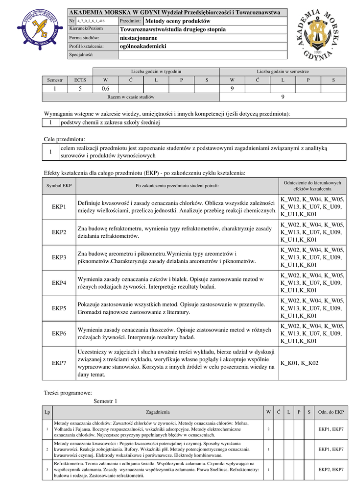 AKADEMIA MORSKA W GDYNI Wydział Przedsiębiorczości i Towaroznawstwa Nr 4_7_0_2_6_1_416 Przedmiot: Metody oceny produktów Kierunek/Poziom Towaroznawstwo/studia drugiego stopnia Forma studiów: niestacjonarne Profil kształcenia: ogólnoakademicki Specjalność: Liczba godzin w tygodniu Semestr ECTS W 1 5 0.6 Ć L P Liczba godzin w semestrze S W Ć L P S 9 9 Razem w czasie studiów Wymagania wstępne w zakresie wiedzy, umiejętności i innych kompetencji (jeśli dotyczą przedmiotu): 1 podstwy chemii z zakresu szkoły średniej Cele przedmiotu: 1 celem realizacji przedmiotu jest zapoznanie studentów z podstawowymi zagadnieniami związanymi z analityką surowców i produktów żywnościowych Efekty kształcenia dla całego przedmiotu (EKP) - po zakończeniu cyklu kształcenia: Symbol EKP Odniesienie do kierunkowych efektów kształcenia Po zakończeniu przedmiotu student potrafi: EKP1 K_W02, K_W04, K_W05, Definiuje kwasowość i zasady oznaczania chlorków. Oblicza wszystkie zależności K_W13, K_U07, K_U09, między wielkościami, przelicza jednostki. Analizuje przebieg reakcji chemicznych. K_U11,K_K01 EKP2 Zna budowę refraktometru, wymienia typy refraktometrów, charaktryzuje zasady działania refraktometrów. K_W02, K_W04, K_W05, K_W13, K_U07, K_U09, K_U11,K_K01 EKP3 Zna budowę areometru i piknometru.Wymienia typy areometrów i piknometrów.Charakteryzuje zasady działania areometrów i piknometrów. K_W02, K_W04, K_W05, K_W13, K_U07, K_U09, K_U11,K_K01 EKP4 Wymienia zasady oznaczania cukrów i białek. Opisuje zastosowanie metod w różnych rodzajach żywności. Interpretuje rezultaty badań. K_W02, K_W04, K_W05, K_W13, K_U07, K_U09, K_U11,K_K01 EKP5 Pokazuje zastosowanie wszystkich metod. Opisuje zastosowanie w przemyśle. Gromadzi najnowsze zastosowanie z literatury. K_W02, K_W04, K_W05, K_W13, K_U07, K_U09, K_U11,K_K01 EKP6 Wymienia zasady oznaczania tłuszczów. Opisuje zastosowanie metod w różnych rodzajach żywności. Interpretuje rezultaty badań. K_W02, K_W04, K_W05, K_W13, K_U07, K_U09, K_U11,K_K01 EKP7 Uczestniczy w zajęciach i słucha uważnie treści wykładu, bierze udział w dyskusji związanej z treściami wykładu, weryfikuje własne poglądy i akceptuje wspólnie K_K01, K_K02 wypracowane stanowisko. Korzysta z innych źródeł w celu poszerzenia wiedzy na dany temat. Treści programowe: Semestr 1 Lp Zagadnienia W Ć L P S Odn. do EKP 1 Metody oznaczania chlorków: Zawartość chlorków w żywności. Metody oznaczania chlorów: Mohra, Volharda i Fajansa. Iloczyny rozpuszczalności, wskaźniki adsorpcyjne. Metody elektrochemiczne oznaczania chlorków. Najczęstsze przyczyny popełnianych błędów w oznaczeniach. 2 EKP1, EKP7 2 Metody oznaczania kwasowości : Pojęcie kwasowości potencjalnej i czynnej. Sposoby wyrażania kwasowości. Reakcje zobojętniania. Bufory. Wskaźniki pH. Metody potencjometrycznego oznaczania kwasowości czynnej. Elektrody wskaźnikowe i porównawcze. Elektrody kombinowane. 1 EKP1, EKP7 3 Refraktometria. Teoria załamania i odbijania światła. Współczynnik załamania. Czynniki wpływające na współczynnik załamania. Zasady wyznaczania współczynnika załamania. Prawa Snelliusa. Refraktometry: budowa i rodzaje. Zastosowanie refraktometrii. 1 EKP2, EKP7 4 Metody oznaczania gęstości: Podstawowe definicje gęstości. Jednostki. Pomiar hydrostatyczny. Pomiar piknometryczny (piknometry: budowa i rodzaje). Pomiar areometryczny (areometry: budowa i rodzaje). 1 EKP3, EKP7 5 Metody oznaczania cukrów. Zawartość cukrowców w żywności. Przygotowanie próbek do oznaczania zawartości cukrów. Podział metod oznaczania cukrowców. Metody chemiczne: metoda Fehlinga. metoda Lane-Eynona. metoda Schoorla-Luffa. metoda Bertranda. Metody fizyko-chemiczne. 2 EKP4, EKP7 6 Metody oznaczania białek. Występowanie białek w żywności. Podział metod oznaczania białek. Przygotowanie próbek do oznaczeń. Metody oznaczania białek: biuretowa, Lovry’ego, Sörensena, Kjeldahla. 1 EKP4, EKP7 7 Zafałszowania żywności: Pojęcie zafałszowania żywności. Rodzaje zafałszowań. Przykłady zafałszowań poszczególnych grup produktów żywnościowych oraz metod ich wykrywania. 8 Metody oznaczania tłuszczów. Zawartość tłuszczów w żywności. Przygotowanie próbek do oznaczania zawartości tłuszczów. Podział i charakterystyka metod oznaczania. EKP5, EKP7 EKP6, EKP7 1 Metody weryfikacji efektów kształcenia (w odniesieniu do poszczególnych efektów): Symbol EKP Test EKP1 X EKP2 X EKP3 X EKP4 X EKP5 X EKP6 X EKP7 X Egzamin ustny Egzamin pisemny Kolokwium Sprawozdanie Projekt Prezentacja Zaliczenie praktyczne Inne X Kryteria zaliczenia przedmiotu: Semestr Ocena pozytywna (min. dostateczny) 1 pozytywna ocena z zaliczenia końcowego Uwaga: student otrzymuje ocenę powyżej dostatecznej, jeżeli uzyskane efekty kształcenia przekraczają wymagane minimum. Nakład pracy studenta: Forma aktywności Godziny kontaktowe Czytanie literatury Przygotowanie do zajęć laboratoryjnych, projektowych Przygotowanie do egzaminu, zaliczenia Opracowanie dokumentacji projektu/sprawozdania Uczestnictwo w zaliczeniach i egzaminach Udział w konsultacjach Łącznie godzin Liczba punktów ECTS Sumaryczna liczba punktów ECTS dla przedmiotu Obciążenie studenta związane z zajęciami praktycznymi Obciążenie studenta na zajęciach wymagających bezpośredn. udziału nauczycieli akadem. Szacunkowa liczba godzin na zrealizowanie aktywności W Ć L P S 9 6 6 1 1 23 5 5 6 11 Literatura: Semestr 1 Semestr 1 Literatura podstawowa 1. Drzazga B., Analiza techniczna w przemyśle spożywczym, WSiP, Warszawa 1999 2. Cygański A., Chemiczne metody analizy ilościowej, WNT, Warszawa 1994 3. Krełowska – Kułas M., Badanie jakości produktów spożywczych, PWE, Warszawa 1993 4. Małecka M., Wybrane metody analizy żywności, Wydawnictwo Akademii Ekonomicznej w Poznaniu, Poznań 2003 5. Małecka M., Klimczak I., Kształtowanie jakości żywności, Wydawnictwo Uniwersytetu Ekonomi