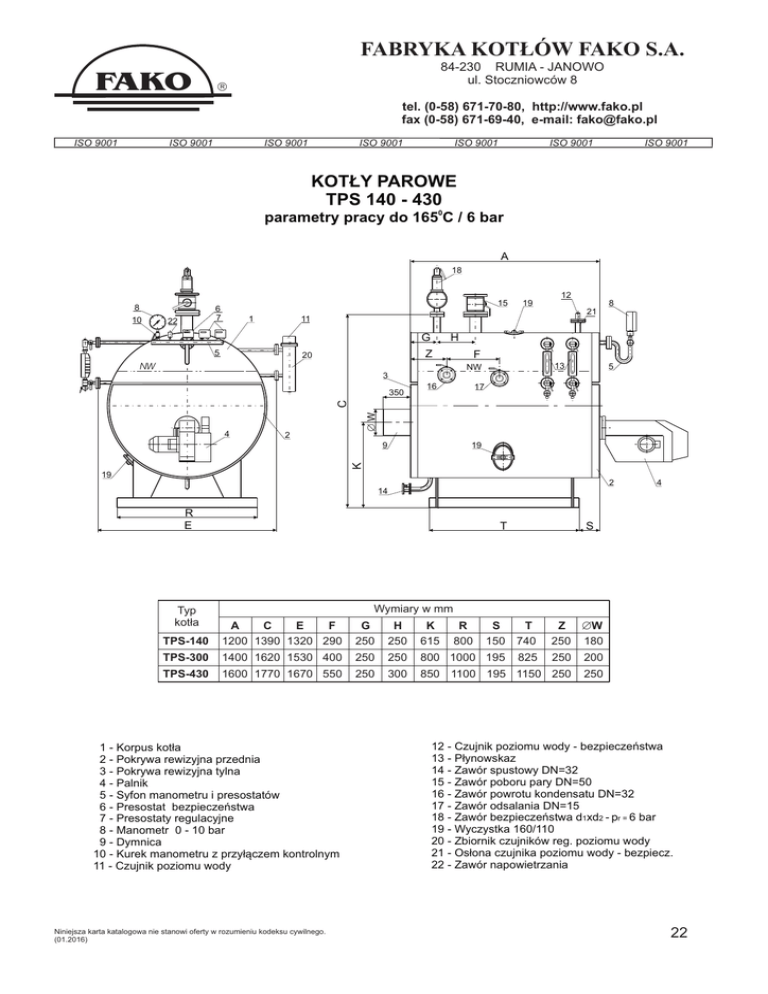 FABRYKA KOT£ÓW FAKO S.A. FAKO 84-230 RUMIA - JANOWO ul. Stoczniowców 8 â tel. (0-58) 671-70-80, http://www.fako.pl fax (0-58) 671-69-40, e-mail: [email protected] ISO 9001 ISO 9001 ISO 9001 ISO 9001 ISO 9001 ISO 9001 ISO 9001 KOT£Y PAROWE TPS 140 - 430 0 parametry pracy do 165 C / 6 bar A 18 12 8 10 15 6 7 22 19 8 21 11 1 G 5 H Z 20 NW F 13 NW 5 3 16 17 4 ÆW C 350 2 19 K 9 19 2 4 14 R E Typ kot³a TPS-140 S T Wymiary w mm A C E F 1200 1390 1320 290 G 250 H 250 K 615 R 800 S T 150 740 TPS-300 1400 1620 1530 400 250 250 800 1000 195 250 200 TPS-430 1600 1770 1670 550 250 300 850 1100 195 1150 250 250 1 - Korpus kot³a 2 - Pokrywa rewizyjna przednia 3 - Pokrywa rewizyjna tylna 4 - Palnik 5 - Syfon manometru i presostatów 6 - Presostat bezpieczeñstwa 7 - Presostaty regulacyjne 8 - Manometr 0 - 10 bar 9 - Dymnica 10 - Kurek manometru z przy³¹czem kontrolnym 11 - Czujnik poziomu wody Niniejsza karta katalogowa nie stanowi oferty w rozumieniu kodeksu cywilnego. (01.2016) 825 Z ÆW 250 180 12 - Czujnik poziomu wody - bezpieczeñstwa 13 - P³ynowskaz 14 - Zawór spustowy DN=32 15 - Zawór poboru pary DN=50 16 - Zawór powrotu kondensatu DN=32 17 - Zawór odsalania DN=15 18 - Zawór bezpieczeñstwa d1xd2 - pr = 6 bar 19 - Wyczystka 160/110 20 - Zbiornik czujników reg. poziomu wody 21 - Os³ona czujnika poziomu wody - bezpiecz. 22 - Zawór napowietrzania 22 Podstawowe parametry techniczno-eksploatacyjne kot³ów parowych TPS 140 - 430 Moc znamionowa kot³a z palnikiem olejowym Wydajnoœæ pary (przy max. temp. wody zasilaj¹cej t=1050C) *Zu¿ycie oleju opa³owego Moc znamionowa kot³a z palnikiem gazowym Wydajnoœæ pary (przy max. temp. wody zasilaj¹cej t=1050C) TPS 140 TPS 300 TPS 430 [ kW ] 100 210 300 [ kg/h ] [ kg/h ] 155 9,6 325 20,2 465 28,8 [ kW ] 90 190 270 140 10,0 4,3 220 228 600 20x32 295 21 7,3 220 561 900 20x32 420 30,0 12,0 220 650 1300 20x32 [ kg/h ] 3 [ m /h ] **Zu¿ycie gazu GZ-50 2 [m ] Powierzchnia ogrzewalna 0 [ C] Temperatura spalin wylotowych 3 [dm ] Pojemnoœæ wodna kot³a (do linii NW) [ kg ] Masa kot³a bez palnika Zawór bezpieczeñstwa typ Si 6301 - d1 x d2 * - Kocio³ opalany olejem opa³owym o wartoœci opa³owej 42 MJ/kg. 3 ** - Kocio³ opalany gazem ziemnym GZ-50 o wartoœci opa³owej 36 MJ/m . Przeznaczenie kot³a Kot³y parowe TPS przeznaczone s¹ do pracy w instalacjach grzewczych parowych o ciœnieniu pracy do 6 bar przy temperaturze do 165oC. Ko³nierze wg PN-EN 1092-1; dla PN 16 Wymiary gabarytowe podane dla kot³a z izolacj¹. Niniejsza karta katalogowa nie stanowi oferty w rozumieniu kodeksu cywilnego. (01.2016) 23