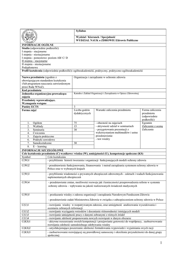 Syllabus Wydział / Kierunek / Specjalność WYDZIAŁ NAUK o ZDROWIU/Zdrowie Publiczne INFORMACJE OGÓLNE Studia (odpowiednie podkreślić) I stopnia - stacjonarne I stopnia - niestacjonarne I stopnia - pomostowe: poziom AB/ C/ D II stopnia - stacjonarne II stopnia - niestacjonarne Podyplomowe Profil kształcenia (odpowiednie podkreślić): ogólnoakademicki, praktyczny, praktyczno-ogólnoakademicki Nazwa przedmiotu (zgodnie z obowiązującym standardem kształcenia i/lub programem nauczania zatwierdzonym przez Radę WNoZ). Kod przedmiotu Jednostka organizacyjna prowadząca zajęcia Przedmioty wprowadzające. Wymagania wstępne Punkty ECTS Forma zajęć Organizacja i zarządzanie w ochronie zdrowia Katedra i Zakład Organizacji i Zarządzania w Opiece Zdrowotnej 3 Liczba godzin dydaktycznych Warunki zaliczenia przedmiotu Forma zaliczenia przedmiotu (odpowiednie podkreślić) Egzamin Zaliczenie z oceną Zaliczenie 1. Ogółem 75 - obecność na zajęciach - aktywność udział w seminariach 2. Wykłady 15 - przygotowanie prezentacji z 3. Seminaria 30 wykorzystaniem multimediów i ustne 4. Ćwiczenia przedstawienie 5. Zajęcia praktyczne - test wiedzy 6. Praktyki zawodowe 7. Samokształcenie 30 8. E – learning INFORMACJE SZCZEGÓŁOWE Cele kształcenia przedmiotu (C) wynikowe: wiedza (W), umiejętności (U), kompetencje społeczne (KS) Symbol Cele kształcenia C(W)1 - przybliżenie historii tworzenia i organizacji funkcjonujących modeli ochrony zdrowia C(W)2 - przedstawienie funkcjonowania, finansowania i metod zarządzania systemem ochrony zdrowia w Polsce oraz w wybranych krajach C(W)3 - przybliżenie wiadomości o prywatnych ubezpieczeń zdrowotnych - zaletach i wadach funkcjonowania suplementarnych ubezpieczeń C(W)4 - przedstawienie zmian, możliwości rozwoju jak i konieczności przeprowadzenia reform w systemie ochrony zdrowia – wpływanie na jakość realizowanych świadczeń medycznych C(W)5 - przekazanie wiedzy z zakresu organizacji i zarządzania Narodowym Funduszem Zdrowia - przedstawienie zadań Ministerstwa Zdrowia w związku z zabezpieczeniem ochrony zdrowia w Polsce C(U)1 C(U)2 C(U)3 C(U)4 C(KS)1 C(KS)2 C(KS)3 - rozwijanie wiedzy w rozpatrywanym zakresie, oraz umiejętność analizowania wyszukiwania i oceniania zebranych informacji - rozwijanie wyciągania wniosków i docenianie różnorodności istniejących modeli - rozwijanie umiejętność pracy z danymi zebranymi z różnych źródeł - rozwijanie zdolność proponowania nowych rozwiązań w danym obszarze - aktywne rozszerzanie swoich kompetencji i przejawianie gotowości do współpracy, zaobserwowanie rozwijania zdolność samodzielnego zdobywania wiedzy - satysfakcjonujące poszerzanie zdolności formułowania wypowiedzi i wyjaśniania swych racji - zaobserwowanie rozwijającej się prawidłowej samooceny i określenie przynależności do danej grupy społecznej 1 Przewidywane efekty kształcenia studenta w zakresie wiedzy (W), umiejętności (U), kompetencji społecznych (KS). Symbol Przewidywane efekty kształcenia studenta (EK): wiedza (W), umiejętności (U), kompetencje społeczne (KS). EK (W)1 - wie jak rozwijał się system ochrony zdrowia, zna główne czynniki wpływające na odrębność form funkcjonowania - posiada wiedzę dotyczącą funkcjonowania, finansowania i organizacji wybranych systemów ochrony zdrowia - wie na czym polegają prywatne ubezpieczenia zdrowotne, rozumie wady i zalety tych rozwiązań - posiada wiedzę o możliwościach zmian w systemie ochrony zdrowia, rozumie potrzebę reformy - posiada wiedze dotyczącą funkcjonowania Narodowego Funduszu Zdrowia - wie jakie zadania stoją przed Ministerstwem Zdrowia - praktyczne rozwijanie wiedzy, oraz utrwalenie umiejętności analizowania wyszukiwania i oceniania zebranych informacji z różnych źródeł - umiejętność wyciągania wniosków, interpretacji zjawisk w kontekście różnorodności istniejących modeli ochrony zdrowia, samodzielnej prezentacji własnych dokonań - praktyczne rozwijanie umiejętność pracy z danymi zebranymi z różnych źródeł EK (W)2 EK (W)3 EK (W)4 EK (W)5 EK (U)1 EK (U)2 EK (U)3 Odniesienie do celów kształcenia (symbol) C(W)1 C(W)2 C(W)3 C(W)4 C(W)5 C(U)1 C(U)2 C(U)3 - umiejętność samoobserwacji, wyciągania wniosków i praktyczne wykorzystanie C(U)4 zdolności proponowania nowych rozwiązań w danym obszarze EK (KS)1 - wykazuje aktywną i satysfakcjonującą zdolność rozszerzanie swoich C(KS)1 kompetencji i zdobywania wiedzy przejawianie gotowości do współpracy i proszenia o pomoc w sytuacjach trudnych EK (KS)2 - wykazuje satysfakcjonującą skuteczność w poszerzaniu zdolności formułowania C(KS)2 wypowiedzi i wyjaśniania swych racji EK (KS)3 - wykazuje świadomość funkcji jaka mu przypadła i jaką będzie realizował w C(KS)3 przyszłości, potrafi planować pracę Treści programowe (TP): opis przedmiotu wynikający z obowiązującego standardu kształcenia i/lub programu nauczania zatwierdzonego przez Radę WNoZ Symbol Forma realizacji treści kształcenia: Odniesienie do np. wykład, seminaria, ćwiczenia, efektów zajęcia praktyczne, praktyki kształcenia zawodowe, samokształcenie, E(symbol) learning TP1 - wykład + samokształcenie EK (W)1 Transformacja systemu ochrony zdrowia zdrowotnej w Polsce i na EK (U)1 Świecie EK (U)2 - prezentacja historii rozwoju system ochrony zdrowia w Polsce od EK (U)3 okresu przedwojennego do roku 2004, EK (U)4 - prezentacja zmian w wybranych systemach ochrony zdrowia na EK (KS)1 Świecie EK (KS)2 EK (KS)3 TP2 - seminaria + samokształcenie EK (W)2 Podstawy (prawne) funkcjonowania systemu ochrony zdrowia w EK (U)1 Polsce oraz w wybranych krajach. EK (U)2 - prezentacja źródeł finansowania systemu opieki zdrowotnej w EK (U)3 Polsce i w wybranych krajach, EK (U)4 - prezentacja zależności pomiędzy finansowaniem systemu opieki EK (KS)1 zdrowotnej a dostępem do świadczeń medycznych EK (KS)2 EK (KS)3 TP3 - wykład + samokształcenie EK (W)3