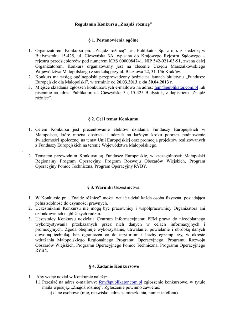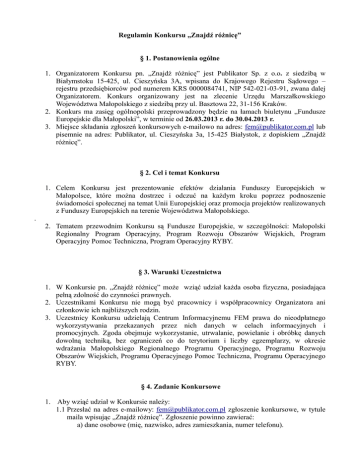 Regulamin Konkursu „Znajdź różnicę” § 1. Postanowienia ogólne 1. Organizatorem Konkursu pn. „Znajdź różnicę” jest Publikator Sp. z o.o. z siedzibą w Białymstoku 15-425, ul. Cieszyńska 3A, wpisana do Krajowego Rejestru Sądowego – rejestru przedsiębiorców pod numerem KRS 0000084741, NIP 542-021-03-91, zwana dalej Organizatorem. Konkurs organizowany jest na zlecenie Urzędu Marszałkowskiego Województwa Małopolskiego z siedzibą przy ul. Basztowa 22, 31-156 Kraków. 2. Konkurs ma zasięg ogólnopolski przeprowadzony będzie na łamach biuletynu „Fundusze Europejskie dla Małopolski”, w terminie od 26.03.2013 r. do 30.04.2013 r. 3. Miejsce składania zgłoszeń konkursowych e-mailowo na adres: [email protected] lub pisemnie na adres: Publikator, ul. Cieszyńska 3a, 15-425 Białystok, z dopiskiem „Znajdź różnicę”. § 2. Cel i temat Konkursu 1. Celem Konkursu jest prezentowanie efektów działania Funduszy Europejskich w Małopolsce, które można dostrzec i odczuć na każdym kroku poprzez podnoszenie świadomości społecznej na temat Unii Europejskiej oraz promocja projektów realizowanych z Funduszy Europejskich na terenie Województwa Małopolskiego. . 2. Tematem przewodnim Konkursu są Fundusze Europejskie, w szczególności: Małopolski Regionalny Program Operacyjny, Program Rozwoju Obszarów Wiejskich, Program Operacyjny Pomoc Techniczna, Program Operacyjny RYBY. § 3. Warunki Uczestnictwa 1. W Konkursie pn. „Znajdź różnicę” może wziąć udział każda osoba fizyczna, posiadająca pełną zdolność do czynności prawnych. 2. Uczestnikami Konkursu nie mogą być pracownicy i współpracownicy Organizatora ani członkowie ich najbliższych rodzin. 3. Uczestnicy Konkursu udzielają Centrum Informacyjnemu FEM prawa do nieodpłatnego wykorzystywania przekazanych przez nich danych w celach informacyjnych i promocyjnych. Zgoda obejmuje wykorzystanie, utrwalanie, powielanie i obróbkę danych dowolną techniką, bez ograniczeń co do terytorium i liczby egzemplarzy, w okresie wdrażania Małopolskiego Regionalnego Programu Operacyjnego, Programu Rozwoju Obszarów Wiejskich, Programu Operacyjnego Pomoc Techniczna, Programu Operacyjnego RYBY. § 4. Zadanie Konkursowe 1. Aby wziąć udział w Konkursie należy: 1.1 Przesłać na adres e-mailowy: [email protected] zgłoszenie konkursowe, w tytule maila wpisując „Znajdź różnicę”. Zgłoszenie powinno zawierać: a) dane osobowe (mię, nazwisko, adres zamieszkania, numer telefonu). b) poprawne rozwiązanie konkursowe: opisane trzy różnice na zdjęciach , opublikowanych w dziale relaks oraz jakiego wydarzenia dotyczą te zdjęcia. 1.2 Za zgłoszenia nieważne uważa się: a) zgłoszenia nadesłane po terminie – decyduje data zgłoszenia uczestnictwa w Konkursie przysłanego na adres e-mailowy: [email protected]; b) zgłoszenia zawierające niepełne dane adresowe Uczestnika (imię, nazwisko, adres zamieszkania, numer telefonu); c) zgłoszenia od zgłaszających, którzy nie wypełnili zadań konkursowych określonych w punkcie § 3. Regulaminu. 1.3 Organizator nie ponosi odpowiedzialności za indywidualne ustawienia poczty e-mail i nieprawidłowe działanie strony internetowej lub serwera poczty. § 5. Nagrody 1. 2. 3. 4. 5. Do wygrania są trzy nagrody rzeczowe za I, II i III miejsce. Koszt transportu nagród jest wliczony w cenę nagród. Nagrodą za I miejsce jest odtwarzacz MP4 4GB. Nagrodą za II miejsce jest pamięć USB 2.0 16 GB. Nagrodą za III miejsce jest mysz optyczna. § 6. Przebieg konkursu 1. Konkurs zostanie ogłoszony na łamach e-biuletynu „Fundusze Europejskie dla Małopolski” w wydaniu 5/2013 2. Zwycięzcami Konkursu będą trzy pierwsze osoby, które najszybciej nadeślą prawidłowe odpowiedzi na pytania Konkursowe. 3. Ogłoszenie wyników Konkursu zostanie zamieszczone w wydaniu 6/2013 biuletynu "Fundusze Europejskie dla Małopolski". 4. Zwycięzcy o przyznaniu nagrody zostaną poinformowani do dnia 30.05.2013 r. § 7. Odbiór nagród 1. Nagrody rzeczowe nie podlegają wymianie na gotówkę. 2. Nagrody zostaną dostarczone w ciągu 30 dni od ogłoszenia listy nagrodzonych na koszt Wydawnictwa lub w trybie ustalonym z laureatem. 3. Laureaci są zobowiązani do przesłania potwierdzenia odbioru nagrody drogą e-mailową na adres: [email protected] lub pisemną na adres: Publikator, ul. Cieszyńska 3a, 15-425 Białystok, z dopiskiem „Znajdź różnicę”. 4. W przypadku nieodebrania nagrody w wyznaczonym przez Organizatora terminie z przyczyn leżących po stronie Laureata prawo do nagrody wygasa. Nagrody nieodebrane z wyżej wymienionych przyczyn pozostają do dyspozycji organizatora Konkursu. § 8. Postanowienia końcowe 1. Konkurs nie jest grą losową w rozumieniu ustawy z dnia 19 listopada 2009 r. o grach hazardowych (Dz. U. z 2009 nr 201 poz. 1540 ze zm.). 2. Dokonując zgłoszenia, Uczestnik Konkursu potwierdza, że wyraża zgodę na zasady Konkursu zawarte w niniejszym regulaminie. 3. Uczestnicy Konkursu wyrażają zgodę na wykorzystywanie i przetwarzanie przez Organizatora danych osobowych uzyskanych w związku z organizacją Konkursu oraz reklamowych i marketingowych organizatora. Dane osobowe Uczestników Konkursu przetwarzane będą przy zachowaniu zasad określonych w ustawie o ochronie danych osobowych z dnia 28 sierpnia 1997 r. (Dz. U. Z 1997 r., Nr 133, poz. 833 z późniejszymi zmianami). 4. W sprawach nieuregulowanych niniejszym regulaminem zastosowanie mają przepisy Kodeksu Cywilnego. 5. Wszelkie spory związane z niniejszym Konkursem będą rozpoznawane przez sąd właściwy dla siedziby Organizatora. 6. W przypadku stwierdzenia nieprawidłowości w czasie trwania Konkursu, wynikających z nadużyć ze strony Uczestnika, w tym w szczególności złamania przez Uczestnika zasad Regulaminu Konkursu Organizator ma prawo nieodwołalnie wykluczyć danego Uczestnika z Konkursu. Organizator zastrzega, iż w tych okolicznościach nie będzie ponosić