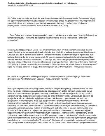 Rodzina katolicka - Cięcia w programach indoktrynacyjnych nt. Holokaustu wtorek, 01 września 2009 12:14 Jill Coble, nauczycielka ze średniej szkoły w miejscowości Smyrna w stanie Tennessee “nigdy nie opuściła tematu Holokaustu podczas wykładanego przez nią przedmiotu ‘nauki społeczne’ (social studies), korzystając z możliwości wywołania dyskusji o niebezpieczeństwach propagandy.” – donosi dumnie amerykański dziennik USA Today. Pani Coble jest bowiem ‘koordynatorką’ zajęć o Holokauście w stanowej “Komisji Edukacji na temat Holokaustu”, która ma za zadanie organizowanie lekcji o “nienawiści i prawach człowieka”. Niestety, ku rozpaczy pani Coble i jej zwierzchników, tzw. kryzys ekonomiczny daje się we znaki również w tej szczególnej dziedzinie jaką jest dbałość o “edukację na temat Holokaustu”. Okazuje się, że w samym tylko stanie Tennessee obcięto stanowe dotacje w wysokości 128 tysięcy dolarów dla tej grupy nauczycieli. W innych stanach jest podobnie: działająca w New Jersey ‘Komisja Edukacji Holokaustu’ – okazuje się, że w każdym prawie stanowym wydziale edukacji lobby żydowskie wymusiło stworzenie tego typu komisji – otrzyma w tym roku “jedynie” 200 tysięcy dolarów zamiast dotychczasowych ćwierć miliona. W stanie Nevada, cięcia wynosić będą 70 tysięcy dolarów w ciągu dwóch kolejnych lat, w Pennsylvanii – 60 tysięcy dolarów. Na cięcia w programach indoktrynacyjnych, ubolewa dyrektor żydowskiej Ligii Przeciwko Zniesławieniu Anti-Defamation Leauge – ADL, Abraham Foxman. Patrząc na sponsorów tych programów, lektury z których korzystają, prezentowane na nich filmy, na grupy kształcące nauczycieli oraz zapraszanych gości, zamiast szczytnego słowa ‘edukacja’ można nazwać program bardziej prawidłowo: indoktrynacją w duchu wyższości cierpień narodu żydowskiego i nienawiścią do prawdy historycznej. Lekcje służą bowiem do wpajania w młode pokolenie wyjątkowości tzw. Holokaustu, z położeniem akcentu na “przyczyny” nienawiści jaką mają być bezpośrednio “prawicowe rządy Hitlera” (bowiem indoktrynatorom do głowy nie przyjdzie, że chodzi o skrajnego lewicowca, takiego samego socjalistę jak oni sami, tylko zamiast o odcieniu międzynarodowym, to narodowym), a pośrednio oczywiście religia katolicka. Polska prezentowana jest jako kraj, w którym miał miejsce tzw. Shoah, a Polacy jako – w najlepszym przypadku – bierni obserwatorzy, a najczęściej jako współwykonawcy i pomocnicy nieokreślonych “nazistów”. Jednocześnie, opracowany przez żydowskie masońskie organizacje typu ADL program “zajęć o Holokauście”, nie dopuszcza nie tylko do kwestionowania ale i zwykłej dociekliwości na temat liczby ofiar żydowskich, przyjmując kabalistyczną i niezmienną liczbę “6 milionów”. Ciekawe jak wyglądałyby zajęcia gdyby plaga tzw. “programów edukacyjnych” rozpoczęła się na dobre przed 1990 rokiem i jak próbowano by 1/2 Rodzina katolicka - Cięcia w programach indoktrynacyjnych nt. Holokaustu wtorek, 01 września 2009 12:14 wyjaśniać nagłą zmianę obowiązujących przez 40 lat “4 milionów ofiar” obozu KL Auschwitz, na dzisiejszy nowy standard, czyli “ponad 1 milion”. Czy reformy systemu edukacji zawierałyby również odpowiednie nowe wytyczne dotyczące dodawania i odejmowania? Za: Bibula.com 2/2