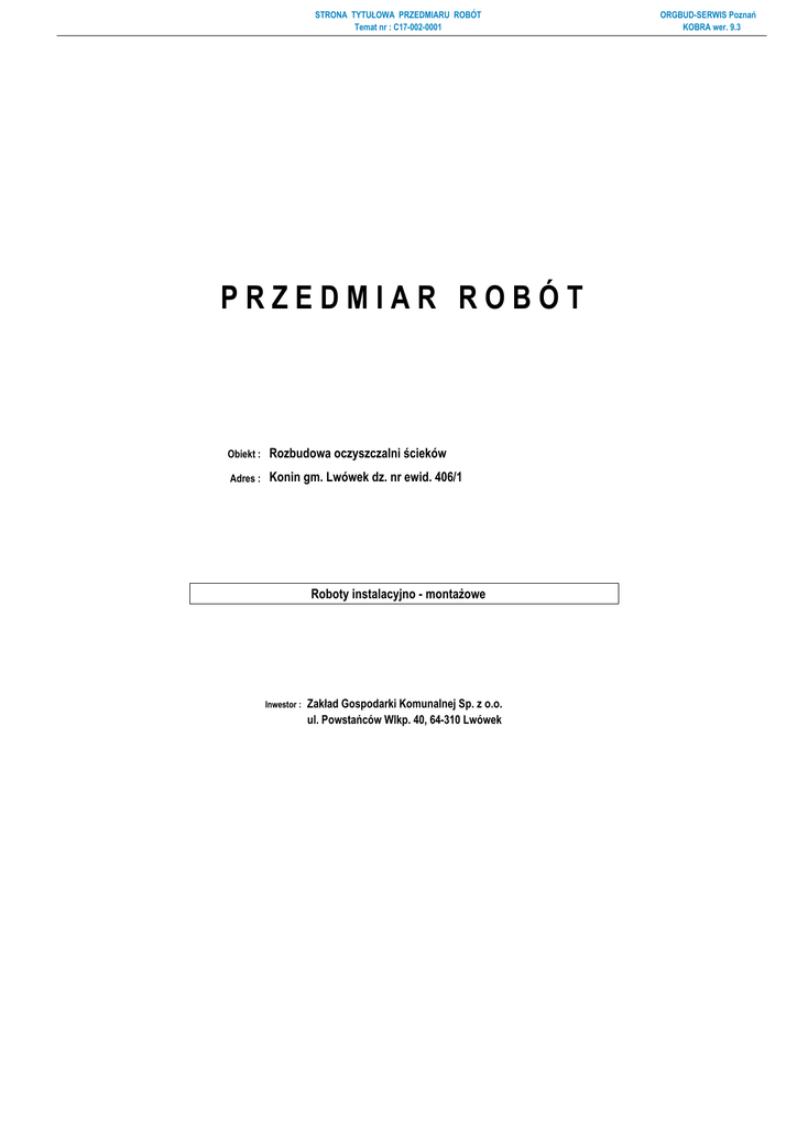 STRONA TYTUŁOWA PRZEDMIARU ROBÓT Temat nr : C17-002-0001 PRZEDMIAR ROBÓT Obiekt : Rozbudowa oczyszczalni ścieków Adres : Konin gm. Lwówek dz. nr ewid. 406/1 Roboty instalacyjno - montażowe Inwestor : Zakład Gospodarki Komunalnej Sp. z o.o. ul. Powstańców Wlkp. 40, 64-310 Lwówek ORGBUD-SERWIS Poznań KOBRA wer. 9.3 SPIS DZIAŁÓW PRZEDMIARU Temat nr : C17-002-0001 ORGBUD-SERWIS Poznań KOBRA wer. 9.3 Roboty instalacyjno - montażowe Obiekt : Rozbudowa oczyszczalni ścieków Adres : Konin gm. Lwówek dz. nr ewid. 406/1 SPIS DZIAŁÓW PRZEDMIARU Data : 2015-04-01 Lp. Str: 1 Opis stanu / elementu I STAN : Sitopiaskownik I.1 ELEMENT : Roboty montażowe II STAN : Wyposażenie technologiczne zbiornika retencyjno-wyrównawczego II.2 ELEMENT : Roboty montażowe III STAN : Rurociągi technologiczne zewnętrzne III.3 ELEMENT : Roboty ziemne III.4 ELEMENT : Roboty montażowe III.5 ELEMENT : Odwodnienie wykopów III.6 ELEMENT : Roboty inne - - - Koniec wydruku - - - PRZEDMIAR ROBÓT Temat nr : C17-002-0001 ORGBUD-SERWIS Poznań KOBRA wer. 9.3 Roboty instalacyjno - montażowe Obiekt : Rozbudowa oczyszczalni ścieków Adres : Konin gm. Lwówek dz. nr ewid. 406/1 Data : 2015-04-01 Lp. Podstawa kalkulacji / opis pozycji Str: 1 Ilość Jedn. miary I STAN : Sitopiaskownik I.1 ELEMENT : Roboty montażowe 1 KNNR 011-0606-01-00 1,000 kpl Montaż zespołów urządzeń zblokowanej oczyszczalni ścieków o masie: do 8,6 t - dostawa i montaż sitopiaskownika wyposażonego w system grzewczy wraz z ociepleniem 2 KNNR 007-0206-03-00 1,000 kpl Montaż stalowych konstrukcji wsporczych, wzmacniających ze stali kwasoodpornej (elementy wsporcze do pomostu) 3 KNNR 007-0202-01-00 1,000 kpl Montaż podestów ze stali kwasoodpornej z kraty typu WEMA - pomost obsługowy na zamówinie wg projektu mocowany do elem. wsporczego 4 KNNR 007-0202-04-00 1,000 kpl Montaż poręczy stalowych ze stali kwasoodpornej na zamówinie wg projektu 5 KNNR 007-0202-03-00 1,000 kpl Montaż schodów ze stali kwasoodpornej na zamówinie wg projektu II STAN : Wyposażenie technologiczne zbiornika retencyjno-wyrównawczego II.2 ELEMENT : Roboty montażowe 6 KNNR 011-0604-01-00 1,000 kpl Montaż mieszaczy o masie: do 0,80 t - Analogia: dostawa i montaż mieszadła wraz z konstrukcją wsporczą 7 KNR 218-0112-03-01 IZOiEPB ORGBUD W-wa 2,000 szt Układanie kształtek żeliwnych ciśnieniowych, kołnierzowych, przy średnicy nominalnej: 100 mm - kolano stopowe z autozłączem w kpl z pompami 8 KNR 707-0204-01-00 WACETOB Warszawa 2,000 kpl Montaż pomp zatapialnych o wydajności 50 m3/h przy wysokości podnoszenia ok. 3,5 mH2O 9 215-0514-07-00 3,000 m Rurociągi z rur stalowych ze stali kwasoodpornej DN100 10 KNR 709-2601-10-00 IGM Warszawa 2,000 szt Montaż zaworów żeliwnych odcinających, kulowych, kołnierzowych, na ciśnienie nominalne do 1,0 MPa (10 kG/cm2), o średnicy nominalnej: 100 mm 11 KNR 709-2606-05-00 IGM Warszawa 2,000 szt Montaż zaworów zwrotnych kulowych kołnierzowych, na ciśnienie nominalne do 1,0 MPa (10 kG/cm2), o średnicy nominalnej: 100 mm 12 KNR 709-0319-06-00 IGM Warszawa 16,000 złącze Spawanie ręczne w osłonie argonu metodą TIG rurociągów, kolan i kołnierzy ze stali austenitycznych, przy średnicy rurociągów 100 mm - kolana i kołnierze wliczyć w materiał 13 kalk. indywid. 2,000 kpl Montaż prowadnicy rurowej wraz z kompletem wyposażenia do prowadzenia pomp zanurzalnych ze stali kwasoodpornej DN50 14 KNNR 007-0206-03-00 1,000 kpl Montaż stalowych konstrukcji wsporczych, wzmacniających ze stali kwasoodpornej (rama montażowa do prowadnic rurowych dla pomp z kształtownika 50x50x4) 15 kalk. indywid. 1,000 kpl Montaż żurawika wyciągowego do pomp zatapialnych 16 kalk. indywid. 1,000 szt Montaż kształtki wykonanej na zamówienie wg projektu ze stali kwasoodpornej, łączącej sitopiaskownik i zbiornik retencyjny III STAN : Rurociągi technologiczne zewnętrzne III.3 ELEMENT : Roboty ziemne 17 KNR 201-0119-03-00 IZOiEPB ORGBUD W-wa 0,035 km Roboty pomiarowe przy liniowych robotach ziemnych - trasa dróg w terenie równinnym 18 KNR 201-0217-04-00 IZOiEPB ORGBUD W-wa Wykopy oraz przekopy wykonywane na odkład koparkami podsiębiernymi o pojemności łyżki 0,25 m3, w gruncie kategorii: III 39,980 m3 PRZEDMIAR ROBÓT Temat nr : C17-002-0001 ORGBUD-SERWIS Poznań KOBRA wer. 9.3 Roboty instalacyjno - montażowe STAN : III. Rurociągi technologiczne zewnętrzne ELEMENT : III.3. Roboty ziemne Data : 2015-04-01 Lp. Str: 2 Podstawa kalkulacji / opis pozycji 19 KNR 201-0317-02-00 IZOiEPB ORGBUD W-wa Ilość Jedn. miary 0,820 m3 Wykopy ręczne liniowe o ścianach pionowych głębokości do 1,5 m, pod fundamenty, rurociągi i kolektory w gruntach suchych kat. III-IV, z wydobyciem urobku łopatą lub wyciągiem ręcznym: szer. wykopu 0,8-1,5 m 20 KNR 201-0325-01-00 IZOiEPB ORGBUD W-wa 102,000 m2 Umocnienie ścian wykopów liniowych o ścianach pionowych za pomocą metalowej obudowy typu boks 21 KSNR 001-0210-02-10 WACETOB Warszawa 39,980 m3 Zasypywanie koparką wykopów fundamentowych podłużnych, punktowych, rowów i wykopów obiektowych warstwami gruntu rodzimego grubości 40 cm, przy użyciu koparko-ładowarki 22 KNR 201-0320-02-00 IZOiEPB ORGBUD W-wa 0,820 m3 Ręczne zasypywanie wykopów liniowych oraz jamistych o ścianach pionowych 23 KNR 201-0406-01-00 IZOiEPB ORGBUD W-wa 102,000 m2 Zagęszczanie ziemi płytą wibracyjną warstwami co 40 cm III.4 ELEMENT : Roboty montażowe 24 218-0109-03-00 6,000 m Rurociągi z rur PE dwuwarstwowych SDR 17 , PN10, łączonych metodą zgrzewania, przy średnicy zewnętrznej rur: 110 x 6,6 mm 25 KNR 218-0109-04-00 IZOiEPB ORGBUD W-wa 41,000 m Rurociągi z rur PE dwuwarstwowych SDR 17, PN10, łączonych metodą zgrzewania, przy średnicy zewnętrznej rur: 160 x 9,5 mm 26 KNR 405-0111-03-00 PROINBUD Warszawa 2,000 szt Wstawienie w rurociąg trójnika żeliwnego ciśnieniowego kołnierzowegoo średnicy 150 mm - wcinka bez materiału 27 KNR 218-0111-04-10 WACETOB Warszawa 4,