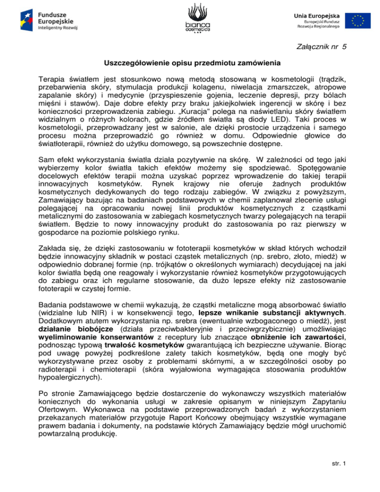 Załącznik nr 5 Uszczegółowienie opisu przedmiotu zamówienia Terapia światłem jest stosunkowo nową now metodą stosowaną ą w kosmetologii (trądzik, przebarwienia skóry, stymulacja produkcji kolagenu, niwelacja zmarszczek, atropowe zapalanie skóry) i medycynie (przyspieszenie gojenia, go leczenie depresji, depresji przy bólach mięśni i stawów). Daje dobre efekty przy braku jakiejkolwiek ingerencji w skórę skór i bez konieczności ci przeprowadzenia zabiegu. zabiegu „Kuracja” polega na naświetlaniu świetlaniu skóry światłem widzialnym o różnych nych kolorach, kolorach gdzie źródłem światła są diody LED). Taki proces w kosmetologii, przeprowadzany jest w salonie, salonie ale dzięki ki prostocie urządzenia urzą i samego procesu można na przeprowadzić przeprowadzi go również w domu. Odpowiednie głowice do światłoterapii, równieżż do użytku żytku domowego, są powszechnie dostępne ępne. Sam efekt wykorzystania światła działa pozytywnie na skórę. skór W zależności zależ od tego jaki wybierzemy kolor światła takich efektów możemy mo się spodziewać. spodziewa Spotęgowanie docelowych efektów terapii można mo uzyskać poprzez wprowadzenie do takiej terapii innowacyjnych kosmetyków. Rynek krajowy nie oferuje żadnych ż produktów kosmetycznych dedykowanych do tego rodzaju zabiegów. W związku zwią z powyższym, Zamawiający bazującc na badaniach podstawowych w chemii zaplanował zlecenie usługi polegającej na opracowaniu nowej linii produktów kosmetycznych z cząstkami cz metalicznymi do zastosowania w zabiegach kosmetycznych twarzy polegających polegaj na terapii światłem. Będzie dzie to nowy innowacyjny produkt do zastosowania po raz pierwszy w gospodarce na poziomie polskiego polskieg rynku. Zakłada się, że dzięki ki zastosowaniu w fototerapii kosmetyków w skład których wchodził będzie dzie innowacyjny składnik w postaci cząstek cz metalicznych (np. srebro, złoto, miedź) mied w odpowiednio dobranej formie (np. trójkątów trójk o określonych lonych wymiarach) wymiarach decydującej na jaki kolor światła będą one reagowały i wykorzystanie również kosmetyków przygotowujących do zabiegu u oraz ich regularne stosowanie, da dużo o lepsze efekty niż ni zastosowanie fototerapii w czystej formie. Badania podstawowe w chemii wykazują, że cząstki metaliczne mogą ą absorbować światło (widzialne lub NIR) i w konsekwencji tego, lepsze wnikanie substancji aktywnych. aktywnych Dodatkowym atutem wykorzystania np. srebra (ewentualnie wzbogaconego o miedź), mied jest działanie biobójcze (działa przeciwbakteryjnie i przeciwgrzybicznie) umożliwiając umo wyeliminowanie konserwantów z receptury lub znaczące obniżenie enie ich zawartości, podnosząc typową trwałość ść kosmetyków gwarantującą ich bezpieczne używanie. u Biorąc pod uwagę powyżej ej podkreślone podkreś zalety takich kosmetyków, będą one mogły być wykorzystywane przez osoby z problemami skórnymi, skórnymi a w szczególności szczególno osoby po radioterapii i chemioterapii (skóra wyjałowiona wymagająca ąca stosowania produktów hypoalergicznych). Po stronie Zamawiającego ącego będzie będzie dostarczenie do wykonawczy wszystkich materiałów koniecznych do wykonania usługi w zakresie opisanym w niniejszym Zapytaniu Ofertowym. Wykonawca na podstawie przeprowadzonych badań z wykorzystaniem przekazanych materiałów przygotuje zygotuje Raport Końcowy Ko obejmujący wszystkie wymagane prawem badania i dokumenty, dokumenty na podstawie których Zamawiający ą będzie ędzie mógł uruchomić powtarzalną produkcję. str. 1 Ilościowe i jakościowe wytyczne ytyczne do recepturowania: receptur Receptury produktów kosmetycznych powinny zawierać naturalne składniki w ilości ilo ogółem min. 70%. Receptura powinna zostać opracowywana z udziałem końcowych ko użytkowników. Grupa docelowa zostanie dopasowana do właściwości ś ści jakie jaki spodziewane są dla danego typu kosmetyku etyku (np. kosmetyki przeciwstarzeniowe, przeciwstarzeniowe, osoby w wieku 45+) i stanowiła będzie dzie min. 20 osób o zróżnicowanych zró nicowanych problemach skórnych oraz tak dobrana, aby można na było miarodajnie ocenić oceni wyniki. Przygotowanie składu/receptury produktów prowadzone będzie ażż do osiągnięcia osią wyników nie mniej niż średnio rednio o 15% lepszych niż dla efektów działania samej światłoterapii lub typowych produktów kosmetycznych powrzechnie stosowanych na rynku w zakresie takich parametrów, jak: - redukcja zmarszczek - stopień nawilżenia skóry - redukcja przebarwień Mając na uwadze lepszy efekt terapeutyczny, linia l kosmetyków składała się si z: 1) Produkt myjący cy do przygotowania skóry twarzy do dalszych zabiegów a) dla skóry mieszanej b) produkt hypoalergiczny 2) Produkt tonizujący/uspok ący/uspokajający skóry w trakcie i po zabiegu a) dla skóry mieszanej b) produkt hypoalergiczny 3) Peeling do twarzy przygotowujący przygotowuj skórę do zabiegu c) wersja dla profesjonalnych salonów d) wersja do użytku żytku domowego Produkty te nie muszą ą zawierać innowacyjnego składnika, ale muszą być kompatybilne z poniższymi produktami. 4) 5) 6) 7) Serum um stosowane tylko w salonach salo w połączeniu z fototerapią a) o głównym działaniu przeciwstażeniowym przeciwsta i nawilżającym ż ącym b) o głównych działaniu niwelującym niweluj tzw. stres miejski c) produkt hypoalergiczny, dla skóry bardzo wrażliwej wra Krem na dzień ń (z innowacyjnymi składniami, także e do samodzielnych zabiegów w domu z użyciem yciem fototerapii) a) o głównym działaniu przeciwstażeniowym przeciwsta i nawilżającym ż ącym b) o głównych działaniu niwelującym niweluj tzw. stres miejski c) produkt hypoalergiczny, dla skóry bardzo wrażliwej wra Krem na noc (z innowacyjnymi składniami, składni także e do samodzielnych zabiegów w domu z uż