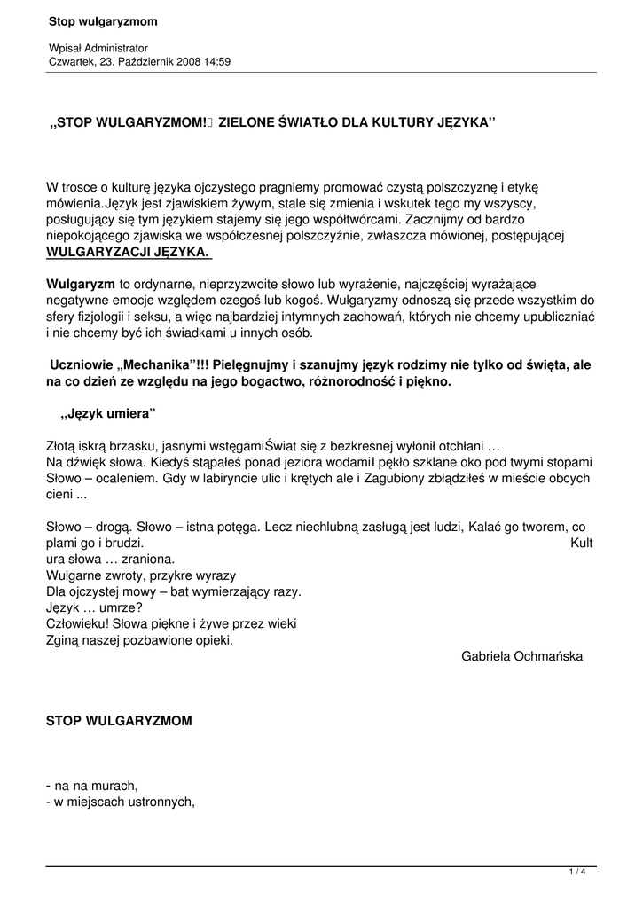 Stop wulgaryzmom Wpisał Administrator Czwartek, 23. Październik 2008 14:59 ,,STOP WULGARYZMOM! ZIELONE ŚWIATŁO DLA KULTURY JĘZYKA’’ W trosce o kulturę języka ojczystego pragniemy promować czystą polszczyznę i etykę mówienia.Język jest zjawiskiem żywym, stale się zmienia i wskutek tego my wszyscy, posługujący się tym językiem stajemy się jego współtwórcami. Zacznijmy od bardzo niepokojącego zjawiska we współczesnej polszczyźnie, zwłaszcza mówionej, postępującej WULGARYZACJI JĘZYKA. Wulgaryzm to ordynarne, nieprzyzwoite słowo lub wyrażenie, najczęściej wyrażające negatywne emocje względem czegoś lub kogoś. Wulgaryzmy odnoszą się przede wszystkim do sfery fizjologii i seksu, a więc najbardziej intymnych zachowań, których nie chcemy upubliczniać i nie chcemy być ich świadkami u innych osób. Uczniowie „Mechanika”!!! Pielęgnujmy i szanujmy język rodzimy nie tylko od święta, ale na co dzień ze względu na jego bogactwo, różnorodność i piękno. ,,Język umiera” Złotą iskrą brzasku, jasnymi wstęgamiŚwiat się z bezkresnej wyłonił otchłani … Na dźwięk słowa. Kiedyś stąpałeś ponad jeziora wodamiI pękło szklane oko pod twymi stopami Słowo – ocaleniem. Gdy w labiryncie ulic i krętych ale i Zagubiony zbłądziłeś w mieście obcych cieni ... Słowo – drogą. Słowo – istna potęga. Lecz niechlubną zasługą jest ludzi, Kalać go tworem, co plami go i brudzi. Kult ura słowa … zraniona. Wulgarne zwroty, przykre wyrazy Dla ojczystej mowy – bat wymierzający razy. Język … umrze? Człowieku! Słowa piękne i żywe przez wieki Zginą naszej pozbawione opieki. Gabriela Ochmańska STOP WULGARYZMOM - na na murach, - w miejscach ustronnych, 1/4 Stop wulgaryzmom Wpisał Administrator Czwartek, 23. Październik 2008 14:59 - na ławkach i krzesłach w szkole, - na szkolnych korytarzach, - w Internecie. Używanie wulgaryzmów to ciężkie wykroczenie przeciw kulturze. - Uczeń dobrze wychowany, kulturalny potrafi wyrażać swoje emocje tak, by nie obrażać innych i nie hańbić siebie plugawym słownictwem. Ono świadczy co najwyżej o prymitywizmie emocjonalnym i braku ogłady, a także o niskim poziomie umiejętności językowych, a więc również o bardzo ubogim słownictwie. - Wulgaryzmy nie stanowią o naszej kulturze, lecz ją niszczą! - Niecenzuralne słowa nie sprawią, że staniesz się osobą interesującą i godną szacunku! - Nobilituje kultura osobista, prawy charakter, szlachetne uczynki, oczytanie i wiedza, wulgarność języka tylko hańbi! - Prośmy, dziękujmy, przepraszajmy, komplementujmy. Bądźmy uprzejmi i eleganccy w mówieniu. - Postarajmy się nie kaleczyć polszczyzny. „Granice mojego języka wyznaczają granice mojego świata.” Ludwig Wittgenstein 2/4 Stop wulgaryzmom Wpisał Administrator Czwartek, 23. Październik 2008 14:59 „ Mowa wydaje ludzkie obyczaje.”Łacińskie przysłowie „Oszczędzaj złotówki i oszczędzaj grosze- Nie oszczędzaj słówek ,,przepraszam’’ i ,,proszę’’.”... Wan da Chotomska „Słowa mogą być jak promienie Roentgena; jeśli używasz ich właściwie, przenikną wszystko.” Aldous Huxley „ Nowy wspaniały świat ” Kilka wskazówek dla nas – uczniów „Mechanika”, jak walczyć z wulgaryzmami: 1. Staraj się nie używać brzydkich wyrazów. 2. Nie zwracaj się do kolegi wulgarnymi słowami, mylisz się, jeżeli myślisz, że w ten sposób zdobędziesz autorytet w klasie. 3. Nie akceptuj przeklinania kolegów, reaguj natychmiast. 4. Zgodnie z hasłem "zero tolerancji dla wulgaryzmów", swoje uwagi zgłaszaj do wychowawcy, pedagoga i dyrektora, do rodziców, szkoła gwarantuje ci poufność - o przypadkach przeklinania możesz poinformować anonimowo. 5. Nie przezywaj słabszego kolegi, nie wyśmiewaj się z czyjegoś nazwiska bo to są formy przemocy. 6. Zastanów się, czy twego zachowania nie można nazwać agresją słowną, czy chciałbyś, by ktoś zwracał się do ciebie tak samo jak ty zwracasz się do kolegi. 3/4 Stop wulgaryzmom Wpisał Administrator Czwartek, 23. Październik 2008 14:59 7. Nie przeklinaj, by zwrócić na siebie czyjąś uwagę. 8. Nie wyśmiewaj żadnego kolegi, on wcale nie jest gorszy od ciebie. 9. Nie stosuj przemocy słownej (przezywanie, wyśmiewanie, poniżanie, grożenie, obgadywanie, szantażowanie). 10. Pamiętaj, że nie jesteś skazany na przemoc słowną, że można ją powstrzymać a świat może być lepszy. 4/4