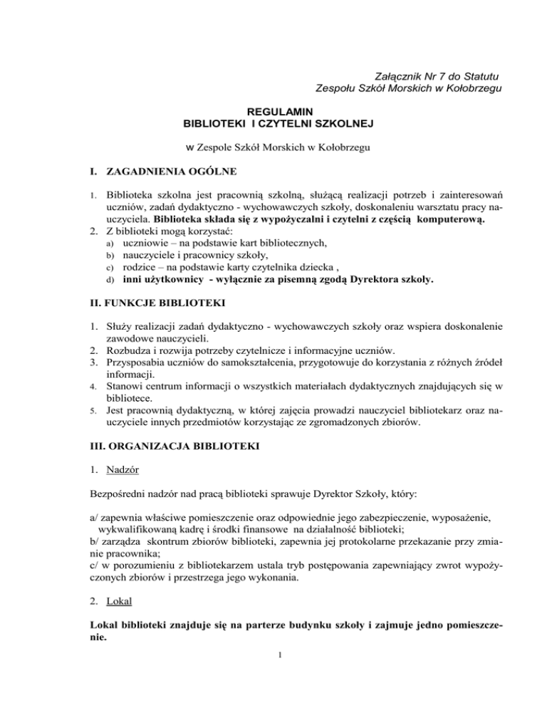 Załącznik Nr 7 do Statutu Zespołu Szkół Morskich w Kołobrzegu REGULAMIN BIBLIOTEKI I CZYTELNI SZKOLNEJ w Zespole Szkół Morskich w Kołobrzegu I. ZAGADNIENIA OGÓLNE Biblioteka szkolna jest pracownią szkolną, służącą realizacji potrzeb i zainteresowań uczniów, zadań dydaktyczno - wychowawczych szkoły, doskonaleniu warsztatu pracy nauczyciela. Biblioteka składa się z wypożyczalni i czytelni z częścią komputerową. 2. Z biblioteki mogą korzystać: a) uczniowie – na podstawie kart bibliotecznych, b) nauczyciele i pracownicy szkoły, c) rodzice – na podstawie karty czytelnika dziecka , d) inni użytkownicy - wyłącznie za pisemną zgodą Dyrektora szkoły. 1. II. FUNKCJE BIBLIOTEKI 1. Służy realizacji zadań dydaktyczno - wychowawczych szkoły oraz wspiera doskonalenie zawodowe nauczycieli. 2. Rozbudza i rozwija potrzeby czytelnicze i informacyjne uczniów. 3. Przysposabia uczniów do samokształcenia, przygotowuje do korzystania z różnych źródeł informacji. 4. Stanowi centrum informacji o wszystkich materiałach dydaktycznych znajdujących się w bibliotece. 5. Jest pracownią dydaktyczną, w której zajęcia prowadzi nauczyciel bibliotekarz oraz nauczyciele innych przedmiotów korzystając ze zgromadzonych zbiorów. III. ORGANIZACJA BIBLIOTEKI 1. Nadzór Bezpośredni nadzór nad pracą biblioteki sprawuje Dyrektor Szkoły, który: a/ zapewnia właściwe pomieszczenie oraz odpowiednie jego zabezpieczenie, wyposażenie, wykwalifikowaną kadrę i środki finansowe na działalność biblioteki; b/ zarządza skontrum zbiorów biblioteki, zapewnia jej protokolarne przekazanie przy zmianie pracownika; c/ w porozumieniu z bibliotekarzem ustala tryb postępowania zapewniający zwrot wypożyczonych zbiorów i przestrzega jego wykonania. 2. Lokal Lokal biblioteki znajduje się na parterze budynku szkoły i zajmuje jedno pomieszczenie. 1 3. Zbiory a/ biblioteka gromadzi następujące materiały: wydawnictwa informacyjne, podręczniki i programy szkolne dla nauczycieli, lektury obowiązkowe do języka polskiego i innych przedmiotów nauczania, lektury uzupełniające do języka polskiego, literaturę naukową i popularnonaukową, wybrane pozycje z literatury pięknej, wydawnictwa albumowe, prasę dla młodzieży oraz nauczycieli, podstawowe wydawnictwa z psychologii, filozofii, pedagogiki i dydaktyki różnych przedmiotów nauczania, materiały audiowizualne (programy edukacyjne na płytach CD, filmy, taśmy video, kasety magnetofonowe); b/ rozmieszczenie zbiorów : - wypożyczalnia - zawiera cały księgozbiór w układzie działowym wg UKD, - czytelnia - zawiera księgozbiór podręczny, - część komputerowa – zawiera 5 stanowisk komputerowych dla uczniów z dostępem do internetu ; c/ księgozbiór podręczny udostępnia się w czytelni i do pracowni na zajęcia. 4. Czas pracy bibliotekarza a/ biblioteka udostępnia swoje zbiory w czasie trwania zajęć dydaktycznych zgodnie z organizacją roku szkolnego, b/ czas otwarcia biblioteki ustalony jest w porozumieniu z dyrektorem szkoły i umożliwia dostęp do jej zbiorów podczas zajęć lekcyjnych i po ich zakończeniu, c/ decyzją Dyrektora Szkoły okres udostępniania zbiorów zostaje odpowiednio skrócony w czasie przeprowadzania w bibliotece skontrum. 5. Finansowanie wydatków a/ wydatki są pokrywane z budżetu szkoły, b/ wysokość kwoty przeznaczonej na potrzeby biblioteki ustalona jest na początku roku kalendarzowego. IV. ZADANIA I OBOWIĄZKI NAUCZYCIELA BIBLIOTEKARZA 1. Praca pedagogiczna W ramach pracy pedagogicznej nauczyciel bibliotekarz obowiązany jest do: a/ udostępniania zbiorów w wypożyczalni, b/ indywidualnego doradztwa w doborze lektury, 2 c/ udzielania informacji, d/ prowadzenia zajęć z przysposobienia czytelniczego i informacyjnego przy współpracy z wychowawcami i nauczycielami poszczególnych przedmiotów, e/ informowania nauczycieli i wychowawców na podstawie obserwacji pedagogicznej i prowadzonej statystyki o poziomie czytelnictwa w poszczególnych klasach, f/ prowadzenia różnorodnych form upowszechniania czytelnictwa, g/ sprawowania nadzoru nad uczniami korzystającymi z internetu. 2. Praca organizacyjno - techniczna W ramach prac organizacyjnych i technicznych nauczyciel bibliotekarz obowiązany jest do: a/ gromadzenia zbiorów - zgodnie z profilem programowym i potrzebami placówki, b/ ewidencji zbiorów - zgodnie z obowiązującymi przepisami, c/ komputerowego opracowania zbiorów -klasyfikowanie, katalogowanie, opracowanie techniczne z wykorzystaniem programu bibliotecznego OPTIVUM, d/ selekcji zbiorów, e/ organizacji udostępniania zbiorów, f/ organizacji warsztatu informacyjnego, g/ wykorzystywanie zasobów internetu do wzbogacania warsztatu informacyjnego biblioteki. 3. Obowiązki nauczyciela bibliotekarza: a/ odpowiada za stan i wykorzystanie powierzonych mu zbiorów, b/ współpracuje z wychowawcami i nauczycielami poszczególnych przedmiotów, c/ sporządza okresowe i roczne sprawozdania z pracy, d/ prowadzi dzienną, miesięczną, semestralną i roczną statystykę wypożyczeń, dziennik pracy biblioteki, księgi inwentarzowe, rejestry ubytków, ewidencję wypożyczeń, e/ tworzy komputerowy bank danych. V. PRAWA I OBOWIĄZKI CZYTELNIKÓW 1. 2. 3. 4. 5. 6. 7. 8. Czytelnicy mają prawo do bezpłatnego korzystania z biblioteki, czytelni i komputerów. Korzystający z biblioteki zobowiązani są do dbałości o wypożyczone książki. Korzystanie z księgozbioru podręcznego odbywa się tylko na miejscu w czytelni. Jednorazowo można wypożyczyć 3 książki, ale w uzasadnionych przypadkach biblioteka może ograniczyć lub zwiększyć liczbę wypożyczeń z podaniem terminu ich zwrotu. W stosunku do czytelników przetrzymujących książki mogą być zastosowane kary : prace na rzecz biblioteki, okresowe wstrzymanie wypożyczania, zatrzymanie świadectwa. W przypadku zniszczenia lub zagubienia książki czytelnik musi zwrócić taką samą pozycję albo inną wskazan