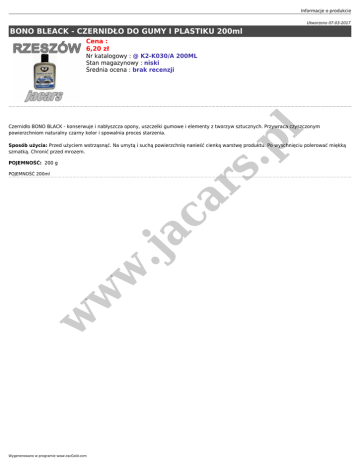 Informacje o produkcie Utworzono 07-03-2017 BONO BLEACK - CZERNIDŁO DO GUMY I PLASTIKU 200ml Cena : 6,20 zł Nr katalogowy : @ K2-K030/A 200ML Stan magazynowy : niski Średnia ocena : brak recenzji .p l Czernidło BONO BLACK - konserwuje i nabłyszcza opony, uszczelki gumowe i elementy z tworzyw sztucznych. Przywraca czyszczonym powierzchniom naturalny czarny kolor i spowalnia proces starzenia. Sposób użycia: Przed użyciem wstrząsnąć. Na umytą i suchą powierzchnię nanieść cienką warstwę produktu. Po wyschnięciu polerować miękką szmatką. Chronić przed mrozem. rs POJEMNOŚĆ: 200 g w w w .ja ca POJEMNOŚĆ 200ml Wygenerowano w programie www.oscGold.com