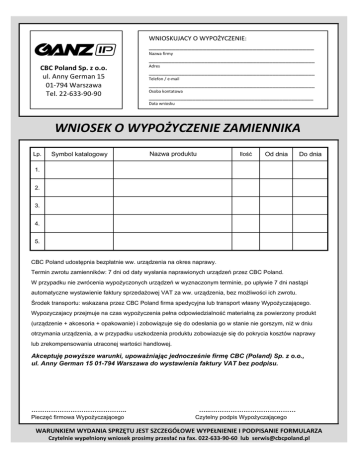 WNIOSKUJACY O WYPOŻYCZENIE: ___________________________________________ Nazwa firmy ___________________________________________________ CBC Poland Sp. z o.o. ul. Anny German 15 01‐794 Warszawa Tel. 22‐633‐90‐90 Adres ___________________________________________________ Telefon / e‐mail ___________________________________________________ Osoba kontatowa _____________________________________________________ Data wniosku WNIOSEK O WYPOŻYCZENIE ZAMIENNIKA Lp. Symbol katalogowy Nazwa produktu Ilość Od dnia Do dnia 1. 2. 3. 4. 5. CBC Poland udostępnia bezpłatnie ww. urządzenia na okres naprawy. Termin zwrotu zamienników: 7 dni od daty wysłania naprawionych urządzeń przez CBC Poland. W przypadku nie zwrócenia wypożyczonych urządzeń w wyznaczonym terminie, po upływie 7 dni nastąpi automatyczne wystawienie faktury sprzedażowej VAT za ww. urządzenia, bez możliwości ich zwrotu. Środek transportu: wskazana przez CBC Poland firma spedycyjna lub transport własny Wypożyczającego. Wypozyczajacy przejmuje na czas wypożyczenia pełna odpowiedzialność materialną za powierzony produkt (urządzenie + akcesoria + opakowanie) i zobowiązuje się do odesłania go w stanie nie gorszym, niż w dniu otrzymania urządzenia, a w przypadku uszkodzenia produktu zobowiazuje się do pokrycia kosztów naprawy lub zrekompensowania utraconej wartości handlowej. Akceptuję powyższe warunki, upoważniając jednocześnie firmę CBC (Poland) Sp. z o.o., ul. Anny German 15 01-794 Warszawa do wystawienia faktury VAT bez podpisu. …………………………………….. Pieczęć firmowa Wypożyczającego …...………………………………… Czytelny podpis Wypożyczającego WARUNKIEM WYDANIA SPRZĘTU JEST SZCZEGÓŁOWE WYPEŁNIENIE I PODPISANIE FORMULARZA Czytelnie wypełniony wniosek prosimy przesłać na fax. 022‐633‐90‐60 lub [email protected]