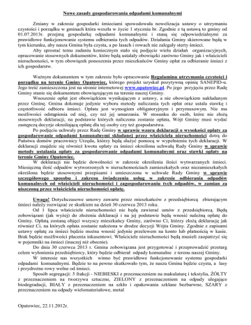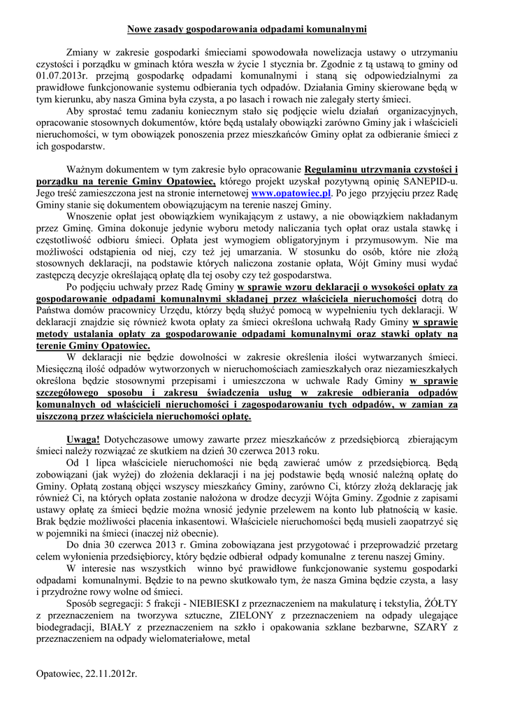 Nowe zasady gospodarowania odpadami komunalnymi Zmiany w zakresie gospodarki śmieciami spowodowała nowelizacja ustawy o utrzymaniu czystości i porządku w gminach która weszła w życie 1 stycznia br. Zgodnie z tą ustawą to gminy od 01.07.2013r. przejmą gospodarkę odpadami komunalnymi i staną się odpowiedzialnymi za prawidłowe funkcjonowanie systemu odbierania tych odpadów. Działania Gminy skierowane będą w tym kierunku, aby nasza Gmina była czysta, a po lasach i rowach nie zalegały sterty śmieci. Aby sprostać temu zadaniu koniecznym stało się podjęcie wielu działań organizacyjnych, opracowanie stosownych dokumentów, które będą ustalały obowiązki zarówno Gminy jak i właścicieli nieruchomości, w tym obowiązek ponoszenia przez mieszkańców Gminy opłat za odbieranie śmieci z ich gospodarstw. Ważnym dokumentem w tym zakresie było opracowanie Regulaminu utrzymania czystości i porządku na terenie Gminy Opatowiec, którego projekt uzyskał pozytywną opinię SANEPID-u. Jego treść zamieszczona jest na stronie internetowej www.opatowiec.pl. Po jego przyjęciu przez Radę Gminy stanie się dokumentem obowiązującym na terenie naszej Gminy. Wnoszenie opłat jest obowiązkiem wynikającym z ustawy, a nie obowiązkiem nakładanym przez Gminę. Gmina dokonuje jedynie wyboru metody naliczania tych opłat oraz ustala stawkę i częstotliwość odbioru śmieci. Opłata jest wymogiem obligatoryjnym i przymusowym. Nie ma możliwości odstąpienia od niej, czy też jej umarzania. W stosunku do osób, które nie złożą stosownych deklaracji, na podstawie których naliczona zostanie opłata, Wójt Gminy musi wydać zastępczą decyzje określającą opłatę dla tej osoby czy też gospodarstwa. Po podjęciu uchwały przez Radę Gminy w sprawie wzoru deklaracji o wysokości opłaty za gospodarowanie odpadami komunalnymi składanej przez właściciela nieruchomości dotrą do Państwa domów pracownicy Urzędu, którzy będą służyć pomocą w wypełnieniu tych deklaracji. W deklaracji znajdzie się również kwota opłaty za śmieci określona uchwałą Rady Gminy w sprawie metody ustalania opłaty za gospodarowanie odpadami komunalnymi oraz stawki opłaty na terenie Gminy Opatowiec. W deklaracji nie będzie dowolności w zakresie określenia ilości wytwarzanych śmieci. Miesięczną ilość odpadów wytworzonych w nieruchomościach zamieszkałych oraz niezamieszkałych określona będzie stosownymi przepisami i umieszczona w uchwale Rady Gminy w sprawie szczegółowego sposobu i zakresu świadczenia usług w zakresie odbierania odpadów komunalnych od właścicieli nieruchomości i zagospodarowaniu tych odpadów, w zamian za uiszczoną przez właściciela nieruchomości opłatę. Uwaga! Dotychczasowe umowy zawarte przez mieszkańców z przedsiębiorcą zbierającym śmieci należy rozwiązać ze skutkiem na dzień 30 czerwca 2013 roku. Od 1 lipca właściciele nieruchomości nie będą zawierać umów z przedsiębiorcą. Będą zobowiązani (jak wyżej) do złożenia deklaracji i na jej podstawie będą wnosić należną opłatę do Gminy. Opłatą zostaną objęci wszyscy mieszkańcy Gminy, zarówno Ci, którzy złożą deklarację jak również Ci, na których opłata zostanie nałożona w drodze decyzji Wójta Gminy. Zgodnie z zapisami ustawy opłatę za śmieci będzie można wnosić jedynie przelewem na konto lub płatnością w kasie. Brak będzie możliwości płacenia inkasentowi. Właściciele nieruchomości będą musieli zaopatrzyć się w pojemniki na śmieci (inaczej niż obecnie). Do dnia 30 czerwca 2013 r. Gmina zobowiązana jest przygotować i przeprowadzić przetarg celem wyłonienia przedsiębiorcy, który będzie odbierał odpady komunalne z terenu naszej Gminy. W interesie nas wszystkich winno być prawidłowe funkcjonowanie systemu gospodarki odpadami komunalnymi. Będzie to na pewno skutkowało tym, że nasza Gmina będzie czysta, a lasy i przydrożne rowy wolne od śmieci. Sposób segregacji: 5 frakcji - NIEBIESKI z przeznaczeniem na makulaturę i tekstylia, ŻÓŁTY z przeznaczeniem na tworzywa sztuczne, ZIELONY z przeznaczeniem na odpady ulegające biodegradacji, BIAŁY z przeznaczeniem na szkło i opakowania szklane bezbarwne, SZARY z przeznaczeniem na odpady wielomateriałowe, metal Opatowiec, 22.11.2012r.