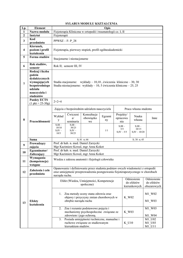 Lp. 1 2 3 4 5 6 7 Element Nazwa modułu Instytut Kod przedmiotu Kierunek, poziom i profil kształcenia Forma studiów Rok studiów, semestr Rodzaj i liczba godzin dydaktycznych wymagających bezpośredniego udziału nauczyciela i studentów Punkty ECTS (1 pkt = 25-30g) SYLABUS MODUŁU KSZTAŁCENIA Opis Fizjoterapia Kliniczna w ortopedii i traumatologii cz. I, II Fizjoterapii PPWSZ – F- P_28 Fizjoterapia, pierwszy stopień, profil ogólnoakademicki Stacjonarne i niestacjonarne Rok II; semestr III, IV Studia stacjonarne: wykłady – 10,10 , ćwiczenia kliniczne – 30, 30 Studia niestacjonarne: wykłady – 10, 5 ćwiczenia kliniczne – 25, 25 2+2=4 Zajęcia z bezpośrednim udziałem nauczyciela 8 9 10 11 12 13 Pracochłonność Suma Prowadzący zajęcia Egzaminator/ Zaliczający Wymagania (kompetencje) wstępne Założenia i cele przedmiotu Efekty kształcenia Wykład y Ćwiczeni a/ seminaria S;III – 10/10 S;IV – 10/5 S;III – 30/25 S;IV – 30/25 Konsultacje obowiązko we Egzami ny 1/1 Praca własna studenta Projekty/ opracowa nia Nauka własna S;III – 5/5 S;IV – 5/5 S;III – 10/15 S;IV – 10/20 S; 81 n; 66 Inne S; 30 n; 45 Prof. dr hab. n. med. Daniel Zarzycki Mgr Kazimierz Kowal, mgr Anna Kokot Prof. dr hab. n. med. Daniel Zarzycki Mgr Kazimierz Kowal, mgr Anna Kokot Wiedza z zakresu anatomii i fizjologii człowieka Opanowanie i definiowanie przez studenta podstaw owych wiadomości z ortopedii oraz umiejętność przeprowadzenia postępowania fizjoterapeutycznego w chorobach narządu ruchu. Odniesienie Odniesienie Efekt (Wiedza, Umiejętności, Kompetencje do efektów do efektów społeczne) kierunkowych obszarowych 1. Zna metody oceny stanu zdrowia oraz objawy i przyczyny zmian chorobowych w obrębie narządu ruchu 2. Zna i rozumie podstawowe pojęcia i mechanizmy psychospołeczne związane ze zdrowiem i jego ochroną. 3. Posiada umiejętności techniczne, manualne i ruchowe związane ze studiowanym kierunkiem studiów. M1_W02 K_W02 M1_W03 M1_W03 K_W03 K_U10 M1_W04 M1_U02 M1_U03 M1_U11 4. Potrafi podjąć działania diagnostyczne, profilaktyczne, pielęgnacyjne, terapeutyczne i edukacyjne odpowiadające potrzebą jednostki oraz grupy społeczne właściwe dla studiowanego kierunku studiów K_U04 5. Rozumie potrzebę uczenia się przez całe życie. K_K01 M1_K01 6. Potrafi współdziałać w grupie, przyjmując w niej różne role. K_K03 M1_K02 M1_K04 M1_K05 Efekt kształcenia 14 15 16 Forma i warunki potwierdzenia efektu kształcenia Stosowane metody dydaktyczne Treści merytoryczne przedmiotu M1_U03 M1_U04 M1_U05 Sposób potwierdzenia (weryfikacji) Wiedza Kolokwium, testy sprawdzające, zaliczenie, egzamin Umiejętności przedstawienie prezentacji ustnej; dyskusje ćwiczeniowe; dyskusje w grupach tematycznych; wypowiedzi ustne podczas zajęć; omawianie determinant wybranych zagadnień związanych z fizjoterapią; Kompetencje społeczne ocena sposobu zachowania studenta; ocena prezentacji i wypowiedzi w trakcie zajęć praktycznych; wykorzystanie i prezentowanie danych liczbowych, jako podstawy analiz i ilustracji problemów badawczych; znajomość przepisów prawnych; aktywność na zajęciach; Wykład informacyjny, wykład problemowy, ćwiczenia, dyskusja, samokształcenie. A. Wykłady: Rola fizjoterapii w chorobach narządu ruchu (ortopiedii. Wskazania i przeciwskazania do stosowania usprawniania leczniczego. Fizjopatologia narządu ruchu: kości, stawy, mięśnie (nazewnictwo). Badanie ortopedyczne narządu ruchu. Zabiegi ortopedyczne w fizjoterpii: wyciągi, redresje, opatrunki gipsowe. Zaopatrzenie ortopedyczne. Wady wrodzone narządu ruchu: kończyn górnych i dolnych, dysplazje biodra, zwichnięcie biodra, stopa końsko-szpotawa. Leczenie zachowawcze i operacyjne. Wady w obrębie szyi i tułowia: kręcz karku, choroba Klippel- Feila, choroba Sprengla, klatka piersiowa kurza i klatka piersiowa lejkowata. Deformacje kręgosłupa: skrzywienie wrodzone, skrzywienie boczne idiopatyczne, neuromięśniowe. Deformacje kręgosłupa: kręgozmyki, choroba Scheuermanna. Zaopatrzenie ortopedyczne w deformacjach kręgosłupa. Wady postawy: postawa wadliwa, zasady badania, leczenie. Martwice kości: choroba Perthesa, choroba Osgood-Schlattera, Choroba Blounta, choroba Haglunda, choroba Kohlera Fizjoterapia w chorobach mięśniowych: miopatie, atrofie, miastenia. Zmiany zwyrodnieniowo-zniekształcające stawów ( etiologia, występowanie, patomechanika). B. Ćwiczenia: Badanie ortopedyczne: wywiad, badanie fizykalne, badaniem zakresów ruchu, testowanie grup mięśniowych. Elementy badania neurologicznego. Testy funkcjonalne i czynnościowe w badaniu narządu ruchu. Wpływ bezczynności na organizm człowieka. Usprawnianie chorego z unieruchomieniem odcinkowym, usprawnianie unieruchomionego w łóżku. Fizjoterapia chorych ze zmianami zwyrodnieniowo- zniekształcającymi stawu biodrowego. Fizjoterapia chorych ze zmianami zwyrodnieniowo- zniekształcającymi stawu kolanowego. Usprawnianie chorych po endoprotezoplastyce kolana. Choroba Osgood- Schlattera. Choroba Blauta. Koślawość i szpotawość kolan. Chondromalacja rzepki. Przyczyny, rozpoznawanie oraz profilaktyka zespołów bólowych kręgosłupa lędźwiowego. Fizjoterapia chorych z bólami kręgosłupa lędźwiowego. Dyskopatia. Stenoza kanału kręgowego. Przyczyny, rozpoznanie oraz profilaktyka zespołów bólowych kręgosłupa szyjnego. Fizjoterapia chorych z bólami kręgosłup[a szyjnego, zmiany kręgosłupa szyjnego, dyskopatia. Przyczyny oraz rozeznanie zespołów bólowych barku, diagnostyka, rehabilitacja z zespołami bólowymi barku. Schorzenia metaboliczne kości: osteoporoza, osteomalacja, krzywica, fizjoterapia chorych z osteoporozą. Boczne idiopatyczne skrzywienie kręgosłupa, diagnostyka i rehabilitacja. Choroba Scheuermanna, diagnostyka i rehabilitacja. Kręcz karku- przyczyny, objawy, leczenie i rehabilitacja. Wrodzona dysplazja i zwichnięcie biodra, choroba Perthesa, rehabilitacja. Klatka piersiowa 