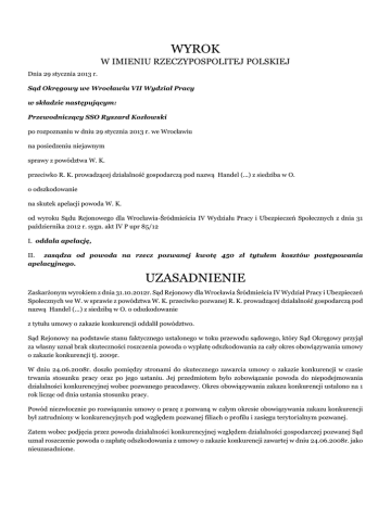 WYROK W IMIENIU RZECZYPOSPOLITEJ POLSKIEJ Dnia 29 stycznia 2013 r. Sąd Okręgowy we Wrocławiu VII Wydział Pracy w składzie następującym: Przewodniczący SSO Ryszard Kozłowski po rozpoznaniu w dniu 29 stycznia 2013 r. we Wrocławiu na posiedzeniu niejawnym sprawy z powództwa W. K. przeciwko R. K. prowadzącej działalność gospodarczą pod nazwą Handel (...) z siedziba w O. o odszkodowanie na skutek apelacji powoda W. K. od wyroku Sądu Rejonowego dla Wrocławia-Śródmieścia IV Wydziału Pracy i Ubezpieczeń Społecznych z dnia 31 października 2012 r. sygn. akt IV P upr 85/12 I. oddala apelację, II. zasądza od powoda na rzecz pozwanej kwotę 450 zł tytułem kosztów postępowania apelacyjnego. UZASADNIENIE Zaskarżonym wyrokiem z dnia 31.10.2012r. Sąd Rejonowy dla Wrocławia Śródmieścia IV Wydział Pracy i Ubezpieczeń Społecznych we W. w sprawie z powództwa W. K. przeciwko pozwanej R. K. prowadzącej działalność gospodarczą pod nazwą Handel (...) z siedzibą w O. o odszkodowanie z tytułu umowy o zakazie konkurencji oddalił powództwo. Sąd Rejonowy na podstawie stanu faktycznego ustalonego w toku przewodu sądowego, który Sąd Okręgowy przyjął za własny uznał brak skuteczności roszczenia powoda o wypłatę odszkodowania za cały okres obowiązywania umowy o zakazie konkurencji tj. 2009r. W dniu 24.06.2008r. doszło pomiędzy stronami do skutecznego zawarcia umowy o zakazie konkurencji w czasie trwania stosunku pracy oraz po jego ustaniu. Jej przedmiotem było zobowiązanie powoda do niepodejmowania działalności konkurencyjnej wobec pozwanego pracodawcy. Okres obowiązywania zakazu konkurencji ustalono na 1 rok licząc od dnia ustania stosunku pracy. Powód niezwłocznie po rozwiązaniu umowy o pracę z pozwaną w całym okresie obowiązywania zakazu konkurencji był zatrudniony w konkurencyjnych pod względem pozwanej filiach o profilu i zasięgu terytorialnym pozwanej. Zatem wobec podjęcia przez powoda działalności konkurencyjnej względem działalności gospodarczej pozwanej Sąd uznał roszczenie powoda o zapłatę odszkodowania z umowy o zakazie konkurencji zawartej w dniu 24.06.2008r. jako nieuzasadnione. Od powyższego wyroku apelację wniósł powód opierając ją na zarzutach naruszenia przepisów prawa procesowego tj. art. 233 § 1 kpc, art. 227 kpc oraz prawa materialnego tj. art. 1012 § 2 kp. W związku z powyższymi zarzutami wniósł o zmianę zaskarżonego wyroku i zasądzenie od pozwanej na rzecz powoda kwotę 7.927,61 zł względnie jego uchylenie z przekazaniem sprawy Sądowi I instancji do ponownego rozpoznania. Nie zgadzając się ze stanowiskiem Sądu Rejonowego twierdził, że został zatrudniony w przedsiębiorstwie męża pozwanej za jej zgodą i wiedzą, które nie są wobec siebie konkurencyjne. Z kolei w dacie zatrudnienia w Spółce (...) zakaz konkurencji już nie obowiązywał. Pozwana w odpowiedzi na apelację wniosła o jej oddalenie. Sąd Okręgowy zważył co następuje: Zarzuty i argumenty apelacji nie uzasadniają uznania, że orzeczenie Sądu Rejonowego, którym oddalono powództwo powoda o odszkodowanie jest wadliwe i narusza przepisy prawa co uzasadniałoby apelację. Stwierdzić przede wszystkim należy że Sąd Rejonowy orzekając w sprawie przeprowadził właściwe postępowanie dowodowe w zakresie roszczenia zgłoszonego przez powoda wyjaśniając wszystkie istotne okoliczności sprawy będące podstawą ustaleń faktycznych wydanego w sprawie wyroku. Wyciągnął też prawidłowe wnioski z ustaleń, które poczynił. Z tych przyczyn Sąd Okręgowy podziela pogląd jak i argumenty zawarte w uzasadnieniu zaskarżonego wyroku, że powód zważywszy na uregulowanie prawne określone w przepisach art. 1011 § 1 kp, art. 1012 kp był od chwili zawartej w dniu 24.06.2008r. umowy objęty zakazem konkurencji w czasie trwania stosunku pracy jak i po ustaniu tego stosunku. Z dniem 31.12.2008r. umowa powoda z pozwaną rozwiązała się. Powód niezwłocznie po rozwiązaniu umowy o pracę z pozwaną w całym okresie obowiązywania umowy o zakazie konkurencji był zatrudniony w konkurencyjnych względem pozwanej firmach o profilu i zasięgu terytorialnym pozwanej. Okres obowiązywania zakazu konkurencji ustalono na 1 rok licząc od dnia ustania stosunku pracy. Powód w okresie od 2.01.2009r. do 30.06.2009r. zatrudniony był jako przedstawiciel handlowy w firmie (...) zaś od dnia 8.07.2009r. do 1.03.2010r. w (...) Spółka z o.o. w Ż. na stanowisku przedstawiciela handlowego na obszarze W.. Prawidłowo więc Sąd Rejonowy przyjął, że zatrudnienie podjęte przez powoda po dacie rozwiązania umowy o pracę z pozwaną miało charakter działalności konkurencyjnej. Brak było przy tym argumentów prawnych na to, że powód został zwolniony z zakazu konkurencji jak też że w chwili podjęcia zatrudnienia w podmiotach konkurencyjnych taki zakaz go nie obowiązywał. W niniejszej sprawie Sąd Rejonowy zbadał podstawę materialną pozwu, a swoim rozstrzygnięciem odniósł się do tego co było przedmiotem sprawcy czyli naruszenia zakazu konkurencji wynikającego z umowy z dnia 24.06.2008r. Nie można więc było twierdzić że Sąd Rejonowy nie rozpoznał istoty sprawy. Chybione były również zarzuty dotyczące braku obowiązywania umowy o zakazie konkurencji w dacie podjęcia zatrudnienia w dniu 8.07.2009r. z uwagi na nie wypłacenie przez pozwaną odszkodowania. Nie wywiązanie się bowiem pracodawcy z obowiązku wypłaty odszkodowania musi być skutkiem okoliczności za które ponosi on odpowiedzialność czego jednak powód w niniejszym procesie nie wykazał. W sprawie strony nie ustaliły w umowie terminu wypłaty odszkodowania, powód nie odstąpił od umowy i nie wzywał pozwanej do wypłaty odszkodowania. W takim przypadku przepis art. 1012 § 2 kp nie stwarzał dla powoda możliwości podjęcia działalności konkurencyjnej. Mając powyższe na uwadze Sąd Okręgowy z mocy przepisu art. 385 kpc orzekł o 