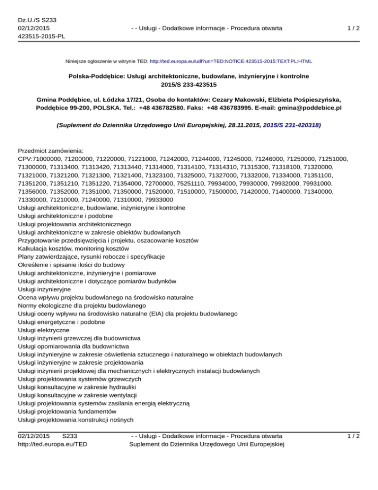 Dz.U./S S233 02/12/2015 423515-2015-PL - - Usługi - Dodatkowe informacje - Procedura otwarta 1/2 Niniejsze ogłoszenie w witrynie TED: http://ted.europa.eu/udl?uri=TED:NOTICE:423515-2015:TEXT:PL:HTML Polska-Poddębice: Usługi architektoniczne, budowlane, inżynieryjne i kontrolne 2015/S 233-423515 Gmina Poddębice, ul. Łódzka 17/21, Osoba do kontaktów: Cezary Makowski, Elżbieta Pośpieszyńska, Poddębice 99-200, POLSKA. Tel.: +48 436782580. Faks: +48 436783995. E-mail: [email protected] (Suplement do Dziennika Urzędowego Unii Europejskiej, 28.11.2015, 2015/S 231-420318) Przedmiot zamówienia: CPV:71000000, 71200000, 71220000, 71221000, 71242000, 71244000, 71245000, 71246000, 71250000, 71251000, 71300000, 71313400, 71313420, 71313440, 71314000, 71314100, 71314310, 71315300, 71318100, 71320000, 71321000, 71321200, 71321300, 71321400, 71323100, 71325000, 71327000, 71332000, 71334000, 71351100, 71351200, 71351210, 71351220, 71354000, 72700000, 75251110, 79934000, 79930000, 79932000, 79931000, 71356000, 71352000, 71351000, 71350000, 71520000, 71510000, 71500000, 71420000, 71400000, 71340000, 71330000, 71210000, 71240000, 71310000, 79933000 Usługi architektoniczne, budowlane, inżynieryjne i kontrolne Usługi architektoniczne i podobne Usługi projektowania architektonicznego Usługi architektoniczne w zakresie obiektów budowlanych Przygotowanie przedsięwzięcia i projektu, oszacowanie kosztów Kalkulacja kosztów, monitoring kosztów Plany zatwierdzające, rysunki robocze i specyfikacje Określenie i spisanie ilości do budowy Usługi architektoniczne, inżynieryjne i pomiarowe Usługi architektoniczne i dotyczące pomiarów budynków Usługi inżynieryjne Ocena wpływu projektu budowlanego na środowisko naturalne Normy ekologiczne dla projektu budowlanego Usługi oceny wpływu na środowisko naturalne (EIA) dla projektu budowlanego Usługi energetyczne i podobne Usługi elektryczne Usługi inżynierii grzewczej dla budownictwa Usługi opomiarowania dla budownictwa Usługi inżynieryjne w zakresie oświetlenia sztucznego i naturalnego w obiektach budowlanych Usługi inżynieryjne w zakresie projektowania Usługi inżynierii projektowej dla mechanicznych i elektrycznych instalacji budowlanych Usługi projektowania systemów grzewczych Usługi konsultacyjne w zakresie hydrauliki Usługi konsultacyjne w zakresie wentylacji Usługi projektowania systemów zasilania energią elektryczną Usługi projektowania fundamentów Usługi projektowania konstrukcji nośnych 02/12/2015 S233 http://ted.europa.eu/TED - - Usługi - Dodatkowe informacje - Procedura otwarta Suplement do Dziennika Urzędowego Unii Europejskiej 1/2 Dz.U./S S233 02/12/2015 423515-2015-PL - - Usługi - Dodatkowe informacje - Procedura otwarta 2/2 Geotechniczne usługi inżynieryjne Mechaniczne i elektryczne usługi inżynieryjne Usługi przygotowania i analizy podłoża Geologiczne i geofizyczne usługi doradcze Geofizyczne usługi doradcze Geologiczne usługi doradcze Usługi sporządzania map Usługi w zakresie sieci komputerowej Usługi ochrony przeciwpożarowej Usługi projektowania mebli Specjalne usługi projektowe Usługi projektowania wnętrz Usługi dekoracji wnętrz Usługi techniczne Usługi badania podłoża Usługi planowania geologicznego, geofizycznego i inne usługi naukowe Usługi inżynieryjne naukowe i techniczne Usługi nadzoru budowlanego Usługi badania terenu Usługi związane z budownictwem Architektoniczne usługi zagospodarowania terenu Usługi architektoniczne dotyczące planowania przestrzennego i zagospodarowania terenu Zintegrowane usługi inżynieryjne Różne usługi inżynieryjne Doradcze usługi architektoniczne Usługi architektoniczne, inżynieryjne i planowania Doradcze usługi inżynieryjne i budowlane Usługi towarzyszące usługom projektowym Zamiast: II.1.1) Nazwa nadana zamówieniu przez instytucję zamawiającą: Opracowanie dokumentacji projektowo – kosztorysowej wraz z niezbędnymi uzgodnieniami do uzbrojenia terenu dla potrzeb budowy kompleksu pn. „Przeciw wykluczeniu – Kraina Bez Barier w Poddębicach – rewitalizacja kompleksu geotermalnego” przy ul. Mickiewicza nr 19. Powinno być: II.1.1) Nazwa nadana zamówieniu przez instytucję zamawiającą: Opracowanie dokumentacji projektowo-kosztorysowej dla potrzeb budowy przedsięwzięcia pn. „Przeciw wykluczeniu – Kraina Bez Barier w Poddębicach – rewitalizacja kompleksu geotermalnego” przy, ul. Mickiewicza nr 19. 02/12/2015 S233 http://ted.europa.eu/TED - - Usługi - Dodatkowe informacje - Procedura otwarta Suplement do Dziennika Urzędowego Unii Europejskiej 2/2