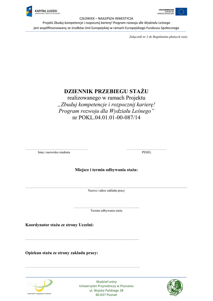 CZŁOWIEK – NAJLEPSZA INWESTYCJA Projekt Zbuduj kompetencje i rozpocznij karierę! Program rozwoju dla Wydziału Leśnego jest współfinansowany ze środków Unii Europejskiej w ramach Europejskiego Funduszu Społecznego Załącznik nr 5 do Regulaminu płatnych staży DZIENNIK PRZEBIEGU STAŻU realizowanego w ramach Projektu „Zbuduj kompetencje i rozpocznij karierę! Program rozwoju dla Wydziału Leśnego” nr POKL.04.01.01-00-087/14 ………………………………...………………………. ……………………..……………. Imię i nazwisko studenta PESEL Miejsce i termin odbywania stażu: ………………………………………………………………….............................................................................................................................. Nazwa i adres zakładu pracy ………………………………………………………....... Termin odbywania stażu Koordynator stażu ze strony Uczelni: …………………………………………………………....................................................................... Opiekun stażu ze strony zakładu pracy: ………………………………………………………………………………………………………… Wydział Leśny Uniwersytet Przyrodniczy w Poznaniu ul. Wojska Polskiego 28 60-637 Poznań CZŁOWIEK – NAJLEPSZA INWESTYCJA Projekt Zbuduj kompetencje i rozpocznij karierę! Program rozwoju dla Wydziału Leśnego jest współfinansowany ze środków Unii Europejskiej w ramach Europejskiego Funduszu Społecznego LISTA OBECNOŚCI NA STAŻU Dzień Data Liczba godzin imię i nazwisko Stażysty/ki 1 2 3 4 5 6 7 8 9 10 11 12 13 14 15 16 17 18 19 20 21 22 23 24 25 26 27 28 29 30 31 ……………………………………………… …………………………………… Data i podpis Opiekuna Stażu Pieczęć firmowa Wydział Leśny Uniwersytet Przyrodniczy w Poznaniu ul. Wojska Polskiego 28 60-637 Poznań CZŁOWIEK – NAJLEPSZA INWESTYCJA Projekt Zbuduj kompetencje i rozpocznij karierę! Program rozwoju dla Wydziału Leśnego jest współfinansowany ze środków Unii Europejskiej w ramach Europejskiego Funduszu Społecznego LISTA OBECNOŚCI NA STAŻU Dzień Data Liczba godzin imię i nazwisko Stażysty/ki 1 2 3 4 5 6 7 8 9 10 11 12 13 14 15 16 17 18 19 20 21 22 23 24 25 26 27 28 29 30 31 ……………………………………………… …………………………………… Data i podpis Opiekuna Stażu Pieczęć firmowa Wydział Leśny Uniwersytet Przyrodniczy w Poznaniu ul. Wojska Polskiego 28 60-637 Poznań CZŁOWIEK – NAJLEPSZA INWESTYCJA Projekt Zbuduj kompetencje i rozpocznij karierę! Program rozwoju dla Wydziału Leśnego jest współfinansowany ze środków Unii Europejskiej w ramach Europejskiego Funduszu Społecznego KARTA TYGODNIOWA Data Godziny pracy od - do Wykonywane czynności; uwagi; obserwacje; wnioski stażysty Potwierdzam wykonanie wyżej wymienionych czynności …………………………………………….…………………………………………………………… Podpis Opiekuna Stażu ze strony Pracodawcy Wydział Leśny Uniwersytet Przyrodniczy w Poznaniu ul. Wojska Polskiego 28 60-637 Poznań CZŁOWIEK – NAJLEPSZA INWESTYCJA Projekt Zbuduj kompetencje i rozpocznij karierę! Program rozwoju dla Wydziału Leśnego jest współfinansowany ze środków Unii Europejskiej w ramach Europejskiego Funduszu Społecznego KARTA TYGODNIOWA Data Godziny pracy od - do Wykonywane czynności; uwagi; obserwacje; wnioski stażysty Potwierdzam wykonanie wyżej wymienionych czynności …………………………………………….…………………………………………………………… Podpis Opiekuna Stażu ze strony Pracodawcy Wydział Leśny Uniwersytet Przyrodniczy w Poznaniu ul. Wojska Polskiego 28 60-637 Poznań CZŁOWIEK – NAJLEPSZA INWESTYCJA Projekt Zbuduj kompetencje i rozpocznij karierę! Program rozwoju dla Wydziału Leśnego jest współfinansowany ze środków Unii Europejskiej w ramach Europejskiego Funduszu Społecznego KARTA TYGODNIOWA Data Godziny pracy od - do Wykonywane czynności; uwagi; obserwacje; wnioski stażysty Potwierdzam wykonanie wyżej wymienionych czynności …………………………………………….…………………………………………………………… Podpis Opiekuna Stażu ze strony Pracodawcy Wydział Leśny Uniwersytet Przyrodniczy w Poznaniu ul. Wojska Polskiego 28 60-637 Poznań CZŁOWIEK – NAJLEPSZA INWESTYCJA Projekt Zbuduj kompetencje i rozpocznij karierę! Program rozwoju dla Wydziału Leśnego jest współfinansowany ze środków Unii Europejskiej w ramach Europejskiego Funduszu Społecznego KARTA TYGODNIOWA Data Godziny pracy od - do Wykonywane czynności; uwagi; obserwacje; wnioski stażysty Potwierdzam wykonanie wyżej wymienionych czynności …………………………………………….…………………………………………………………… Podpis Opiekuna Stażu ze strony Pracodawcy Wydział Leśny Uniwersytet Przyrodniczy w Poznaniu ul. Wojska Polskiego 28 60-637 Poznań CZŁOWIEK – NAJLEPSZA INWESTYCJA Projekt Zbuduj kompetencje i rozpocznij karierę! Program rozwoju dla Wydziału Leśnego jest współfinansowany ze środków Unii Europejskiej w ramach Europejskiego Funduszu Społecznego KARTA TYGODNIOWA Data Godziny pracy od - do Wykonywane czynności; uwagi; obserwacje; wnioski stażysty Potwierdzam wykonanie wyżej wymienionych czynności …………………………………………….…………………………………………………………… Podpis Opiekuna Stażu ze strony Pracodawcy Wydział Leśny Uniwersytet Przyrodniczy w Poznaniu ul. Wojska Polskiego 28 60-637 Poznań CZŁOWIEK – NAJLEPSZA INWESTYCJA Projekt Zbuduj kompetencje i rozpocznij karierę! Program rozwoju dla Wydziału Leśnego jest współfinansowany ze środków Unii Europejskie