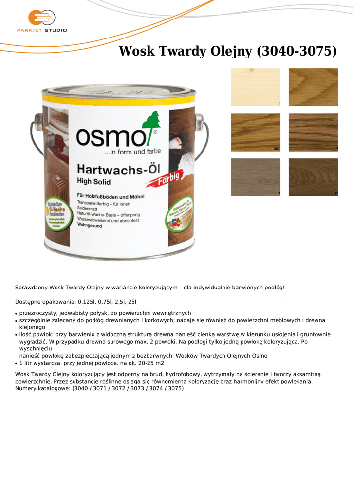 Wosk Twardy Olejny (3040-3075) Sprawdzony Wosk Twardy Olejny w wariancie koloryzującym – dla indywidualnie barwionych podłóg! Dostępne opakowania: 0,125l, 0,75l, 2,5l, 25l ● ● ● ● przezroczysty, jedwabisty połysk, do powierzchni wewnętrznych szczególnie zalecany do podłóg drewnianych i korkowych; nadaje się również do powierzchni meblowych i drewna klejonego ilość powłok: przy barwieniu z widoczną strukturą drewna nanieść cienką warstwę w kierunku usłojenia i gruntownie wygładzić. W przypadku drewna surowego max. 2 powłoki. Na podłogi tylko jedną powłokę koloryzującą. Po wyschnięciu nanieść powłokę zabezpieczającą jednym z bezbarwnych Wosków Twardych Olejnych Osmo 1 litr wystarcza, przy jednej powłoce, na ok. 20-25 m2 Wosk Twardy Olejny koloryzujący jest odporny na brud, hydrofobowy, wytrzymały na ścieranie i tworzy aksamitną powierzchnię. Przez substancje roślinne osiąga się równomierną koloryzację oraz harmonijny efekt powlekania. Numery katalogowe: (3040 / 3071 / 3072 / 3073 / 3074 / 3075)