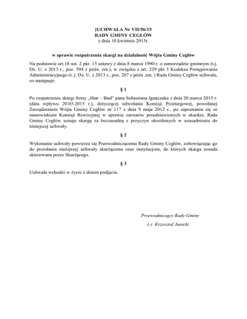 ]UCHWAŁA Nr VII/56/15 RADY GMINY CEGŁÓW z dnia 10 kwietnia 2015r. w sprawie rozpatrzenia skargi na działalność Wójta Gminy Cegłów Na podstawie art.18 ust. 2 pkt. 15 ustawy z dnia 8 marca 1990 r. o samorządzie gminnym (t.j. Dz. U. z 2013 r., poz. 594 z późn. zm.), w związku z art. 229 pkt 3 Kodeksu Postępowania Administracyjnego (t. j. Dz. U. z 2013 r., poz. 267 z późn .zm. ) Rada Gminy Cegłów uchwala, co następuje: §1 Po rozpatrzeniu skargi firmy „Han – Bud” pana Sebastiana Ignaczaka z dnia 20 marca 2015 r. (data wpływu 20.03.2015 r.), dotyczącej odwołania Komisji Przetargowej, powołanej Zarządzeniem Wójta Gminy Cegłów nr 117 z dnia 9 maja 2012 r., po zapoznaniu się ze stanowiskiem Komisji Rewizyjnej w sprawie zarzutów przedstawionych w skardze, Rada Gminy Cegłów uznaje skargę za bezzasadną z przyczyn określonych w uzasadnieniu do niniejszej uchwały. §2 Wykonanie uchwały powierza się Przewodniczącemu Rady Gminy Cegłów, zobowiązując go do przesłania niniejszej uchwały skarżącemu oraz instytucjom, do których skarga została skierowana przez Skarżącego. §3 Uchwała wchodzi w życie z dniem podjęcia. Przewodniczący Rady Gminy (-) Krzysztof Janicki Uzasadnienie: Ustawa z dnia 8 marca 1990 r. o samorządzie gminnym (Dz. U. z 2013 r., poz. 594 z późn. zm.) w art. 30 ust. 1 stanowi, iż wójt wykonuje uchwały rady gminy i zadania gminy określone przepisami prawa. Z kolei z treści ust. 2 pkt 3 w/w artykułu wynika, że do zadań wójta należy w szczególności gospodarowanie mieniem komunalnym. W realizacji zaś zadań własnych gminy wójt podlega wyłącznie radzie gminy (tak art. 30 ust. 3 ustawy z dnia 8 marca 1990 roku o samorządzie gminnym). Rada Gminy Cegłów uchwałą Nr XXXIV/ 256 /13 z dnia 23 maja 2013 r. w sprawie stanowienia o kierunkach działania Wójta Gminy Cegłów w procedurze przygotowania nieruchomości położonej w Cegłowie, stanowiącej własność komunalną Gminy Cegłów, do wydzierżawienia lub zbycia wyraziła zgodę na uporządkowanie kwestii nieruchomości położonych w Cegłowie przy ul. Dobrzyckiego 5, której dotyczy skarga. Przedmiotowa nieruchomość stanowi teren po byłej Spółdzielni Kółek Rolniczych w Cegłowie. W dniu 29 sierpnia 2013 r. Rada Gminy Cegłów podjęła uchwały Nr XXXVI/291/13 i Nr XXXVI/293/13 w sprawie wyrażenia zgody na zbycie w drodze przetargu publicznego nieruchomości położonych w miejscowości Cegłów, stanowiących własność Gminy Cegłów. Obie w/w uchwały dotyczyły wyrażenia zgody na zbycie nieruchomości przy ul. Dobrzyckiego 5 w Cegłowie stanowiących przedmiot skargi. Wykonując uchwały Rady Gminy Cegłów, o których mowa powyżej, w dniu 24 września 2014 r. Wójt Gminy Cegłów ogłosił przetarg ustny, nieograniczony na zbycie nieruchomości gruntowych zabudowanych, położonych w Cegłowie przy ul. Dobrzyckiego 5. Termin przetargu wyznaczony został na dzień 28 października 2014 r. W dniu 27 października 2014 r. Wójt Gminy Cegłów stwierdził demontaż jednego z budynków, posadowionych na nieruchomości przeznaczonej do sprzedaży, który obejmował m.in. wymontowanie okien, drzwi i dachu. Powyższa okoliczność zgłoszona została do Komisariatu Policji w Mrozach. Uszkodzenie budynku spowodowało zmianę wartości zbywanej nieruchomości. W związku z powyższym Wójt Gminy Cegłów postanowił odwołać ogłoszony przetarg na zbycie nieruchomości i dokonać ponownej wyceny nieruchomości zabudowanej. Ogłoszenie o odwołaniu przetargu ukazało się na stronie Biuletynu Informacji Publicznej (BIP) Cegłowa w dniu 27 października 2014 r. O odwołaniu przetargu zostali również powiadomieni oferenci, którzy wpłacili wadium - zgodnie z regulaminem przetargu. W dniu 20 marca 2015 r. p. Sebastian Ignaczak wniósł wniosek w trybie skargi o odwołanie Komisji Przetargowej powołanej Zarządzeniem Wójta Gminy Cegłów nr 117 z dnia 9 maja 2012 r. Wójt Gminy Cegłów w dniu 23 marca 2015 r., przekazał skargę Radzie Gminy Cegłów w trybie art. 231 w zw. z art. 229 pkt 3 ustawy z dnia 14 czerwca 1960 r. Kodeks postępowania administracyjnego (Dz.U.2013.267 j.t.). 19 marca 2015 r. Przewodniczący Rady Gminy przekazał otrzymaną dokumentację Komisji Rewizyjnej Rady Gminy. Zgodnie z treścią § 8 ust. 2 rozporządzenia Rady Ministrów z dnia 14 września 2004 roku w sprawie sposobu i trybu przeprowadzenia przetargów oraz rokowań na zbycie nieruchomości (Dz.U.2014.1490 j.t.) przewodniczącego oraz członków komisji przetargowej w składzie od 3 do 7 osób wyznacza właściwy organ spośród osób dających rękojmię rzetelnego przeprowadzenia i rozstrzygnięcia przetargu. Komisja przetargowa wykonująca czynności związane z przeprowadzeniem przedmiotowego przetargu powołana została z zachowaniem warunków, określonych powyżej. Brak jest jakichkolwiek podstaw do kwestionowania wyboru w/w osób czy też uznania, że powołane do komisji osoby nie dają rękojmi, o której mowa w przywołanym rozporządzeniu. Bezsprzecznie przyczyną odwołania członków komisji przetargowej, nie może być wyłącznie fakt, iż skarżący nie akceptuje poszczególnych osób powołanych w skład rzeczonej komisji. Nadmienić należy nadto, iż w przedmiotowym postępowaniu przetargowym skarżący nie ma statusu uczestnika przetargu. Podkreślenia wymaga również, iż podstawą odwołania członków komisji przetargowej nie może być okoliczność, iż jeden z jej członków w przeszłości (tj. ponad 23 lata temu) przez 3 miesiące pełnił funkcję Prezesa Spółdzielni Kółek Rolniczych. Okolicznością taką nie może być również fakt, iż w skład komisji wchodziła osoba, która sporządzała dokumentację przetargową w oparciu o otrzymany od rzeczoznawcy operat szacunkowy. Podkreślić należy iż osoby powołane w skład komisji są długoletnimi pracownikami Urzędu Gminy Cegłów, posiadają odpowiednią wiedzę i doświadcze