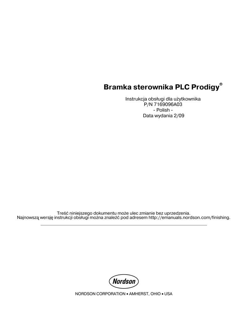 Bramka sterownika PLC Prodigyr Instrukcja obs³ugi dla u¿ytkownika P/N 7169096A03 - Polish Data wydania 2/09 Treœæ niniejszego dokumentu mo¿e ulec zmianie bez uprzedzenia. Najnowsz¹ wersjê instrukcji obs³ugi mo¿na znaleŸæ pod adresem http://emanuals.nordson.com/finishing. NORDSON CORPORATION • AMHERST, OHIO • USA Spis treœci Nordson International . . . . . . . . . . . . . . . . . . . . Europe . . . . . . . . . . . . . . . . . . . . . . . . . . . . . . . . . Distributors in Eastern & Southern Europe . . Outside Europe / Hors d'Europe / Fuera de Europa . . . . . . . . . . . . . . . . . . . . . . . . Africa / Middle East . . . . . . . . . . . . . . . . . . . . . . Asia / Australia / Latin America . . . . . . . . . . . . Japan . . . . . . . . . . . . . . . . . . . . . . . . . . . . . . . . . . North America . . . . . . . . . . . . . . . . . . . . . . . . . . . Bezpieczeñstwo . . . . . . . . . . . . . . . . . . . . . . . . . . Wykwalifikowany personel . . . . . . . . . . . . . . . . W³aœciwe u¿ycie . . . . . . . . . . . . . . . . . . . . . . . . . Przepisy i dopuszczenia . . . . . . . . . . . . . . . . . . Bezpieczeñstwo obs³ugi . . . . . . . . . . . . . . . . . Bezpieczeñstwo po¿arowe . . . . . . . . . . . . . . . Uziemienie . . . . . . . . . . . . . . . . . . . . . . . . . . . . . Dzia³anie w przypadku awarii . . . . . . . . . . . . . Usuwanie . . . . . . . . . . . . . . . . . . . . . . . . . . . . . . . Opis . . . . . . . . . . . . . . . . . . . . . . . . . . . . . . . . . . . . . Tryby pracy . . . . . . . . . . . . . . . . . . . . . . . . . . . . Tryb charakterystyki . . . . . . . . . . . . . . . . . . . . Tryb analogowy . . . . . . . . . . . . . . . . . . . . . . . . . O‐1 O‐1 O‐1 O‐2 O‐2 O‐2 O‐2 O‐2 1 1 1 1 2 2 3 3 3 4 5 5 5 Kontakt Firma Nordson Corporation oczekuje na komentarze i pytania zwi¹zane z oferowanymi produktami. Informacje ogólne o firmie Nordson mo¿na znaleŸæ w witrynie internetowej pod adresem: http://www.nordson.com. Instalacja . . . . . . . . . . . . . . . . . . . . . . . . . . . . . . . Monta¿ obudowy . . . . . . . . . . . . . . . . . . . . . . . Zasilanie elektryczne i bezpieczniki . . . . . . . Ustawienia zworek na obwodzie drukowanym bramki . . . . . . . . . . . . . . . . . . . . . . . . . . . . . . . . Po³¹czenia i ustawienia trybu charakterystyki Po³¹czenia i ustawienia bramki . . . . . . . . . . . Po³¹czenia i ustawienia trybu analogowego Po³¹czenia i ustawienia bramki . . . . . . . . . . . Napiêcie elektrostatyczne . . . . . . . . . . . . . . . Schemat okablowania i ustawieñ bramki — tryb charakterystyki . . . . . . . . . . . . . . . . . . Schemat okablowania i ustawieñ bramki — tryb analogowy . . . . . . . . . . . . . . . . . . . . . . Po³¹czenia i ustawienia obwodu drukowanego sterownika pompy . . . . . . . . . Kable pistoletów . . . . . . . . . . . . . . . . . . . . . . . Ustawienia interfejsu Prodigy MGI . . . . . . . . Obs³uga . . . . . . . . . . . . . . . . . . . . . . . . . . . . . . . . . Zasilanie . . . . . . . . . . . . . . . . . . . . . . . . . . . . . . Wyzwolenie . . . . . . . . . . . . . . . . . . . . . . . . . . . . Meldunek gotowoœci . . . . . . . . . . . . . . . . . . . . B³êdy . . . . . . . . . . . . . . . . . . . . . . . . . . . . . . . . . Czêœci . . . . . . . . . . . . . . . . . . . . . . . . . . . . . . . . . . . Czêœci zamienne bramki . . . . . . . . . . . . . . . . Kable pistoletów . . . . . . . . . . . . . . . . . . . . . . . Opcjonalny zestaw monta¿owy do obudowy Schemat po³¹czeñ elektrycznych obudowy 6 6 7 7 9 9 10 10 10 12 13 14 15 15 16 16 16 16 16 17 17 17 18 19 Uwaga Niniejsza publikacja firmy Nordson Corporation jest chroniona prawami autorskimi. Ochron¹ prawn¹ objêto w roku 2007. ¯adna czêœæ niniejszego dokumentu nie mo¿e byæ kopiowana, powielana ani t³umaczona bez uprzedniej pisemnej zgody firmy Nordson Corporation. Informacjezawartew tej publikacji mog¹ podlegaæ zmianom bez powiadamiania. Znaki towarowe Nazwy HDLV, Prodigy, Nordson oraz logo Nordson s¹ zastrze¿onymi znakami towarowymi firmy Nordson Corporation. P/N 7169096A03 E 2009 Nordson Corporation Introduction O-1 Nordson International http://www.nordson.com/Directory Country Phone Fax Austria 43-1-707 5521 43-1-707 5517 Belgium 31-13-511 8700 31-13-511 3995 Czech Republic 4205-4159 2411 4205-4124 4971 Denmark Hot Melt 45-43-66 0123 45-43-64 1101 Finishing 45-43-200 300 45-43-430 359 Finland 358-9-530 8080 358-9-530 80850 France 33-1-6412 1400 33-1-6412 1401 Erkrath 49-211-92050 49-211-254 658 Lüneburg 49-4131-8940 49-4131-894 149 Nordson UV 49-211-9205528 49-211-9252148 EFD 49-6238 920972 49-6238 920973 Italy 39-02-216684-400 39-02-26926699 Netherlands 31-13-511 8700 31-13-511 3995 47-23 03 6160 47-23 68 3636 Poland 48-22-836 4495 48-22-836 7042 Portugal 351-22-961 9400 351-22-961 9409 Russia 7-812-718 62 63 7-812-718 62 63 Slovak Republic 4205-4159 2411 4205-4124 4971 Spain 34-96-313 2090 34-96-313 2244 Sweden 46-40−680 1700 46-40-932 882 Switzerland 41-61-411 3838 41-61-411 3818 Hot Melt 44-1844-26 4500 44-1844-21 5358 Finishing 44-161-495 4200 44-161-428 6716 Nordson UV 44-1753-558 000 44-1753-558 100 49-211-92050 49-211-254 658 Europe Germany Norway United Kingdom Hot Melt Distributors in Eastern & Southern Europe DED, Germany E 2010 Nordson Corporation All rights reserved NI_EN_N−0310-MX O-2 Introduction Outside Europe / Hors d'Europe / Fuera de Europa S For your nearest Nordson office outside Europe, contact the Nordson offices below for detailed information. S Pour toutes informations sur représentations de Nordson dans votre pays, veuillez contacter l’un de bureaux ci-dessous. S Para obtener la dirección de la oficina correspondiente, por favor diríjase a unas de las oficinas principales que siguen abajo. Contact Nordson Phone Fax DED, Germany 49-211-92050 49-211-254 658 Pacific South Division, USA 1-440-685-4797 − Japan 81-3-5762 2700 81-3-5762 2701 Canada 1-905