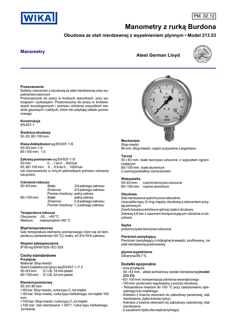 PM 02.12 Manometry z rurk¹ Burdona Obudowa ze stali nierdzewnej z wype³nieniem p³ynnym • Model 213.53 Manometry Atest German Lloyd Przeznaczenie Solidny manometr z obudow¹ ze stali nierdzewnej oraz wype³nieniem p³ynnym Przeznaczone do pracy w trudnych warunkach, przy wstrz¹sach i pulsacjach. Przeznaczony do pracy w œrodowiskach korodogennych i pomiaru ciœnienia wszystkich mediów gazowych i ciek³ych, które nie zatykaj¹ uk³adu pomiarowego. Konstrukcja EN 837-1 Œrednica obudowy 50, 63, 80 i 100 mm Klasa dok³adnoœci wg EN 837-1 /6 50 i 63 mm: 1.6 80 i 100 mm: 1.0 Zakresy pomiarowe wg EN 837-1 /5 50 mm: 0 ... 1 do 0 ... 600 bar 63, 80 i 100 mm: 0 ... 0,6 do 0 ... 1000 bar lub równowartoœæ w innych jednostkach pomiaru ciœnienia lub pró¿ni. Ciœnienie robocze 50 i 63 mm: Sta³e: 3/4 pe³nego zakresu Zmienne: 2/3 pe³nego zakresu Pomiar chwilowy: pe³ny zakres 80 i 100 mm: Sta³e: pe³ny zakres Zmienne: 0,9 pe³nego zakresu Pomiar chwilowy: 1,3 pe³nego zakresu Temperatura robocza Otoczenia: -20 ... +60 °C Medium: maksymalnie +60 °C B³¹d temperaturowy Gdy temperatura elementu pomiarowego ró¿ni siê od temperatury odniesienia(+20 °C): maks. ±0.4%/10 K zakresu. Stopieñ zabezpieczenia IP 65 wg EN 60 529 / IEC 529 Cechy standardowe Przy³¹cze Materia³: Stop miedzi Gwint (radialny lub tylny) wg EN 837-1 /7.3 50 i 63 mm: G ½ B, 14 mm pùaski 80 i 100 mm: G ½ B, 22 mm pùaski Element pomiarowy 50, 63 i 80 mm: < 60 bar: Stop miedzi, rurka typu C, lut miêkki 60 bar: Stop miedzi, rurka typu helikalnego, lut miêkki 100 mm: <100 bar: Stop miedzi, rurka typu C, lut miêkki 100 bar: stal nierdzewna 1.4571, rurka typu helikalnego, lut twardy Mechanizm Stop miedzi 80 mm: Stop miedzi, czêœci zu¿ywalne z argentanu Tarcza 50 i 63 mm: bia³e tworzywo sztuczne, z wypustem ograniczaj¹cym 80 i 100 mm: bia³e aluminium z czarn¹ podzia³k¹ i oznaczeniem Wskazówka 50 i 63 mm: czarne tworzywo sztuczne 80 i 100 mm: czarne aluminium Obudowa Stal nierdzewna wykoñczona naturalnie Uszczelka typu O-ring miêdzy obudow¹ a elementem przy³¹czeniowym Zawór bezpieczeñstwa w górnej czêœci obudowy Zakresy £6 bar z zaworem kompensuj¹cym ciœnienie w obudowie Szyba przezroczyste tworzywo sztuczne Pierœcieñ zamykaj¹cy Pierœcieñ zamykaj¹cy o trójk¹tnej krawêdzi, profilowany, ze stali nierdzewnej polerowanej p³ynne wype³nienie Gliceryna 99,7 % Dodatki opcjonalne - inne przy³¹cze - 50 i 63 mm: uk³ad pomiarowy zestali nierdzewnej (model 233.53) - 63 i 100 mm: kompensacja ciœnienia wewnêtrznego - 100 mm: punkt zero regulowany z przodu obudowy - Temperatura medium do 100 °C przy zastosowaniu specjalnego lutu miêkkiego - Ko³nierz z trzema otworami do zabudowy panelowej, stal nierdzewna, (tylko króciec tylny) - Ko³nierz z trzema otworami do zabudowy naœciennej, stal nierdzewna - Z zaciskiem (tylko dla wejœcia tylnego) Wymiary Wersja standardowa Króciec radialny dolny 1224 557 50, 63 i 160 mm, króciec tylny centryczny 100 mm, króciec tylny w dolnej czêœci obudowy 1224 549 Rozmiar Nominalny Wymiary [mm] Waga [kg] a b ± 0,5 b2 ± 1 D1 D2 e f 50 12 30 55 55 50 5.5 63 13 32 56 68 62 80 15.8 43.5 78 83.6 100 15.5 48 81.5 107 G h±1 SW - 48 14 0.15 6.5 - 54 14 0.21 80 5 - 76 22 0.39 100 8 30 87 22 0.80 Króciec standardowy z równoleg³ym gwintem i gniazdem wg EN 837-1 /7.3 Zamówienie Proszê podaæ: Model manometru / Rozmiar nominalny / Zakres skali / Rozmiar przy³¹cza / zamawiane akcesoria opcjonalne Wykazy i wymiary podane w dokumencie zawieraj¹ dane techniczne aktualne w chwili oddania do druku niniejszego dokumentu. Dane te mog¹ ulec zmianie, a opisane urz¹dzenia byæ zast¹pione innymi bez wczeœniejszego ostrze¿enia