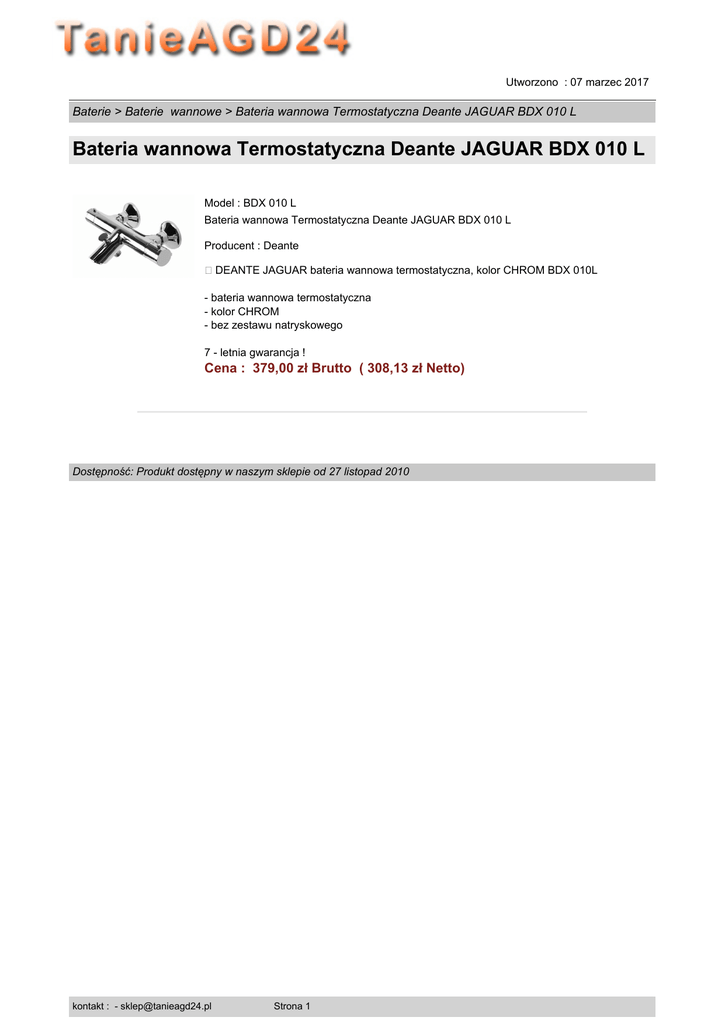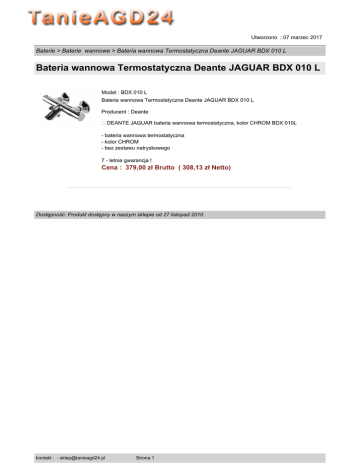 Utworzono : 07 marzec 2017 Baterie > Baterie wannowe > Bateria wannowa Termostatyczna Deante JAGUAR BDX 010 L Bateria wannowa Termostatyczna Deante JAGUAR BDX 010 L Model : BDX 010 L Bateria wannowa Termostatyczna Deante JAGUAR BDX 010 L Producent : Deante �DEANTE JAGUAR bateria wannowa termostatyczna, kolor CHROM BDX 010L - bateria wannowa termostatyczna - kolor CHROM - bez zestawu natryskowego 7 - letnia gwarancja ! Cena : 379,00 zł Brutto ( 308,13 zł Netto) Dostępność: Produkt dostępny w naszym sklepie od 27 listopad 2010 kontakt : - [email protected] Strona 1