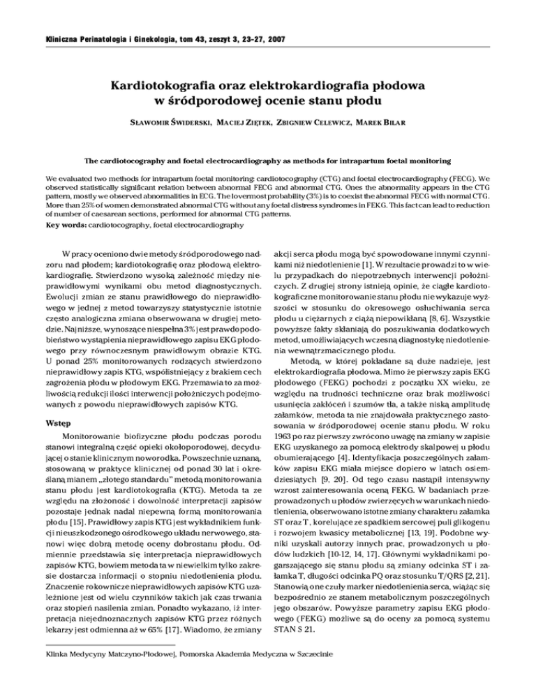 Kliniczna Perinatologia i Ginekologia, tom 43, zeszyt 3, 23-27, 2007 Kardiotokografia oraz elektrokardiografia płodowa w śródporodowej ocenie stanu płodu SŁAWOMIR ŚWIDERSKI, MACIEJ ZIĘTEK, ZBIGNIEW CELEWICZ, MAREK BILAR The cardiotocography and foetal electrocardiography as methods for intrapartum foetal monitoring We evaluated two methods for intrapartum foetal monitoring: cardiotocography (CTG) and foetal electrocardiography (FECG). We observed statistically significant relation between abnormal FECG and abnormal CTG. Ones the abnormality appears in the CTG pattern, mostly we observed abnormalities in ECG. The lovermost probability (3%) is to coexist the abnormal FECG with normal CTG. More than 25% of women demonstrated abnormal CTG without any foetal distress syndromes in FEKG. This fact can lead to reduction of number of caesarean sections, performed for abnormal CTG patterns. Key words: cardiotocography, foetal electrocardiography W pracy oceniono dwie metody śródporodowego nadzoru nad płodem; kardiotokografię oraz płodową elektrokardiografię. Stwierdzono wysoką zależność między nieprawidłowymi wynikami obu metod diagnostycznych. Ewolucji zmian ze stanu prawidłowego do nieprawidłowego w jednej z metod towarzyszy statystycznie istotnie często analogiczna zmiana obserwowana w drugiej metodzie. Najniższe, wynoszące niespełna 3% jest prawdopodobieństwo wystąpienia nieprawidłowego zapisu EKG płodowego przy równoczesnym prawidłowym obrazie KTG. U ponad 25% monitorowanych rodzących stwierdzono nieprawidłowy zapis KTG, współistniejący z brakiem cech zagrożenia płodu w płodowym EKG. Przemawia to za możliwością redukcji ilości interwencji położniczych podejmowanych z powodu nieprawidłowych zapisów KTG. Wstęp Monitorowanie biofizyczne płodu podczas porodu stanowi integralną część opieki okołoporodowej, decydującejo stanie klinicznym noworodka. Powszechnie uznaną, stosowaną w praktyce klinicznej od ponad 30 lat i określaną mianem „złotego standardu” metodą monitorowania stanu płodu jest kardiotokografia (KTG). Metoda ta ze względu na złożoność i dowolność interpretacji zapisów pozostaje jednak nadal niepewną formą monitorowania płodu [15]. Prawidłowy zapis KTG jest wykładnikiem funkcji nieuszkodzonego ośrodkowego układu nerwowego, stanowi więc dobrą metodę oceny dobrostanu płodu. Odmiennie przedstawia się interpretacja nieprawidłowych zapisów KTG, bowiem metoda ta w niewielkim tylko zakresie dostarcza informacji o stopniu niedotlenienia płodu. Znaczenie rokownicze nieprawidłowych zapisów KTG uzależnione jest od wielu czynników takich jak czas trwania oraz stopień nasilenia zmian. Ponadto wykazano, iż interpretacja niejednoznacznych zapisów KTG przez różnych lekarzy jest odmienna aż w 65% [17]. Wiadomo, że zmiany akcji serca płodu mogą być spowodowane innymi czynnikami niż niedotlenienie [1]. W rezultacie prowadzi to w wielu przypadkach do niepotrzebnych interwencji położniczych. Z drugiej strony istnieją opinie, że ciągłe kardiotokograficzne monitorowanie stanu płodu nie wykazuje wyższości w stosunku do okresowego osłuchiwania serca płodu u ciężarnych z ciążą niepowikłaną [8, 6]. Wszystkie powyższe fakty skłaniają do poszukiwania dodatkowych metod, umożliwiających wczesną diagnostykę niedotlenienia wewnątrzmacicznego płodu. Metodą, w której pokładane są duże nadzieje, jest elektrokardiografia płodowa. Mimo że pierwszy zapis EKG płodowego (FEKG) pochodzi z początku XX wieku, ze względu na trudności techniczne oraz brak możliwości usunięcia zakłóceń i szumów tła, a także niską amplitudę załamków, metoda ta nie znajdowała praktycznego zastosowania w śródporodowej ocenie stanu płodu. W roku 1963 po raz pierwszy zwrócono uwagę na zmiany w zapisie EKG uzyskanego za pomocą elektrody skalpowej u płodu obumierającego [4]. Identyfikacja poszczególnych załamków zapisu EKG miała miejsce dopiero w latach osiemdziesiątych [9, 20]. Od tego czasu nastąpił intensywny wzrost zainteresowania oceną FEKG. W badaniach przeprowadzonych u płodów zwierzęcych w warunkach niedotlenienia, obserwowano istotne zmiany charakteru załamka ST oraz T , korelujące ze spadkiem sercowej puli glikogenu i rozwojem kwasicy metabolicznej [13, 19]. Podobne wyniki uzyskali autorzy innych prac, prowadzonych u płodów ludzkich [10-12, 14, 17]. Głównymi wykładnikami pogarszającego się stanu płodu są zmiany odcinka ST i załamka T, długości odcinka PQ oraz stosunku T/QRS [2, 21]. Stanowią one czuły marker niedotlenienia serca, wiążąc się bezpośrednio ze stanem metabolicznym poszczególnych jego obszarów. Powyższe parametry zapisu EKG płodowego (FEKG) możliwe są do oceny za pomocą systemu STAN S 21. Klinka Medycyny Matczyno-Płodowej, Pomorska Akademia Medyczna w Szczecinie 24 S. Świderski, M. Ziętek, Z. Celewicz, M. Bilar Tabela 1. Porównanie stanu pourodzeniowego noworodków – Apgar w 1. minucie życia (APG 1), Apgar w 3. minucie życia (APG 3) i Apgar w 5. minucie życia (Apg 5) – w zależności od prawidłowego (P) i nieprawidłowego (N) śródporodowego zapisu kardiotokograficznego (KTG) i elektrokardiograficznego (FEKG) Min Maks Me I kw. III kw. Zmienna p (P-N) BE !11,8 8 !1,25 !4,6 9 BE ns 20 900 1725 1160 2550 SAO2 pH 7,0450 7,417 7,3045 7,2480 7,3460 SAO2 ns P APG 1 4 10 9 8 10 APG 3 5 10 9 9 10 PH ns APG 5 6 10 9 9 10 KTG BE !11,8 91 !2,75 !4,5 !1,4 APG 1 ns 12 745 1475 8,1 229 SAO2 pH 7,1350 7,459 7,3065 7,2735 7,3400 APG 3 ns N APG 1 6 10 9 8 9 APG 3 7 10 9 9 10 APG 5 ns APG 5 8 10 9,5 9 10 BE !11,8 9,1 !2,1 !4,7 3 BE ns 2 90 164 102 255 SAO2 pH 7,0450 7,459 7,3030 7,2510 7,3430 SAO2 ns P APG 1 3 10 9 8 10 APG 3 5 10 9 9 10 PH ns APG 5 6 10 9 9 10 F EKG BE !7,4 4,1 !3, !3,6 !2,2 APG 1 ns 0,3 28,4 14,05 7,7 218 SAO2 pH 7,1850 7,4480 7,3200 7,2640 7,3340 APG 3 ns N APG 1 5 10 9 8 9 APG 3 6 10 9 9 10 APG 5 ns APG 5 8 10 10 9 10 T