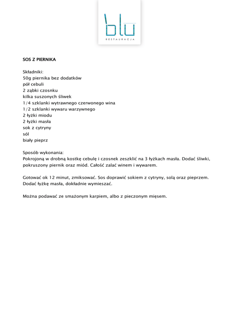 SOS Z PIERNIKA Składniki: 50g piernika bez dodatków pół cebuli 2 ząbki czosnku kilka suszonych śliwek 1/4 szklanki wytrawnego czerwonego wina 1/2 szklanki wywaru warzywnego 2 łyżki miodu 2 łyżki masła sok z cytryny sól biały pieprz Sposób wykonania: Pokrojoną w drobną kostkę cebulę i czosnek zeszklić na 3 łyżkach masła. Dodać śliwki, pokruszony piernik oraz miód. Całość zalać winem i wywarem. Gotować ok 12 minut, zmiksować. Sos doprawić sokiem z cytryny, solą oraz pieprzem. Dodać łyżkę masła, dokładnie wymieszać. Można podawać ze smażonym karpiem, albo z pieczonym mięsem.