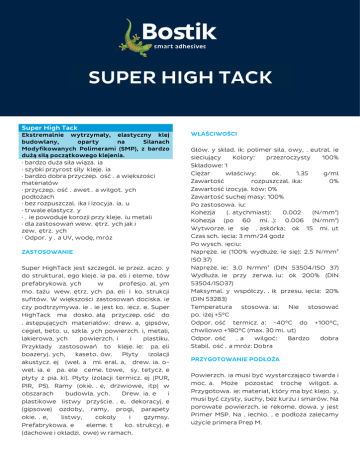 SUPER HIGH TACK Super High Tack Ekstremalnie wytrzymały, elastyczny klej budowlany, oparty na Silanach Modyfikowanych Polimerami (SMP), z bardzo dużą siłą początkowego klejenia. · bardzo duża siła wiązania · szybki przyrost siły klejenia · bardzo dobra przyczepność na większości materiałów · przyczepność nawet na wilgotnych podłożach · bez rozpuszczalnika i izocyjanianu · trwale elastyczny · nie powoduje korozji przy klejeniu metali · dla zastosowań wewnętrznych jak i zewnętrznych · Odporny na UV, wodę, mróz ZASTOSOWANIE Super HighTack jest szczególnie przeznaczony do strukturalnego klejenia paneli i elementów prefabrykowanych w profesjonalnym montażu wewnętrznych paneli i konstrukcji sufitów. W większości zastosowań dociskanie czy podtrzymywanie nie jest konieczne. Super HighTack ma doskonałą przyczepność do następujących materiałów: drewna, gipsów, cegieł, betonu, szklanych powierzchni, metali, lakierowanych powierzchni i plastiku. Przykłady zastosowań to klejenie: paneli boazeryjnych, kasetonów. Płyty izolacji akustycznej (wełna mineralna, drewnianowełniane panele cementowe, syntetyczne płyty z pianki). Płyty izolacji termicznej (PUR, PIR, PS). Ramy (okienne, drzwiowe, itp) w obszarach budowlanych. Drewniane i plastikowe listwy przyścienne, dekoracyjne (gipsowe) ozdoby, ramy, progi, parapety okienne, listwy, cokoły i gzymsy. Prefabrykowane element konstrukcyjne (dachowe i okładzinowe) w ramach. WŁAŚCIWOŚCI Główny składnik: polimer silanowy, neutralnie sieciujący Kolory: przezroczysty 100% Składowe: 1 Ciężar właściwy: ok. 1.35 g/ml Zawartość rozpuszczalnika: 0% Zawartość izocyjanków: 0% Zawartość suchej masy: 100% Po zastosowaniu: Kohezja (natychmiast): 0.002 (N/mm²) Kohezja (po 60 min.): 0.006 (N/mm²) Wytworzenie się naskórka: ok 15 minut Czas schnięcia: 3 mm/24 godz Po wyschnięciu: Naprężenie (100% wydłużenie się): 2.5 N/mm² ISO 37) Naprężenie: 3.0 N/mm² (DIN 53504/ISO 37) Wydłużanie przy zerwaniu: ok 200% (DIN 53504/ISO37) Maksymalny współczynnik przesunięcia: 20% (DIN 53283) Temperatura stosowania: Nie stosować poniżej +5°C Odporność termiczna: -40°C do +100°C, chwilowo +180°C (max. 30 minut) Odporność na wilgoć: Bardzo dobra Stabilność na mróz: Dobra PRZYGOTOWANIE PODŁOŻA Powierzchnia musi być wystarczająco twarda i mocna. Może pozostać trochę wilgotna. Przygotowanie: materiał, który ma być klejony, musi być czysty, suchy, bez kurzu i smarów. Na porowate powierzchnie rekomendowany jest Primer MSP. Na niechłonne podłoża zalecamy użycie primera Prep M. METODY APLIKACJI Aplikować na podłoże lub materiał, który ma być klejony, mocując specjalną końcówkę na wylocie kartusza (w kształcie litery V). Bostik zaleca 3 mm grubość ścieżki klejowej pomiędzy elementami, które mają być ze sobą sklejone, umożliwia to klejowi kompensatę naprężeń (szczególnie kiedy narażony jest na warunki zewnętrzne – albo bardzo wilgotne środowisko). Ta 3 milimetrowa ścieżka klejowa może być osiągnięta poprzez zastosowanie drewnianej/plastikowej przekładki lub kawałków taśmy klejącej o grubości 3 mm. Jeżeli warstwa kleju nie będzie zbyt mocno obciążana albo tylko z minimalnymi deformacjami, to dopuszcza się ścieżkę kleju o grubości 1,5 mm. O więcej informacji dotyczących grubości ścieżki kleju pytaj przedstawiciela Bostik. Czas otwarcia: należy połączyć elementy, które mają być ze sobą klejone tak szybko, jak to jest możliwe, najwyżej w ciągu 15 minut (zależy od temperatury i wilgotności względnej). Materiały wciąż mogą być przesuwane i korygowane, po czym mocno przyciśnij dłońmi lub kauczukowym młotkiem. Czas schnięcia i siła Super HighTack łączy zalety taśmy klejącej i reaktywnego systemu klejenia. Podczas klejenia posiada bardzo wysoką siłę wiązania i wysoką kohezję. Dlatego istnieje możliwość pracy bez dodatkowych, tymczasowych elementów przytrzymujących. Przyklejony element możemy jeszcze przesunąć lub natychmiast odkleić. Po wyschnięciu, pod wpływem wilgoci z powietrza, Super High Tack będzie się wulkanizował do trwale elastycznego i bardzo silnego wiązania kleju. Początek wiązania: Siła klejenia jest tak duża, że tworzenie wiązań możliwe jest klejenie bez Kohezja: > 0.002 N/mm² Kohezja na m2 powierzchni kleju > 2,000 N (> 200 kg). Po 1 godzinie siła wzrasta trzykrotnie. Siła na m2 powierzchni kleju > 6,000 N (> 600 kg) Po wyschnięciu: Super HighTack schnie pod wpływem wilgoci z powietrza – do wytrzymałego, elastycznego i silnego wiązania kleju. Maksymalna siła rozciągania >3 N/mm², siła na ścinanie to 2-4 N/mm², w zależności od konstrukcji wiązania i ilości kleju. Super HighTack musi być aplikowany w trójkątnym kształcie. Poprzez przyciśnięcie elementu, który ma zostać sklejony z powierzchnią, klej rozprzestrzeni się pomiędzy elementem i powierzchnią. Ostateczny wymiar warstwy kleju determinuje siłę wiązania zarówno wstępną jak i po polimeryzacji. Związek pomiędzy rozmiarem ścieżki kleju oraz powierzchnią jest określony strukturą powierzchni klejonych elementów oraz wysokością warstwy klejowej (grubością). Na gładkich powierzchniach trójkątna ścieżka kleju 9 mm x 9 mm (profil ok. 40 mm2) da w rezultacie 13 mm szerokość kleju i grubość 3 mm. Na chropowatych powierzchniach minimalna grubość kleju to 3 mm, szerokość kleju ok. 10 mm. Przy grubości 1,5 mm (większy docisk) szerokości będą odpowiednio ok.26mm i ± 20 mm. Klej nanosić równolegle do siebie, w odpowiedni sposób: tak, aby w przestrzenie pomiędzy nimi docierała wilgotność z powietrza. Zaczynając od standardowego, trójkątnego paska kleju o wymiarach 9mm wysokości i 9 mm szerokości – po przyciśnięciu – grubość kleju zmieni się odpowiednio 1,5 mm lub 3 mm ,wspomniana relacja pomiędzy odległością od ścieżki i wagą elem
