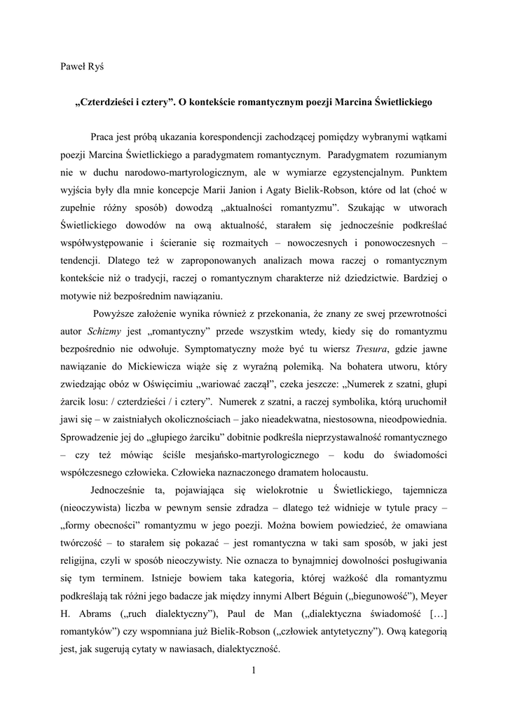 Paweł Ryś „Czterdzieści i cztery”. O kontekście romantycznym poezji Marcina Świetlickiego Praca jest próbą ukazania korespondencji zachodzącej pomiędzy wybranymi wątkami poezji Marcina Świetlickiego a paradygmatem romantycznym. Paradygmatem rozumianym nie w duchu narodowo-martyrologicznym, ale w wymiarze egzystencjalnym. Punktem wyjścia były dla mnie koncepcje Marii Janion i Agaty Bielik-Robson, które od lat (choć w zupełnie różny sposób) dowodzą „aktualności romantyzmu”. Szukając w utworach Świetlickiego dowodów na ową aktualność, starałem się jednocześnie podkreślać współwystępowanie i ścieranie się rozmaitych – nowoczesnych i ponowoczesnych – tendencji. Dlatego też w zaproponowanych analizach mowa raczej o romantycznym kontekście niż o tradycji, raczej o romantycznym charakterze niż dziedzictwie. Bardziej o motywie niż bezpośrednim nawiązaniu. Powyższe założenie wynika również z przekonania, że znany ze swej przewrotności autor Schizmy jest „romantyczny” przede wszystkim wtedy, kiedy się do romantyzmu bezpośrednio nie odwołuje. Symptomatyczny może być tu wiersz Tresura, gdzie jawne nawiązanie do Mickiewicza wiąże się z wyraźną polemiką. Na bohatera utworu, który zwiedzając obóz w Oświęcimiu „wariować zaczął”, czeka jeszcze: „Numerek z szatni, głupi żarcik losu: / czterdzieści / i cztery”. Numerek z szatni, a raczej symbolika, którą uruchomił jawi się – w zaistniałych okolicznościach – jako nieadekwatna, niestosowna, nieodpowiednia. Sprowadzenie jej do „głupiego żarciku” dobitnie podkreśla nieprzystawalność romantycznego – czy też mówiąc ściśle mesjańsko-martyrologicznego – kodu do świadomości współczesnego człowieka. Człowieka naznaczonego dramatem holocaustu. Jednocześnie ta, pojawiająca się wielokrotnie u Świetlickiego, tajemnicza (nieoczywista) liczba w pewnym sensie zdradza – dlatego też widnieje w tytule pracy – „formy obecności” romantyzmu w jego poezji. Można bowiem powiedzieć, że omawiana twórczość – to starałem się pokazać – jest romantyczna w taki sam sposób, w jaki jest religijna, czyli w sposób nieoczywisty. Nie oznacza to bynajmniej dowolności posługiwania się tym terminem. Istnieje bowiem taka kategoria, której ważkość dla romantyzmu podkreślają tak różni jego badacze jak między innymi Albert Béguin („biegunowość”), Meyer H. Abrams („ruch dialektyczny”), Paul de Man („dialektyczna świadomość […] romantyków”) czy wspomniana już Bielik-Robson („człowiek antytetyczny”). Ową kategorią jest, jak sugerują cytaty w nawiasach, dialektyczność. 1 Romantyczna dialektyka, będąca być może pojęciem kluczowym w poezji Świetlickiego, pokazana została na drodze analizy: motywu domu (wnętrze – zewnętrze, piwnica – strych), motywu dziecka (naturalność – forma, kontestacja – konformizm) oraz kategorii ironii (autentyczność – konwencja, „ja” – nie „ja”). Każdemu z tych zagadnień poświęciłem jeden rozdział. Jednocześnie w każdym z rozdziałów nacisk położony jest na inny rodzaj opozycji. Romantyzm przyniósł bowiem kilka sposobów rozumienia związków pomiędzy sprzecznościami i różnorodność ta pojawia się również u Świetlickiego. W analizowanej twórczości wyróżniłem następujące modele: biegunowość (coincidentia oppositorum), antynomię (romantyczne rozdarcie) oraz agon (walka o autonomię „ja”). Biegunowość uwidacznia się (szczególnie) w części poświęconej domowi, antynomia w części poświęconej dziecku, a agon w rozważaniach o ironii. Wyodrębnione, dychotomiczne schematy występują – naturalnie – nie tylko w formie „czystej”, czasem zazębiają się, zachodzą na siebie, mieszają. Postrzeganie rzeczywistości w kategoriach opozycji nie wiąże się tu jednak – co trzeba koniecznie podkreślić – z przemocą. Twórczość ta przynosi model antytetycznego myślenia odsączonego z opresyjności. Antytetyczność u Świetlickiego – choć nie wolna od negatywów – nie jest siłą negatywną. Nie generuje nienawiści, uprzedzeń, nietolerancji. To raczej mechanizm dywersyfikacji, będący mechanizmem konstytuowania się bohatera tych wierszy. Różnicowanie nie służy tu wykluczeniu, ale wyraża „romantyczną” dążność do całkowej (choć nieosiągalnej) autonomii podmiotu. Konieczność i potrzeba – ciągle ponawianego – „odróżniania się” sprawia, że „inny” staje się warunkiem i determinantem „ja”. W tym sensie poezja Świetlickiego – wbrew temu, co się czasem o niej mówi – to poezja permanentnej „inności”. To niekończąca się historia o człowieku, „który budzi się codziennie w innym łóżku. Jest innej płci, innej narodowości […]”. 2