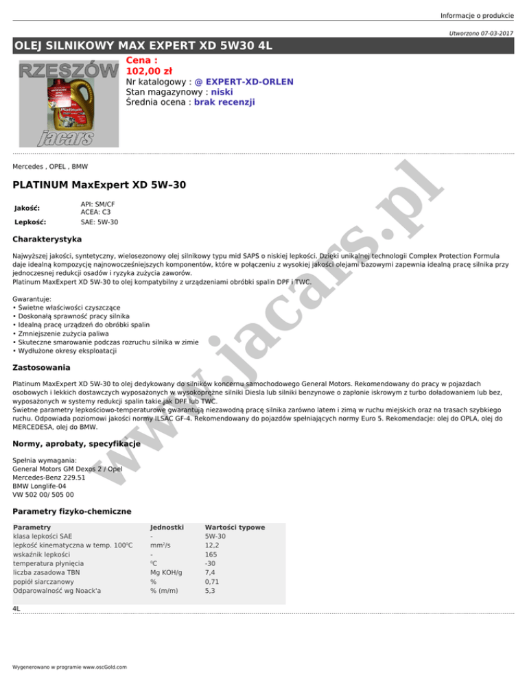 Informacje o produkcie Utworzono 07-03-2017 OLEJ SILNIKOWY MAX EXPERT XD 5W30 4L Cena : 102,00 zł Nr katalogowy : @ EXPERT-XD-ORLEN Stan magazynowy : niski Średnia ocena : brak recenzji Mercedes , OPEL , BMW API: SM/CF ACEA: C3 Lepkość: SAE: 5W-30 .p Jakość: l PLATINUM MaxExpert XD 5W–30 rs Charakterystyka .ja Gwarantuje: • Świetne właściwości czyszczące • Doskonałą sprawność pracy silnika • Idealną pracę urządzeń do obróbki spalin • Zmniejszenie zużycia paliwa • Skuteczne smarowanie podczas rozruchu silnika w zimie • Wydłużone okresy eksploatacji ca Najwyższej jakości, syntetyczny, wielosezonowy olej silnikowy typu mid SAPS o niskiej lepkości. Dzięki unikalnej technologii Complex Protection Formula daje idealną kompozycję najnowocześniejszych komponentów, które w połączeniu z wysokiej jakości olejami bazowymi zapewnia idealną pracę silnika przy jednoczesnej redukcji osadów i ryzyka zużycia zaworów. Platinum MaxExpert XD 5W-30 to olej kompatybilny z urządzeniami obróbki spalin DPF i TWC. Zastosowania w w Platinum MaxExpert XD 5W-30 to olej dedykowany do silników koncernu samochodowego General Motors. Rekomendowany do pracy w pojazdach osobowych i lekkich dostawczych wyposażonych w wysokoprężne silniki Diesla lub silniki benzynowe o zapłonie iskrowym z turbo doładowaniem lub bez, wyposażonych w systemy redukcji spalin takie jak DPF lub TWC. Świetne parametry lepkościowo-temperaturowe gwarantują niezawodną pracę silnika zarówno latem i zimą w ruchu miejskich oraz na trasach szybkiego ruchu. Odpowiada poziomowi jakości normy ILSAC GF-4. Rekomendowany do pojazdów spełniających normy Euro 5. Rekomendacje: olej do OPLA, olej do MERCEDESA, olej do BMW. Normy, aprobaty, specyfikacje w Spełnia wymagania: General Motors GM Dexos 2 / Opel Mercedes-Benz 229.51 BMW Longlife-04 VW 502 00/ 505 00 Parametry fizyko-chemiczne Parametry klasa lepkości SAE lepkość kinematyczna w temp. 1000C wskaźnik lepkości temperatura płynięcia liczba zasadowa TBN popiół siarczanowy Odparowalność wg Noack'a 4L Wygenerowano w programie www.oscGold.com Jednostki mm2/s 0 C Mg KOH/g % % (m/m) Wartości typowe 5W-30 12,2 165 -30 7,4 0,71 5,3