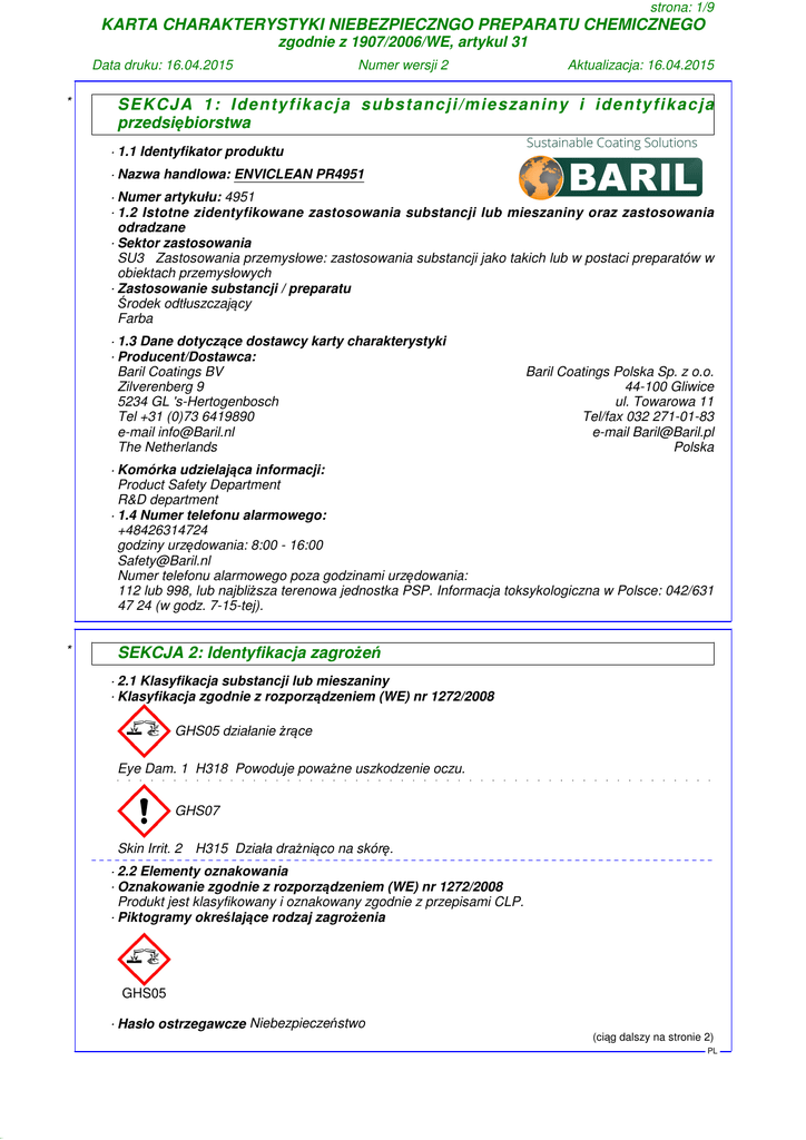 40.1.7 strona: 1/9 KARTA CHARAKTERYSTYKI NIEBEZPIECZNGO PREPARATU CHEMICZNEGO zgodnie z 1907/2006/WE, artykul 31 Data druku: 16.04.2015 * Numer wersji 2 Aktualizacja: 16.04.2015 S E KCJ A 1 : I de n ty f i k a c j a s ubs ta n c j i / m i e s z a n i n y i i de nty fi k a c j a przedsiębiorstwa · 1.1 Identyfikator produktu · Nazwa handlowa: ENVICLEAN PR4951 · Numer artykułu: 4951 · 1.2 Istotne zidentyfikowane zastosowania substancji lub mieszaniny oraz zastosowania odradzane · Sektor zastosowania SU3 Zastosowania przemysłowe: zastosowania substancji jako takich lub w postaci preparatów w obiektach przemysłowych · Zastosowanie substancji / preparatu Środek odtłuszczający Farba · 1.3 Dane dotyczące dostawcy karty charakterystyki · Producent/Dostawca: Baril Coatings BV Zilverenberg 9 5234 GL 's-Hertogenbosch Tel +31 (0)73 6419890 e-mail [email protected] The Netherlands Baril Coatings Polska Sp. z o.o. 44-100 Gliwice ul. Towarowa 11 Tel/fax 032 271-01-83 e-mail [email protected] Polska · Komórka udzielająca informacji: Product Safety Department R&D department · 1.4 Numer telefonu alarmowego: +48426314724 godziny urzędowania: 8:00 - 16:00 [email protected] Numer telefonu alarmowego poza godzinami urzędowania: 112 lub 998, lub najbliższa terenowa jednostka PSP. Informacja toksykologiczna w Polsce: 042/631 47 24 (w godz. 7-15-tej). * SEKCJA 2: Identyfikacja zagrożeń · 2.1 Klasyfikacja substancji lub mieszaniny · Klasyfikacja zgodnie z rozporządzeniem (WE) nr 1272/2008 GHS05 działanie żrące Eye Dam. 1 H318 Powoduje poważne uszkodzenie oczu. GHS07 Skin Irrit. 2 H315 Działa drażniąco na skórę. · 2.2 Elementy oznakowania · Oznakowanie zgodnie z rozporządzeniem (WE) nr 1272/2008 Produkt jest klasyfikowany i oznakowany zgodnie z przepisami CLP. · Piktogramy określające rodzaj zagrożenia GHS05 · Hasło ostrzegawcze Niebezpieczeństwo (ciąg dalszy na stronie 2) PL 40.1.7 strona: 2/9 KARTA CHARAKTERYSTYKI NIEBEZPIECZNGO PREPARATU CHEMICZNEGO zgodnie z 1907/2006/WE, artykul 31 Data druku: 16.04.2015 Numer wersji 2 Aktualizacja: 16.04.2015 Nazwa handlowa: ENVICLEAN PR4951 (ciąg dalszy od strony 1) · Składniki określające niebezpieczeństwo do etykietowania: metakrzemian disodu · Zwroty wskazujące rodzaj zagrożenia H315 Działa drażniąco na skórę. H318 Powoduje poważne uszkodzenie oczu. · Zwroty wskazujące środki ostrożności P101 W razie konieczności zasięgnięcia porady lekarza należy pokazać pojemnik lub etykietę. P102 Chronić przed dziećmi. P103 Przed użyciem przeczytać etykietę. P280 Stosować rękawice ochronne/odzież ochronną/ochronę oczu/ochronę twarzy. P305+P351+P338 W PRZYPADKU DOSTANIA SIĘ DO OCZU: Ostrożnie płukać wodą przez kilka minut. Wyjąć soczewki kontaktowe, jeżeli są i można je łatwo usunąć. Nadal płukać. P310 Natychmiast skontaktować się z OŚRODKIEM ZATRUĆ/lekarzem. P321 Zastosować określone leczenie (patrz na etykiecie). P362 Zanieczyszczoną odzież zdjąć i wyprać przed ponownym użyciem. P332+P313 W przypadku wystąpienia podrażnienia skóry: Zasięgnąć porady/zgłosić się pod opiekę lekarza. · 2.3 Inne zagrożenia · Wyniki oceny właściwości PBT i vPvB · PBT: brak dostępnych danych · vPvB: brak dostępnych danych SEKCJA 3: Skład/informacja o składnikach · Opis: Mieszanka żywiczna · Składniki niebezpieczne: CAS: 5064-31-3 trisodium nitrilotriacetate 5-<7% EINECS: 225-768-6 Acute Tox. 4, H302; Skin Irrit. 2, H315; Eye Irrit. 2, H319 Reg.nr.: 01-2119519239-36 2,5-<3% CAS: 6834-92-0 metakrzemian disodu EINECS: 229-912-9 Skin Corr. 1B, H314; STOT SE 3, H335 Reg.nr.: 01-2119449811-37 · Wskazówki dodatkowe: Pełna treść przytoczonych wskazówek dotyczących zagrożeń znajduje się w rozdziale 16. SEKCJA 4: Środki pierwszej pomocy · 4.1 Opis środków pierwszej pomocy · Wskazówki ogólne: Środki specjalne nie są konieczne. · Po wdychaniu: Dostarczyć świeże powietrze, w razie dolegliwości wezwać lekarza. · Po styczności ze skórą: Ogólnie produkt nie działa drażniąco na skórę. · Po styczności z okiem: Płukać oczy z otwartą powieką przez kilka minut pod bieżącą wodą. · Po przełknięciu: Przy trwałych dolegliwościach porozumieć się z lekarzem. · 4.2 Najważniejsze ostre i opóźnione objawy oraz skutki narażenia Brak dostępnych dalszych istotnych danych · 4.3 Wskazania dotyczące wszelkiej natychmiastowej pomocy lekarskiej i szczególnego postępowania z poszkodowanym Brak dostępnych dalszych istotnych danych SEKCJA 5: Postępowanie w przypadku pożaru · 5.1 Środki gaśnicze · Przydatne środki gaśnicze: Zabiegi gaszenia ognia dostosować do otoczenia. (ciąg dalszy na stronie 3) PL 40.1.7 strona: 3/9 KARTA CHARAKTERYSTYKI NIEBEZPIECZNGO PREPARATU CHEMICZNEGO zgodnie z 1907/2006/WE, artykul 31 Data druku: 16.04.2015 Numer wersji 2 Aktualizacja: 16.04.2015 Nazwa handlowa: ENVICLEAN PR4951 · 5.2 Szczególne zagrożenia związane z substancją lub mieszaniną Brak dostępnych dalszych istotnych danych · 5.3 Informacje dla straży pożarnej · Specjalne wyposażenie ochronne: Środki specjalne nie są konieczne. * (ciąg dalszy od strony 2) SEKCJA 6: Postępowanie w przypadku niezamierzonego uwolnienia do środowiska · 6.1 Indywidualne środki ostrożności, wyposażenie ochronne i procedury w sytuacjach awaryjnych Nie konieczne. · 6.2 Środki ostrożności w zakresie ochrony środowiska: Rozcieńczyć dużą ilością wody. Nie dopuścić do przeniknięcia do kanalizacji /wód powierzchniowych /wód gruntowych. · 6.3 Metody i materiały zapobiegające rozprzestrzenianiu się skażenia i służące do usuwania skażenia: Zebrać za pomocą materiału wiążącego ciecze (piasek, ziemia okrzemkowa, materiał wiążący kwasy, materiał wiążący uniwersalny, trociny). · 6.4 Odniesienia do innych sekcji Nie powstają żadne materiały niebezpieczne. Informacje na temat bezpiecznej obsługi patrz rozdział 7. Informacje na 