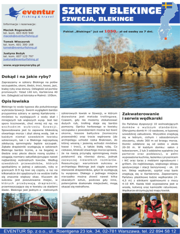 SZKIERY BLEKINGE SZWECJA, BLEKINGE Informacje i rezerwacje: Maciek Rogowiecki tel. kom. 603 820 940 [email protected] Pakiet „Blekinge” już od 1050,- zł od osoby za 7 dni. Tomek Wieczorek tel. kom. 601 300 168 [email protected] Justyna Bożyk tel. kom. 607 122 797 [email protected] www.wyprawynaryby.pl Dokąd i na jakie ryby? Zapraszamy w szkiery Blekinge na połów szczupaków, okoni, śledzi, troci, łososi, jazi, białej ryby oraz dorszy. Odległość od portów promowych: Ystad 140 km, Karlskrona 40 km. Odległość od lotniska w Malmö: 195km. Opis łowiska Blekinge to woda typowa dla południowego wybrzeża Szwecji. Swoim wyglądem bardzo przypomina szkiery w samej Karlskronie mnóstwo tu wystających z wody skał i mniejszych lub większych wysp. Jest też sporo trzcinowisk, choć mniej niż np. na wschodnim wybrzeżu Szwecji. Spowodowane jest to zapewne bliskością otwartego morza i zbyt słoną wodą. Jak w każdym niemal szwedzkim łowisku szkierowym, tak i w Blekinge najczęstszą zdobyczą spinningisty będzie szczupak. Zębate drapieżniki występują w szkierach Blekinge bardzo licznie, a na bogatej w śledzie oraz płocie diecie rosną szybko i osiągają rozmiary satysfakcjonujące nawet najbardziej wybrednych łowców. Według szwedzkich przewodników, których spotkaliśmy w jednej z zatoczek, ryby w granicach 8-9 kg łowi się często, a raz na kilkanaście dni spędzonych na wodzie trafia się znacznie większy okaz. Kluczem do sukcesu jest poszukiwanie miejsc, w których przebywają drapieżniki, przemieszczające się w łowisku za stadami śledzi. Blekinge jest jednym z nielicznych szkierowych łowisk w Szwecji, w którym dozwolona jest metoda trollingowa. Czasem, gdy nie możemy zlokalizować dużych ryb, trolling staje się bardzo pomocny. Oprócz herbowego w łowisku szczupaka z powodzeniem można też łowić okonie, łososie bałtyckie (konieczny przewodnik) oraz trocie wędrowne (do archipelagu uchodzi rzeka Braknean, do której wiosną i jesienią wchodzi mnóstwo łososi i troci), a także białą rybę. Co ciekawe, bliskość otwartego morza sprawia, że na naszą przynętę spinningową może połakomić się również dorsz, jednak z a z w y c z a j n i e w i e l k i c h r o z m i a r ó w. Reasumując: warunkiem sukcesu w archipelagu Blekinge jest ciągłe szukanie stanowisk drapieżników, gdyż te występują tu wyspowo. Dlatego z jednego miejsca nierzadko można złowić nawet kilka okazałych sztuk, podczas gdy inne, potencjalnie doskonałe miejscówki, mogą okazać się nietrafione. Zakwaterowanie i serwis wędkarski Do Państwa dyspozycji 10 wolnostojących domków o wyższym standardzie. Oferujemy domki 4- i 6-osobowe, w typowej szwedzkiej zabudowie. Wszystkie znajdują się w leśnym, cichym i odosobnionym otoczeniu, około 300 m od brzegu morza. Domki oddalone są od siebie o około 20-30 m. W każdym domku: salon z telewizorem, 2 lub 3 oddzielne sypialnie (na parterze oraz poddaszu), w pełni wyposażona kuchnia, łazienka z prysznicem i WC oraz taras z meblami ogrodowymi i grillem. Do najbliższego, większego sklepu spożywczego i stacji benzynowej - ok. 10 km. Sklep wędkarski, szpital oraz bank znajdują się w Karlskronie. Zapewniamy Państwu plastikowe łodzie wędkarskie (44,5 m) z silnikami spalinowymi o mocy 4-10 KM. Każda łódź wyposażona jest w wiosła, kotwicę oraz kamizelki ratunkowe. Wędkarze otrzymują też mapy łowisk. EVENTUR Sp. z o.o., ul.. Roentgena 23 lok. 34, 02-781 Warszawa, tel. 22 894 58 12