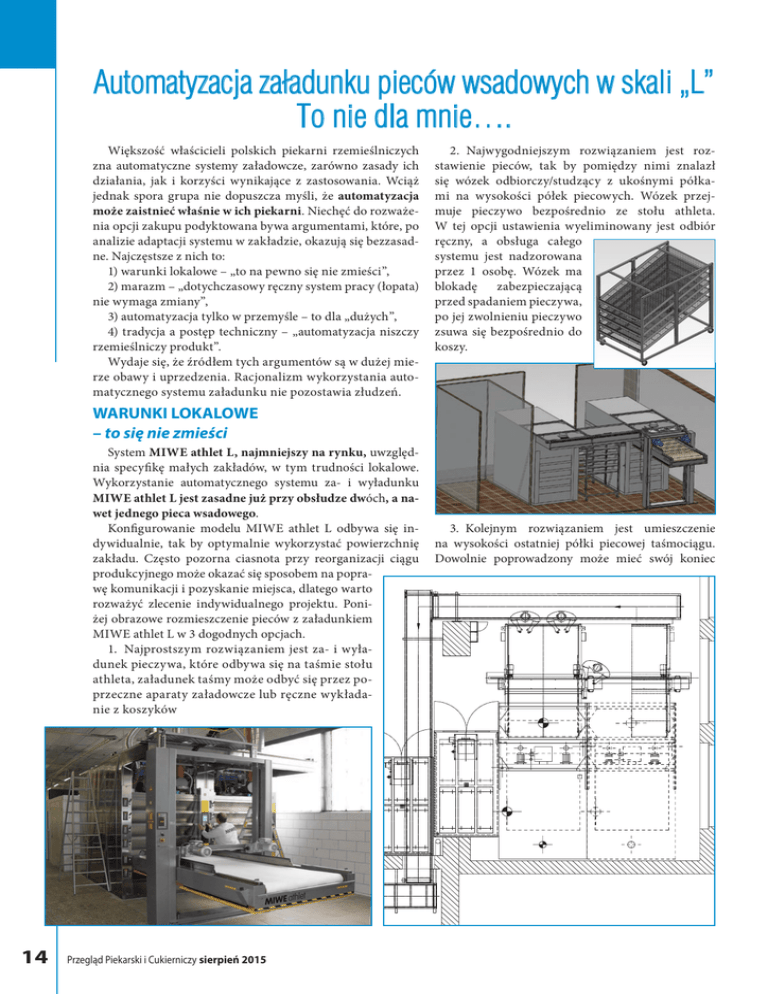 Automatyzacja załadunku pieców wsadowych w skali „L” To nie dla mnie…. Większość właścicieli polskich piekarni rzemieślniczych zna automatyczne systemy załadowcze, zarówno zasady ich działania, jak i korzyści wynikające z zastosowania. Wciąż jednak spora grupa nie dopuszcza myśli, że automatyzacja może zaistnieć właśnie w ich piekarni. Niechęć do rozważenia opcji zakupu podyktowana bywa argumentami, które, po analizie adaptacji systemu w zakładzie, okazują się bezzasadne. Najczęstsze z nich to: 1) warunki lokalowe – „to na pewno się nie zmieści”, 2) marazm – „dotychczasowy ręczny system pracy (łopata) nie wymaga zmiany”, 3) automatyzacja tylko w przemyśle – to dla „dużych”, 4) tradycja a postęp techniczny – „automatyzacja niszczy rzemieślniczy produkt”. Wydaje się, że źródłem tych argumentów są w dużej mierze obawy i uprzedzenia. Racjonalizm wykorzystania automatycznego systemu załadunku nie pozostawia złudzeń. 2. Najwygodniejszym rozwiązaniem jest rozstawienie pieców, tak by pomiędzy nimi znalazł się wózek odbiorczy/studzący z ukośnymi półkami na wysokości półek piecowych. Wózek przejmuje pieczywo bezpośrednio ze stołu athleta. W tej opcji ustawienia wyeliminowany jest odbiór ręczny, a obsługa całego systemu jest nadzorowana przez 1 osobę. Wózek ma blokadę zabezpieczającą przed spadaniem pieczywa, po jej zwolnieniu pieczywo zsuwa się bezpośrednio do koszy. WARUNKI LOKALOWE – to się nie zmieści System MIWE athlet L, najmniejszy na rynku, uwzględnia specyfikę małych zakładów, w tym trudności lokalowe. Wykorzystanie automatycznego systemu za- i wyładunku MIWE athlet L jest zasadne już przy obsłudze dwóch, a nawet jednego pieca wsadowego. Konfigurowanie modelu MIWE athlet L odbywa się indywidualnie, tak by optymalnie wykorzystać powierzchnię zakładu. Często pozorna ciasnota przy reorganizacji ciągu produkcyjnego może okazać się sposobem na poprawę komunikacji i pozyskanie miejsca, dlatego warto rozważyć zlecenie indywidualnego projektu. Poniżej obrazowe rozmieszczenie pieców z załadunkiem MIWE athlet L w 3 dogodnych opcjach. 1. Najprostszym rozwiązaniem jest za- i wyładunek pieczywa, które odbywa się na taśmie stołu athleta, załadunek taśmy może odbyć się przez poprzeczne aparaty załadowcze lub ręczne wykładanie z koszyków 14 Przegląd Piekarski i Cukierniczy sierpień 2015 3. Kolejnym rozwiązaniem jest umieszczenie na wysokości ostatniej półki piecowej taśmociągu. Dowolnie poprowadzony może mieć swój koniec na „wydawce”. Piece stoją wówczas blisko siebie, dla oszczędności miejsca. Na taśmie transportowej dodatkowo montowany jest system zraszania chleba. Często stosowanym rozwiązaniem jest praktyczna zjeżdżalnia na końcu taśmy transportowej, po której upieczony chleb zsuwa się do rąk osoby przekładającej bochenki do koszy. MARAZM a KOMFORT PRACY PRACOWNIKÓW – ręczny załadunek: dobry i sprawdzony Oczywiście zawsze można zasadzać piec ręcznie: łopatą lub aparatami wrzutowymi; pytanie tylko: jak długo jeszcze wykonujący ten zawód oraz przyszli adepci będą chcieli to robić, narażając swój kręgosłup na przeciążenia. Nie jest tajemnicą, że zawód piekarza, ze względu na różnego rodzaju niewygody, młodzi wybierają coraz rzadziej. Automatyczny załadunek ma przede wszystkim odciążyć piecowego i podnieść standard pracy piekarzy w zakładzie. Niechętnie podejmowana i uciążliwa zmiana nocna może być, dzięki automatyzacji załadunku, skrócona, rozpoczynać się później, a na godziny nocne planowany jest personel w mniejszym wymiarze. Inwestycja w system automatycznego za- i wyładunku jest przejawem dojrzałego i globalnego myślenia na temat podniesienia atrakcyjności zawodu piekarza. Piekarze weryfikują dziś ofertę pracy pod kątem nowoczesnego wyposażenia usprawniającego ich codzienne czynności. Automatyzacja załadunku może być zatem kartą przetargową w pozyskiwaniu dobrych fachowców. Pracodawca, który inwestuje w park maszynowy mając na uwadze dobro pracowników może liczyć na zwrot inwestycji w postaci nieocenionych wartości, jak lojalność, rzetelność i uczciwość. czego w tym zakresie! System MIWE athlet L pracuje ostrożnie i w sposób zsynchronizowany, co sprawia, że wszelkie obciążenia mechaniczne zostają ograniczone do minimum. Nawet najwrażliwsze ciasto (luźne) nie deformuje się. Wymierna za to jest poprawa efektów wypiekowych, gdyż zasadzenie pieca trwa krótko i jest realizowane z dokładnością co do sekundy. Nie dochodzi tym samym do utraty energii i czasu przy ponownym rozgrzaniu pieca, stąd atmosfera pieczenia jest stała. Produkt jest upieczony równomiernie, a jakość powtarzalna. Dotychczasowi użytkownicy MIWE athlet L przekonani o słuszności swojej decyzji twierdzą, iż „technika powinna służyć człowiekowi tak dalece, by zachowywana była rzemieślnicza jakość”. MIWE athlet L eliminuje dodatkowo ludzkie błędy, jak zbyt długi czas pieczenia, nieodpowiednia temperatura, zbyt małe lub zbyt duże zaparowanie. AUTOMATYCZNY ZAŁADUNEK TYLKO W PRZEMYSŁOWEJ PRODUKCJI – to dla dużych Czystość zakładu z systemem automatycznego załadunku MIWE athlet L świetnie sprawdza się w rzemieślniczej piekarni o niedużej produkcji; opłacalny już przy obsłudze 1 pieca (maks. liczba komór – 6). W przypadku rozbudowy instalacji o nowe piece, system może przejąć obsługę maks. 3 pieców. Jeśli za- i wyładunek nie są wspierane automatycznie muszą być wykonane ręcznie – tu wracamy do problemu personalnego. Dzięki systemowi załadunku stworzone zostają moce przerobowe, które otwierają drogę do zwiększenia wydajności. TRADYCJA A POSTĘP TECHNICZNY Pielęgnowanie tradycji recepturowej, wielofazowe prowadzenie ciasta są niejednokrotnie kluczem do sukcesu. Automatyzacja załadunku nie zmienia ni- Zautomatyz