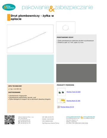 Drut plombowniczy - żyłka w oplocie PODSTAWOWE CECHY ● ● OPIS TECHNICZNY ● ● ● PRODUKTY POKREWNE 1 kg = ok 450 mb ZASTOSOWANIE ● Żyłka plombownicza opleciona drutem ocynkowanym Średnica żyłki: 0,7 mm, oplot: 0,3 mm plombowanie magazynów plombowanie pojemników, beczek, szaf Żyłka dostępna w kregach lub w odcinkach dowolnej długości. Plomba Twist Sil 600 Plomba Multi Sil 395 Plomba Notox Sil 10