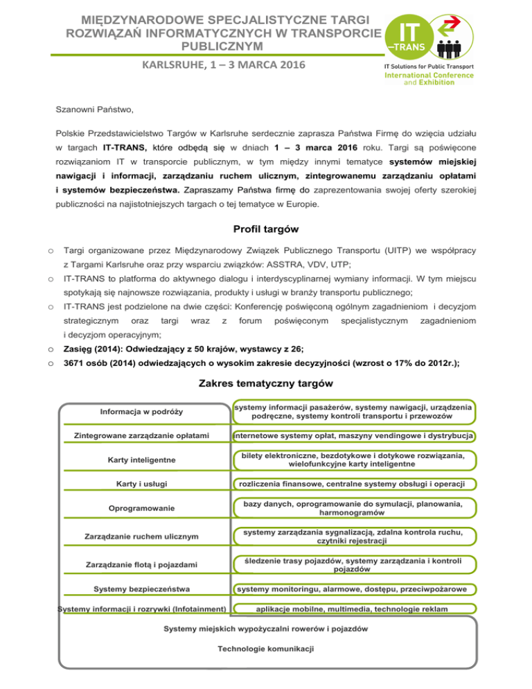 MIĘDZYNARODOWE SPECJALISTYCZNE TARGI ROZWIĄZAŃ INFORMATYCZNYCH W TRANSPORCIE PUBLICZNYM KARLSRUHE, 1 – 3 MARCA 2016 Szanowni Państwo, Polskie Przedstawicielstwo Targów w Karlsruhe serdecznie zaprasza Państwa Firmę do wzięcia udziału w targach IT-TRANS, które odbędą się w dniach 1 – 3 marca 2016 roku. Targi są poświęcone rozwiązaniom IT w transporcie publicznym, w tym między innymi tematyce systemów miejskiej nawigacji i informacji, zarządzaniu ruchem ulicznym, zintegrowanemu zarządzaniu opłatami i systemów bezpieczeństwa. Zapraszamy Państwa firmę do zaprezentowania swojej oferty szerokiej publiczności na najistotniejszych targach o tej tematyce w Europie. Profil targów ○ Targi organizowane przez Międzynarodowy Związek Publicznego Transportu (UITP) we współpracy z Targami Karlsruhe oraz przy wsparciu związków: ASSTRA, VDV, UTP; ○ IT-TRANS to platforma do aktywnego dialogu i interdyscyplinarnej wymiany informacji. W tym miejscu spotykają się najnowsze rozwiązania, produkty i usługi w branży transportu publicznego; ○ IT-TRANS jest podzielone na dwie części: Konferencję poświęconą ogólnym zagadnieniom i decyzjom strategicznym oraz targi wraz z forum poświęconym specjalistycznym zagadnieniom i decyzjom operacyjnym; ○ Zasięg (2014): Odwiedzający z 50 krajów, wystawcy z 26; ○ 3671 osób (2014) odwiedzających o wysokim zakresie decyzyjności (wzrost o 17% do 2012r.); Zakres tematyczny targów Informacja w podróży systemy informacji pasażerów, systemy nawigacji, urządzenia podręczne, systemy kontroli transportu i przewozów Zintegrowane zarządzanie opłatami internetowe systemy opłat, maszyny vendingowe i dystrybucja Karty inteligentne bilety elektroniczne, bezdotykowe i dotykowe rozwiązania, wielofunkcyjne karty inteligentne Karty i usługi rozliczenia finansowe, centralne systemy obsługi i operacji Oprogramowanie bazy danych, oprogramowanie do symulacji, planowania, harmonogramów Zarządzanie ruchem ulicznym systemy zarządzania sygnalizacją, zdalna kontrola ruchu, czytniki rejestracji Zarządzanie flotą i pojazdami śledzenie trasy pojazdów, systemy zarządzania i kontroli pojazdów Systemy bezpieczeństwa systemy monitoringu, alarmowe, dostępu, przeciwpożarowe Systemy informacji i rozrywki (Infotainment) aplikacje mobilne, multimedia, technologie reklam Systemy miejskich wypożyczalni rowerów i pojazdów Technologie komunikacji Odwiedzający targi ● kadra zarządcza publicznego i prywatnego transportu, ● delegaci oraz władze i samorządy miast i regionów, ● wykonawcy i producenci maszyn oraz pojazdów ● producencii urzadzeń, rozwiązań systemowych i informatycznych, ● menedżerowie, eksperci i specjaliści IT, ● menedżerowie projektów, dyrektorzy techniczni, specjaliści ds. rozwoju i badań, ● przedstawiciele związków, stowarzyszeń transportowych i komunikacji, Koszt udziału w targach cena netto za powierzchnię bez zabudowy Do 59 m² 299 € / m² 60 m² do 99 m² 250 € / m² Powyżej 100 m² 185 € / m² Stoiska piętrowe 50% ceny za każdy m² na piętrze Opłata AUMA – 0,60 € / m² Opłata rejestracyjna – 800 € Minimalna powierzchnia stoiska – 12 m² Oplata za odbiór odpadów 1,5 € / m² Targi Karlsruhe oferują Państwu zabudowę w cenie od 75 € / m². W celu uzyskania szczegółów prosimy o kontakt z Przedstawicielstwem Targów Karlsruhe w Polsce. Jeżeli są Państwo zainteresowani udziałem lub mają Państwo pytania, z Przedstawicielstwem – (0-22) 620 71 98, e-mail: [email protected]. Serdecznie zapraszamy do udziału w targach! Z poważaniem Krzysztof Karaś Dyrektor Przedstawicielstwa Targów Karlsruhe w Polsce Offizielle Vertretung der Messe Karlsruhe in Polen Oficjalne Przedstawicielstwo Targów Karlsruhe w Polsce ul. Gibalskiego 21 01-190 Warszawa Tel. 22 620 71 98 Tel. 22 620 72 98 Fax: 22 245 43 42 [email protected] prosimy o kontakt