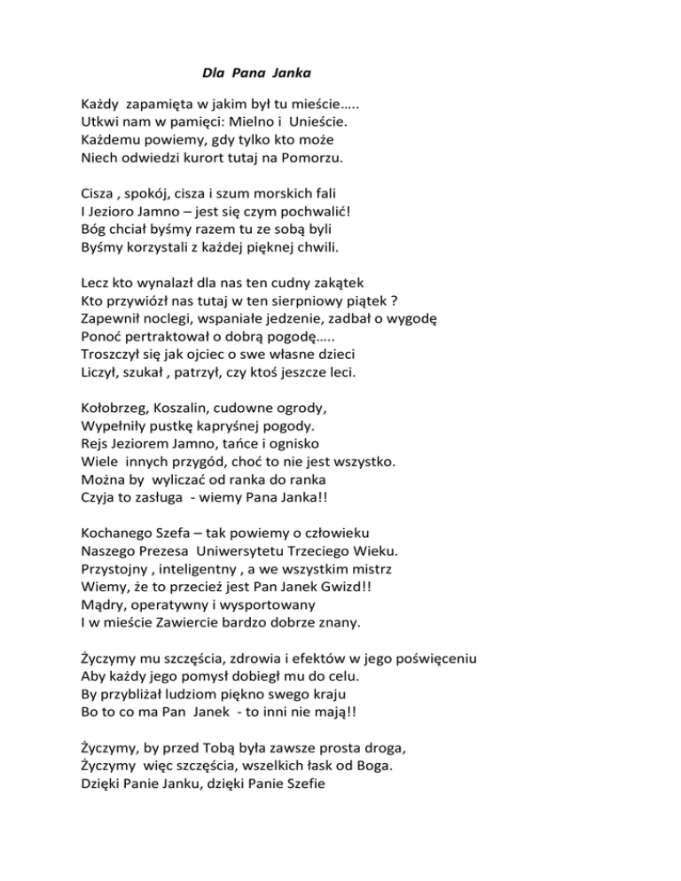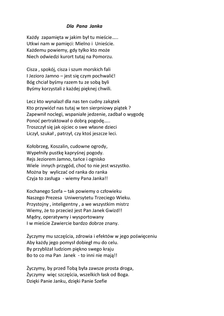 Dla Pana Janka Każdy zapamięta w jakim był tu mieście….. Utkwi nam w pamięci: Mielno i Unieście. Każdemu powiemy, gdy tylko kto może Niech odwiedzi kurort tutaj na Pomorzu. Cisza , spokój, cisza i szum morskich fali I Jezioro Jamno – jest się czym pochwalid! Bóg chciał byśmy razem tu ze sobą byli Byśmy korzystali z każdej pięknej chwili. Lecz kto wynalazł dla nas ten cudny zakątek Kto przywiózł nas tutaj w ten sierpniowy piątek ? Zapewnił noclegi, wspaniałe jedzenie, zadbał o wygodę Ponod pertraktował o dobrą pogodę….. Troszczył się jak ojciec o swe własne dzieci Liczył, szukał , patrzył, czy ktoś jeszcze leci. Kołobrzeg, Koszalin, cudowne ogrody, Wypełniły pustkę kapryśnej pogody. Rejs Jeziorem Jamno, taoce i ognisko Wiele innych przygód, chod to nie jest wszystko. Można by wyliczad od ranka do ranka Czyja to zasługa - wiemy Pana Janka!! Kochanego Szefa – tak powiemy o człowieku Naszego Prezesa Uniwersytetu Trzeciego Wieku. Przystojny , inteligentny , a we wszystkim mistrz Wiemy, że to przecież jest Pan Janek Gwizd!! Mądry, operatywny i wysportowany I w mieście Zawiercie bardzo dobrze znany. Życzymy mu szczęścia, zdrowia i efektów w jego poświęceniu Aby każdy jego pomysł dobiegł mu do celu. By przybliżał ludziom piękno swego kraju Bo to co ma Pan Janek - to inni nie mają!! Życzymy, by przed Tobą była zawsze prosta droga, Życzymy więc szczęścia, wszelkich łask od Boga. Dzięki Panie Janku, dzięki Panie Szefie Niech Twe dalsze życie przebiega z uśmiechem. Niech w Twych oczach płynie miłośd i serdecznośd A nasz pobyt tutaj - to w pamięci wiecznośd !! Oby więcej było takich jak Prezes Jan ludzi To w tym kraju pewnie nikt by się nie nudził. Chod przykro odjeżdżad – zżyliśmy się jak z rodziną Lecz wspomnienie zachowa uśmiechniętą minę! Dla Szefa w imieniu grupy Zofia Nowak