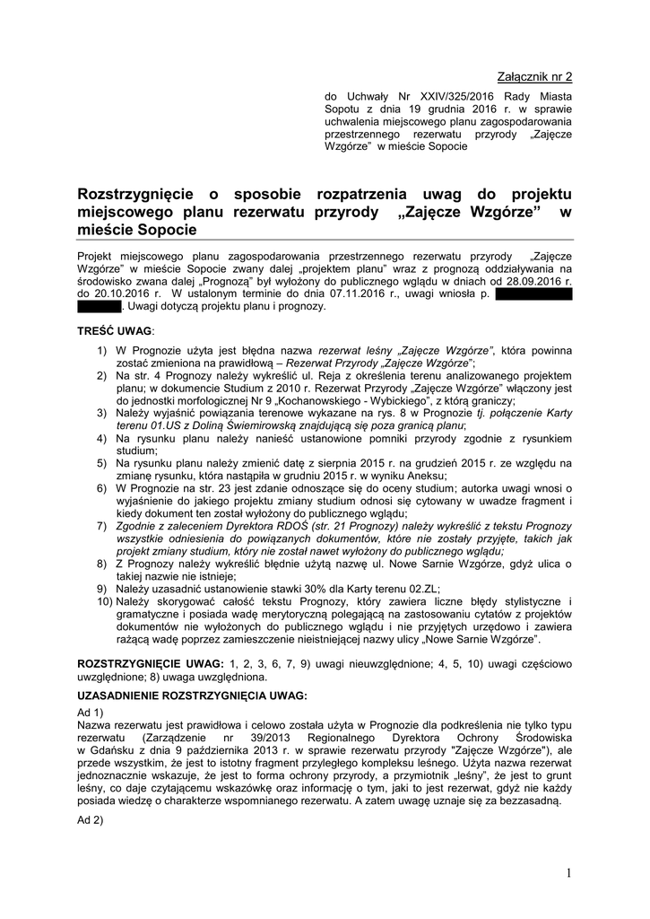 Załącznik nr 2 do Uchwały Nr XXIV/325/2016 Rady Miasta Sopotu z dnia 19 grudnia 2016 r. w sprawie uchwalenia miejscowego planu zagospodarowania przestrzennego rezerwatu przyrody „Zajęcze Wzgórze” w mieście Sopocie Rozstrzygnięcie o sposobie rozpatrzenia uwag do projektu miejscowego planu rezerwatu przyrody „Zajęcze Wzgórze” w mieście Sopocie Projekt miejscowego planu zagospodarowania przestrzennego rezerwatu przyrody „Zajęcze Wzgórze” w mieście Sopocie zwany dalej „projektem planu” wraz z prognozą oddziaływania na środowisko zwana dalej „Prognozą” był wyłożony do publicznego wglądu w dniach od 28.09.2016 r. do 20.10.2016 r. W ustalonym terminie do dnia 07.11.2016 r., uwagi wniosła p. Maria LepczakWysocka. Uwagi dotyczą projektu planu i prognozy. TREŚĆ UWAG: 1) W Prognozie użyta jest błędna nazwa rezerwat leśny „Zajęcze Wzgórze”, która powinna zostać zmieniona na prawidłową – Rezerwat Przyrody „Zajęcze Wzgórze”; 2) Na str. 4 Prognozy należy wykreślić ul. Reja z określenia terenu analizowanego projektem planu; w dokumencie Studium z 2010 r. Rezerwat Przyrody „Zajęcze Wzgórze” włączony jest do jednostki morfologicznej Nr 9 „Kochanowskiego - Wybickiego”, z którą graniczy; 3) Należy wyjaśnić powiązania terenowe wykazane na rys. 8 w Prognozie tj. połączenie Karty terenu 01.US z Doliną Świemirowską znajdującą się poza granicą planu; 4) Na rysunku planu należy nanieść ustanowione pomniki przyrody zgodnie z rysunkiem studium; 5) Na rysunku planu należy zmienić datę z sierpnia 2015 r. na grudzień 2015 r. ze względu na zmianę rysunku, która nastąpiła w grudniu 2015 r. w wyniku Aneksu; 6) W Prognozie na str. 23 jest zdanie odnoszące się do oceny studium; autorka uwagi wnosi o wyjaśnienie do jakiego projektu zmiany studium odnosi się cytowany w uwadze fragment i kiedy dokument ten został wyłożony do publicznego wglądu; 7) Zgodnie z zaleceniem Dyrektora RDOŚ (str. 21 Prognozy) należy wykreślić z tekstu Prognozy wszystkie odniesienia do powiązanych dokumentów, które nie zostały przyjęte, takich jak projekt zmiany studium, który nie został nawet wyłożony do publicznego wglądu; 8) Z Prognozy należy wykreślić błędnie użytą nazwę ul. Nowe Sarnie Wzgórze, gdyż ulica o takiej nazwie nie istnieje; 9) Należy uzasadnić ustanowienie stawki 30% dla Karty terenu 02.ZL; 10) Należy skorygować całość tekstu Prognozy, który zawiera liczne błędy stylistyczne i gramatyczne i posiada wadę merytoryczną polegającą na zastosowaniu cytatów z projektów dokumentów nie wyłożonych do publicznego wglądu i nie przyjętych urzędowo i zawiera rażącą wadę poprzez zamieszczenie nieistniejącej nazwy ulicy „Nowe Sarnie Wzgórze”. ROZSTRZYGNIĘCIE UWAG: 1, 2, 3, 6, 7, 9) uwagi nieuwzględnione; 4, 5, 10) uwagi częściowo uwzględnione; 8) uwaga uwzględniona. UZASADNIENIE ROZSTRZYGNIĘCIA UWAG: Ad 1) Nazwa rezerwatu jest prawidłowa i celowo została użyta w Prognozie dla podkreślenia nie tylko typu rezerwatu (Zarządzenie nr 39/2013 Regionalnego Dyrektora Ochrony Środowiska w Gdańsku z dnia 9 października 2013 r. w sprawie rezerwatu przyrody "Zajęcze Wzgórze"), ale przede wszystkim, że jest to istotny fragment przyległego kompleksu leśnego. Użyta nazwa rezerwat jednoznacznie wskazuje, że jest to forma ochrony przyrody, a przymiotnik „leśny”, że jest to grunt leśny, co daje czytającemu wskazówkę oraz informację o tym, jaki to jest rezerwat, gdyż nie każdy posiada wiedzę o charakterze wspomnianego rezerwatu. A zatem uwagę uznaje się za bezzasadną. Ad 2) 1 Ul. Reja została użyta prawidłowo w Prognozie, w celu ogólnego określenia rejonu położenia obszaru objętego planem na terenie miasta. Jednostka morfogenetyczna Nr 9 „Zespół zabudowy ul. Kochanowskiego i Wybickiego”, którą autorka uwagi błędnie nazywa jednostką morfologiczną, jest jedną z 13-tu jednostek tworzących historyczną strukturę miasta Sopotu. Jednostka ta nie obejmuje rezerwatu przyrody „Zajęcze Wzgórze”. A zatem uwagę uznaje się za bezzasadną. Ad 3) Rys. 8 w Prognozie przedstawia fragment mapy gospodarczej lasów Nadleśnictwa Gdańsk o zasięgu obejmującym między innymi część Doliny Świemirowskiej, na którym oznaczono tereny wymagające zmiany przeznaczenia gruntów leśnych na cele nieleśne. Teren 01.US nie łączy się z Doliną Świemirowską. A zatem uwagę uznaje się za bezzasadną.. Ad 4) Uznając częściowo zasadność wniesionej uwagi skorygowano rysunek planu i tekst uchwały poprzez wprowadzenie pomnika przyrody nr 532 (sosna zwyczajna) z zaznaczeniem, że ze względu na samoistne zniszczenie, planowane jest wszczęcie procedury wykreślenia z rejestru pomników przyrody. Do Prognozy dołączono Aneks Nr 2 z informacją o zaznaczeniu na rysunku planu pomnika przyrody nr 532, pomimo że jest on w stanie obumarłym oraz, że nie prognozuje się żadnych na niego oddziaływań związanych z realizacją planu. Wprowadzone uzupełnienia nie zmieniają ustaleń projektu planu i Prognozy, w związku z tym nie wymagają powtórzenia czynności, o których mowa w art. 17 ustawy planowaniu i zagospodarowaniu przestrzennym. Ad 5) Rysunek planu skorygowano w grudniu 2015 r. zgodnie z warunkami Postanowienia Dyrektora Regionalnej Dyrekcji Ochrony Środowiska o odmowie uzgodnienia projektu planu. Skorygowany projekt planu został uzgodniony przez Dyrektora RDOŚ. Rysunek planu uległ ponownej korekcie w listopadzie br. w wyniku uwzględnienia uwagi nr 4 zgłoszonej w ramach wyłożenia projektu planu do publicznego wglądu. Uznając częściowo zasadność wniesionej uwagi rysunek planu opatrzono prawidłową datą, tj. listopad 2016 r. Wprowadzone uściślenie nie ma znaczenia merytorycznego, nie zmienia ustaleń projektu planu i Prognozy, jest korektą porządkową w związku z tym nie wymaga powtórzenia czynności, o których mowa w art.