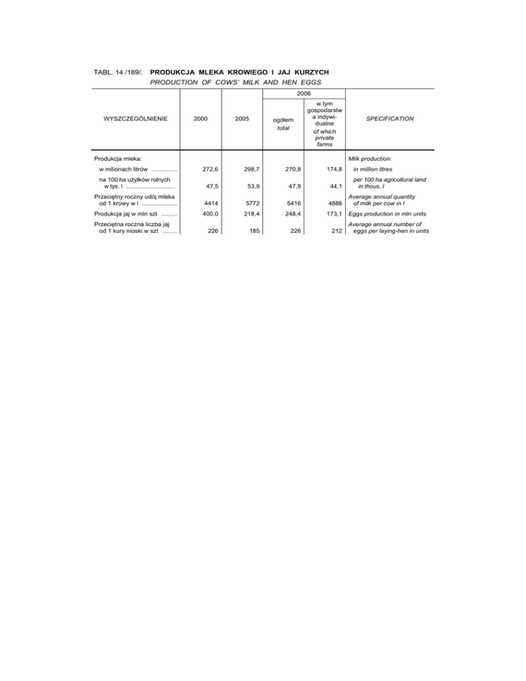TABL. 14 /189/. PRODUKCJA MLEKA KROWIEGO I JAJ KURZYCH