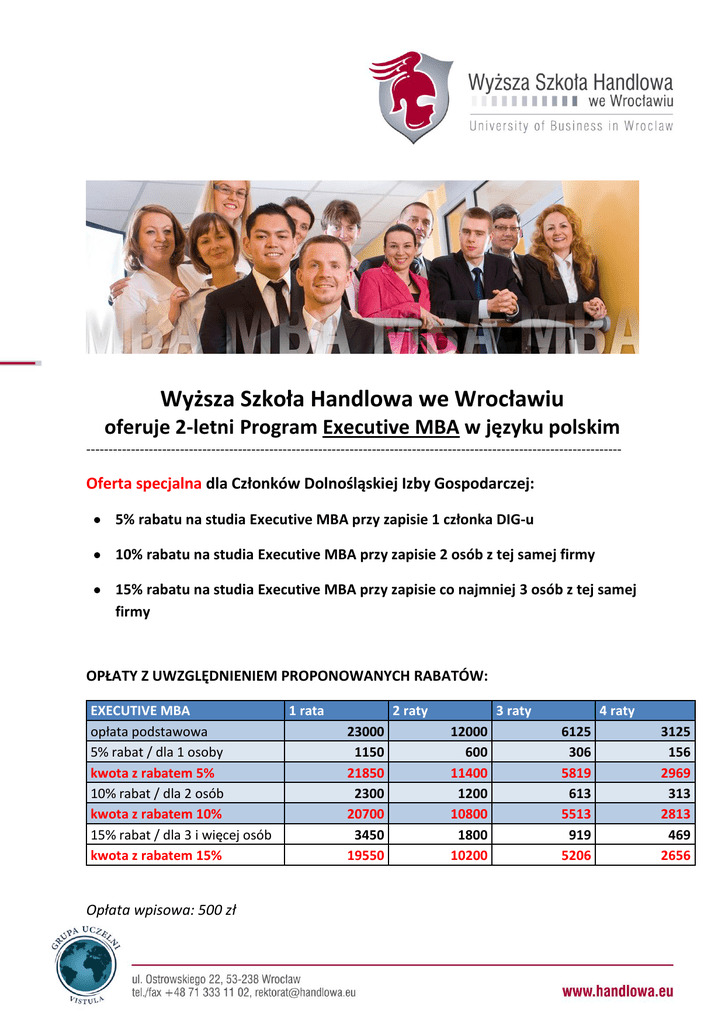 Wyższa Szkoła Handlowa we Wrocławiu oferuje 2-letni Program Executive MBA w języku polskim ------------------------------------------------------------------------------------------------------------------------ Oferta specjalna dla Członków Dolnośląskiej Izby Gospodarczej: 5% rabatu na studia Executive MBA przy zapisie 1 członka DIG-u 10% rabatu na studia Executive MBA przy zapisie 2 osób z tej samej firmy 15% rabatu na studia Executive MBA przy zapisie co najmniej 3 osób z tej samej firmy OPŁATY Z UWZGLĘDNIENIEM PROPONOWANYCH RABATÓW: EXECUTIVE MBA opłata podstawowa 5% rabat / dla 1 osoby kwota z rabatem 5% 10% rabat / dla 2 osób kwota z rabatem 10% 15% rabat / dla 3 i więcej osób kwota z rabatem 15% Opłata wpisowa: 500 zł 1 rata 2 raty 23000 1150 21850 2300 20700 3450 19550 3 raty 12000 600 11400 1200 10800 1800 10200 4 raty 6125 306 5819 613 5513 919 5206 3125 156 2969 313 2813 469 2656 --------------------------------- Program Executive MBA -------------------------------------- Wyższa Szkoła Handlowa we Wrocławiu we współpracy z wysokiej klasy specjalistami ze świata nauki i biznesu stworzyła zupełnie unikalną ofertę najwyższej jakości programu MBA, dopasowaną do potrzeb współczesnych studentów i najlepszych standardów: Celem studiów jest usystematyzowanie i poszerzenie wiedzy biznesowej w oparciu o dzielenie się doświadczeniem, jak również zdobycie praktycznych umiejętności rozwiązywania problemów korporacyjnych w ujęciu globalnym. Program studiów obejmuje 500 godzin intensywnych i interaktywnych zajęć w formie wykładów, ćwiczeń, warsztatów, projektów, analiz przypadków biznesowych i spotkań ze znanymi liderami biznesu. Studenci otrzymują stopień magistra zarządzania oraz dyplom ukończenia podyplomowych studiów MBA. Studia realizowane są we współpracy z Wrocławskim Parkiem Przemysłowym i WSSE Invest-Park. Curriculum oparte jest na planie studiów naszego zagranicznego partnera – Leipzig Graduate School of Management – jednej z nalepszych szkół biznesu na świecie (Top 3 w Niemczech i #33 w Europie wg Financial Times European Business School Rankings 2015). Zajęcia prowadzone są przez wysoko wykwalifikowaną kadrę, która posiada specjalistyczne doświadczenie z różnych dziedzin biznesu. Duży nacisk kładzie się na pracę zespołową, przewagę praktyki nad teorią oraz holistyczne podejście do wiedzy i jej efektywnego wykorzystania w rozwiązywaniu problemów korporacji. Nasi studenci pochodzą z różnych z różnych sektorów biznesu, co przez swoją różnorodność wnosi do programu całkiem nową jakość i świeżość spojrzenia na różne aspekty biznesu. DOŁĄCZ DO NAS JUŻ DZIŚ. NIE CZEKAJ NA LEPSZE JUTRO. Stwórz swoją sieć wartościowych kontaktów zawodowych. Wyższa Szkoła Handlowa we Wrocławiu The University of Business in Wroclaw ul. Ostrowskiego 22, 53- 238 Wrocław tel. 71 333 11 11/33 [email protected] www.mba.handlowa.eu