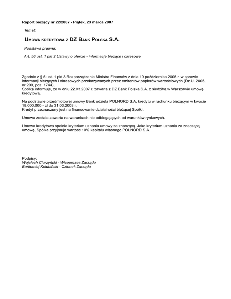 Raport bieżący nr 22/2007 - Piątek, 23 marca 2007 Temat: UMOWA KREDYTOWA Z DZ BANK POLSKA S.A. Podstawa prawna: Art. 56 ust. 1 pkt 2 Ustawy o ofercie - informacje bieżące i okresowe Zgodnie z § 5 ust. 1 pkt 3 Rozporządzenia Ministra Finansów z dnia 19 października 2005 r. w sprawie informacji bieżących i okresowych przekazywanych przez emitentów papierów wartościowych (Dz.U. 2005, nr 209, poz. 1744), Spółka informuje, że w dniu 22.03.2007 r. zawarła z DZ Bank Polska S.A. z siedzibą w Warszawie umowę kredytową. Na podstawie przedmiotowej umowy Bank udziela POLNORD S.A. kredytu w rachunku bieżącym w kwocie 18.000.000,- zł do 31.03.2008 r. Kredyt przeznaczony jest na finansowanie działalności bieżącej Spółki. Umowa została zawarta na warunkach nie odbiegających od warunków rynkowych. Umowa kredytowa spełnia kryterium uznania umowy za znaczącą. Jako kryterium uznania za znaczącą umowę, Spółka przyjmuje wartość 10% kapitału własnego POLNORD S.A. Podpisy: Wojciech Ciurzyński - Wiceprezes Zarządu Bartłomiej Kolubiński - Członek Zarządu